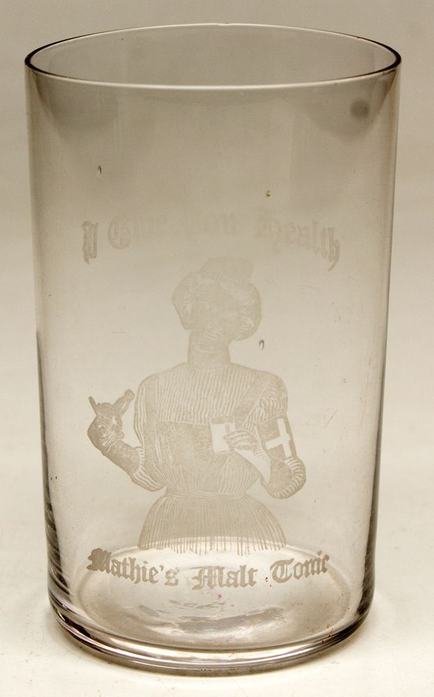 A little over 3". Etched. "I Give You Healthy / Mathie's Malt Tonic." Picture of female nurse offering you the ale. 1834-1856 Main Street, Los Angeles, California. Burt Collection