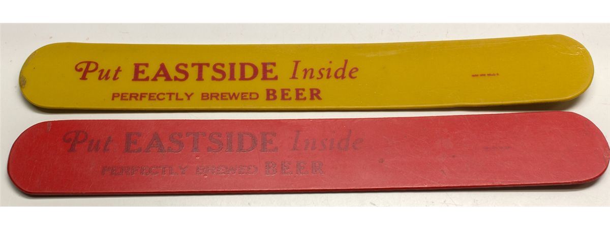 Two 8" long beer foam scrapers, one red, one yellow. Text: "Put EASTSIDE Inside. Perfectly Brewed Beer." Depression-Era. Kirk Mpg. Co. Eastside Beer was started in 1907 by George Zobelein after he bought Los Angeles Brewing Co. Minimal wear. Burt Collection