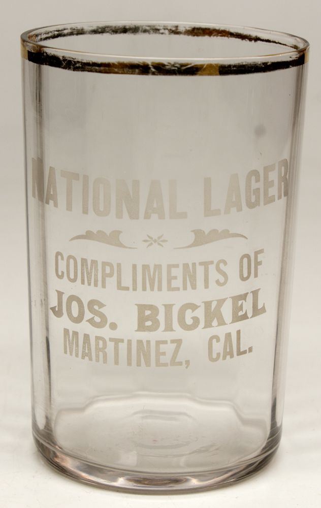 Only one known! Unusual 16-sided. 3 1/2". Gold trimmed. "National Lager / Compliments of / Jos. Bickel / Martinez, Cal." Burt Collection