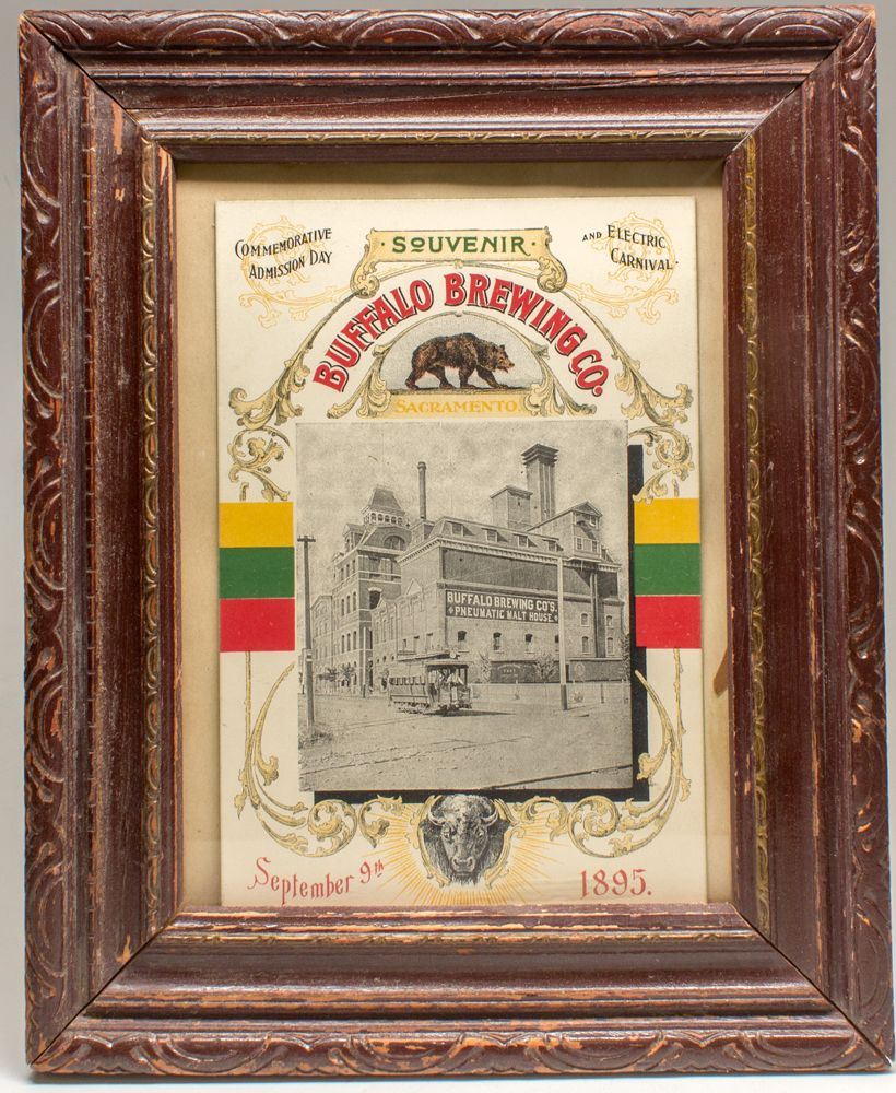 Given that Buffalo started in 1890, this is a very early piece! Souvenir lithograph printed on cardstock. "Commemorative Admission Day and Electric Carnival." Has three great vignettes: a California bear (top), image of the brewery with trolley (center), and buffalo head (bottom). Carnival took place on September 9th, 1895. Measures 5" x 7.5" in 8.5" x 10.5" frame. The carnival was to celebrate the introduction of electricity into Sacramento from Folsom. It happened one night during the State Fair. From a Sacramento Daily Union article on the same day: "That it will be a brilliant affair there is no doubt, and the many thousands of visitors will witness a pageant the like of which man has never yet seenwherein electricity is the power that propels and illuminates the beautiful floats, and at the same time illuminates the city. The distinction of being the pioneer in that line belongs to the Capital City, and it is one of which her people are justly proud." Burt Collection