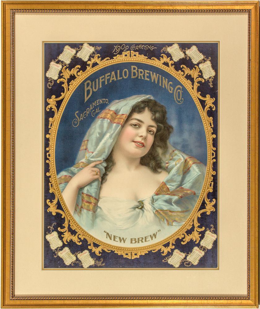Fabulous, early piece! "1902 Greeting./ Buffalo Brewing Co./ Sacramento, Cal./ New Brew" Centered is an oval portrait of a voluptuous brunette gypsy wearing a shawl. A golden border surrounds her. Miniature calendar months are scattered across the top and bottom. Gold lettering with a blue background. "From Photo. Copyright by Schloss, 1900." Framed and matted. Broadside measures 17" x 22" in a 24 1/2" x 30" frame. Jacob Schloss (1856-1938) was a New York photographer who specialized in female portraits, especially of performers. He became known in the 1890s as being a photographer of beautiful women. He was an early pioneer in copyrighting his images for use in magazines and periodicals; he sued anyone who tried to use his photographs without permission. He utilized diffused and shadowed natural lighting, but later preferred electric light illumination. The identity of the performer Schloss photographed for this broadside is a mystery. Burt Collection [Ref:http://broadway.cas.sc.edu/content/jacob-schloss]