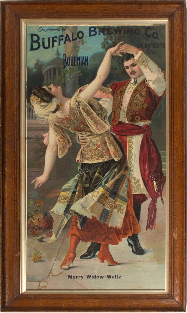 Gorgeous colors on this broadside that shows a well-dressed couple dancing. "Compliments of Buffalo Brewing Co./ Sacramento, Cal." At the bottom: "Merry Widow Waltz." Broadside: 23" x 11" in a 26.5" x 15" frame. Burt Collection