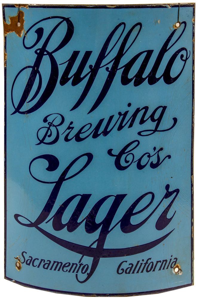 Imagine the thousands of tired workers who walked past this enamel sign, its light and dark blues catching their eyes, drawing them into the establishment where they ordered an ice-cold glass of Buffalo Lager. A light blue background and dark blue text. Pieces of enamel are missing. Small areas of rust present. Measures approx. 20" x 13." Burt Collection