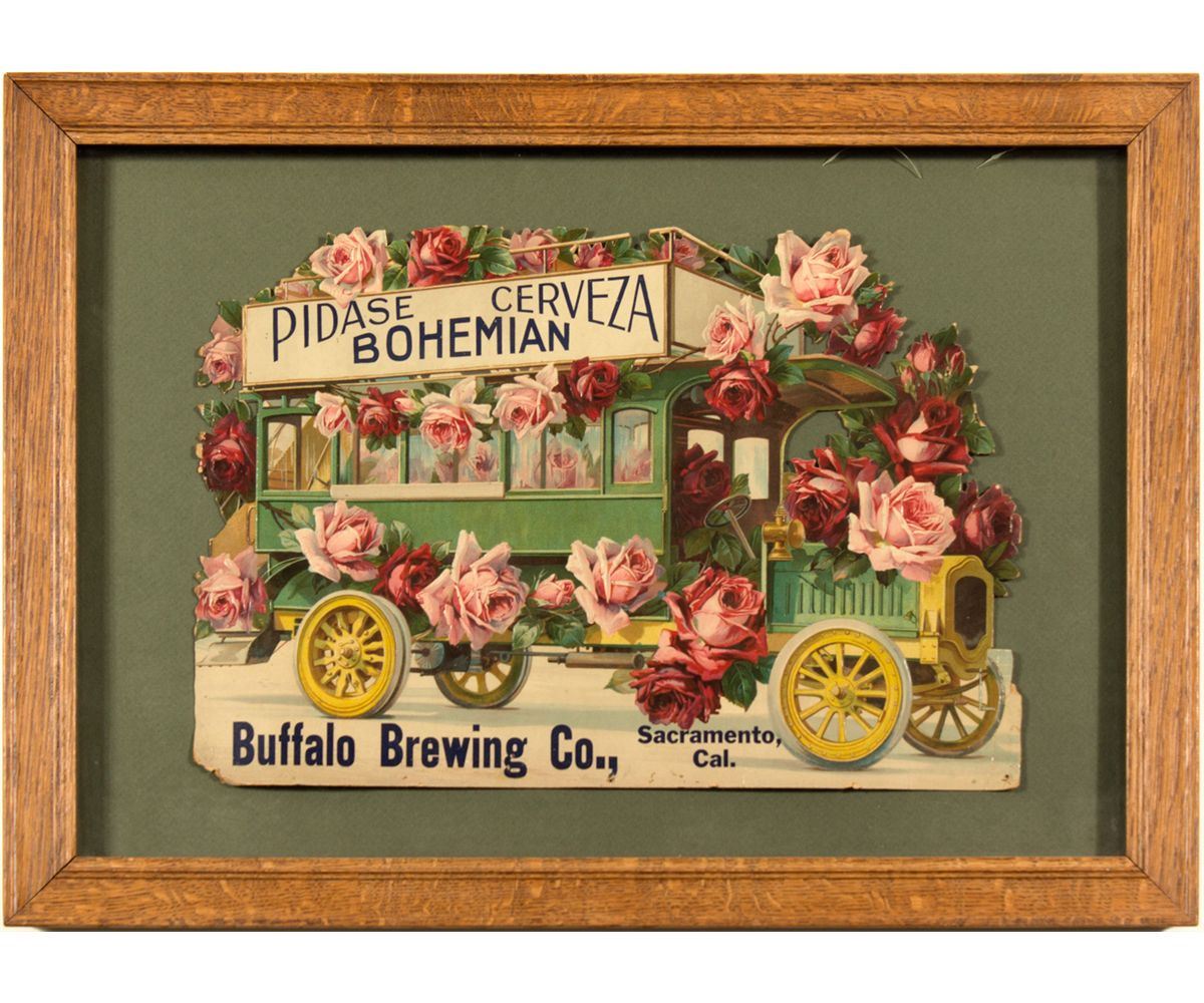 The only piece of California brewery advertising with Spanish! The company did work in South America. Blue text on the die cut advertises for the Bohemian variety. The die cut is in the shape of a old-fashioned bus, green with gold rims. Pink and red roses are blooming all over it. Die cut measures 17' x 12" in a 24 1/2" x 17 1/2" frame. Burt Collection