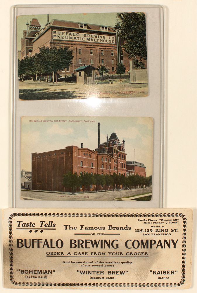 Lot of three items. 1) Buffalo Brewing Company advertising card. "Order a Case from Your Grocer/ And be convinced of the excellent quality of our several brews." Measures 8" x 3.5" Soiling and a bent lower right corner. 2) Two early, unused color postcards, Two different views of the brewery facility on 21st Street in Sacramento. One is by Newman and the other is Kropp.