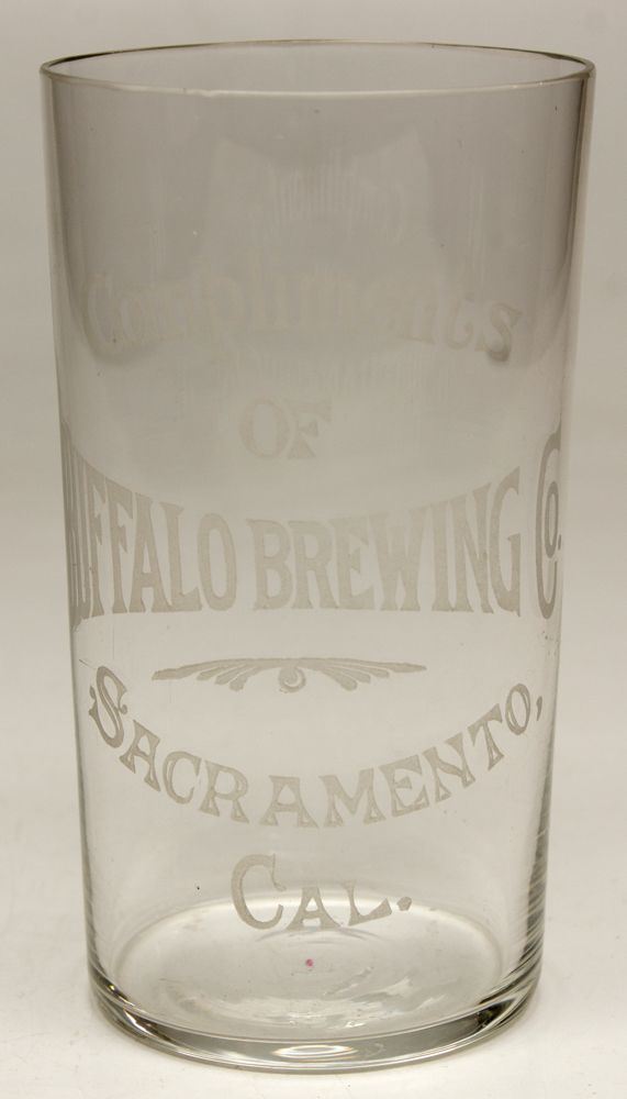 Etched. 4". "Compliments of Buffalo Brewery / Sacramento, Cal." Small scroll work. Burt Collection