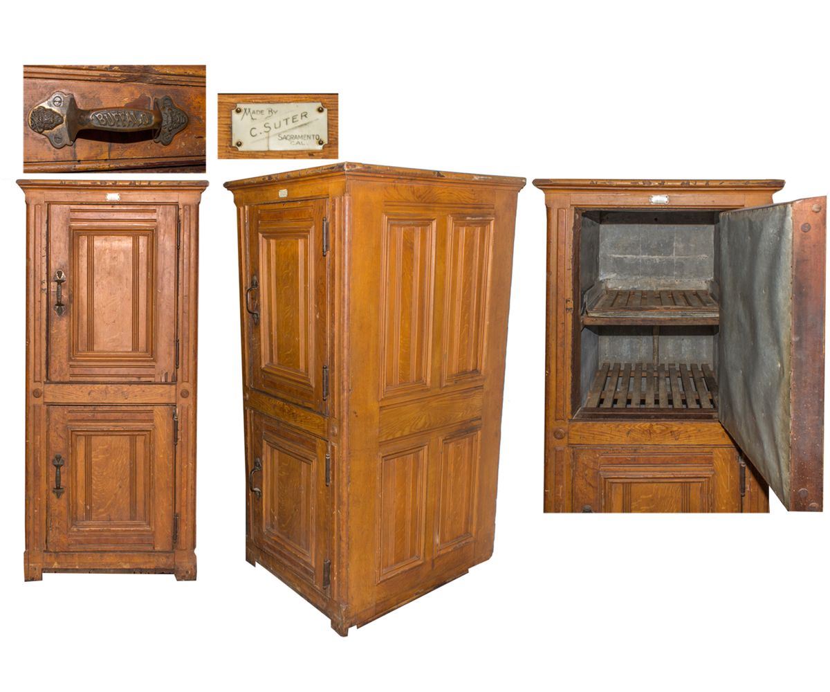 One of Tom's favorite pieces! He traded a Eagle Brewing "Old Joe's" porcelain sign w/ eagle for this.This ice box still has the original Buffalo handles, which Tom has never seen before. Also has the maker's cellulite plaque: "Made by C. Suter, Sacramento, Cal." Measures 64" x 35" x 28" Condition: some scuffs, chips. The bottom door is off one of its hinges. Very impressive piece!