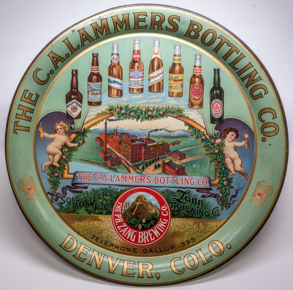 Desirable views of the brewery and the bottles! Round. Green background with gold lettering. Around the rim: "The C.A. Lammers Bottling Co./ Denver, Colo." Center of plate: vignette of brewery with angelic children on either side holding bottles. Above the brewery are bottles of eight different varieties. "Sole Bottlers for the Lang Brewing Co." Minor scuffs and scratches. 13" diameter. Burt Collection