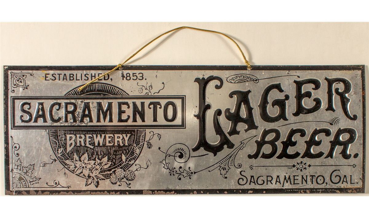 c.1890s. Very rare early piece! Silver background and black lettering. "Sacramento" and "Lager Beer" are raised letters. Floral borders (hops and barley). Established 1853. Measures 13.75" x 5." Excellent condition for its age: chips to paint and small areas of rust. What 19th-century business hung this sign to convince thirsty workers to go for a lager? The Sacramento Brewery was founded in 1853 by Philip Scheld, a man with experience in retail and liquor. Philip wanted to return to Europe, and needed a partner he could trust. He found that partner with John Ochswald. Scheld was also the director of the Sacramento Savings Bank. Burt Collection