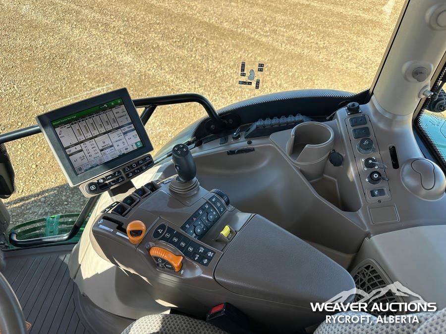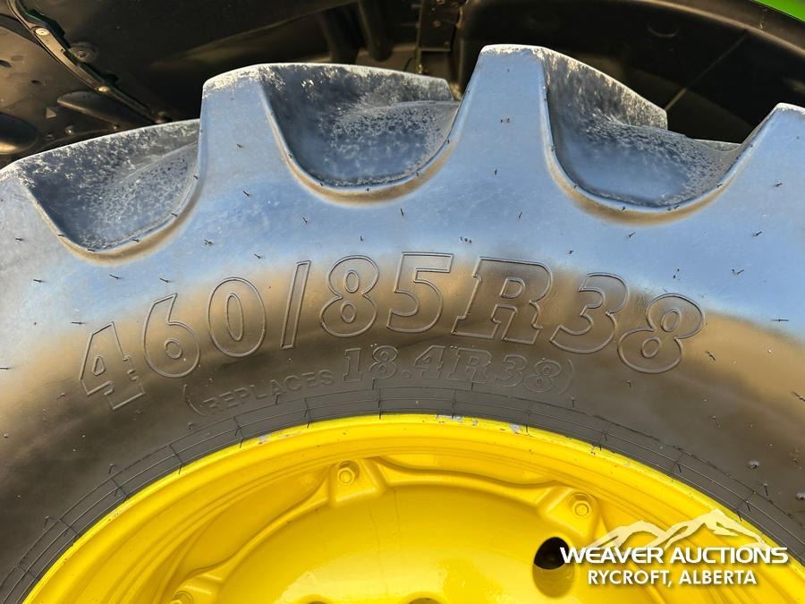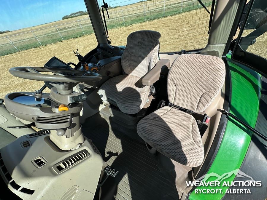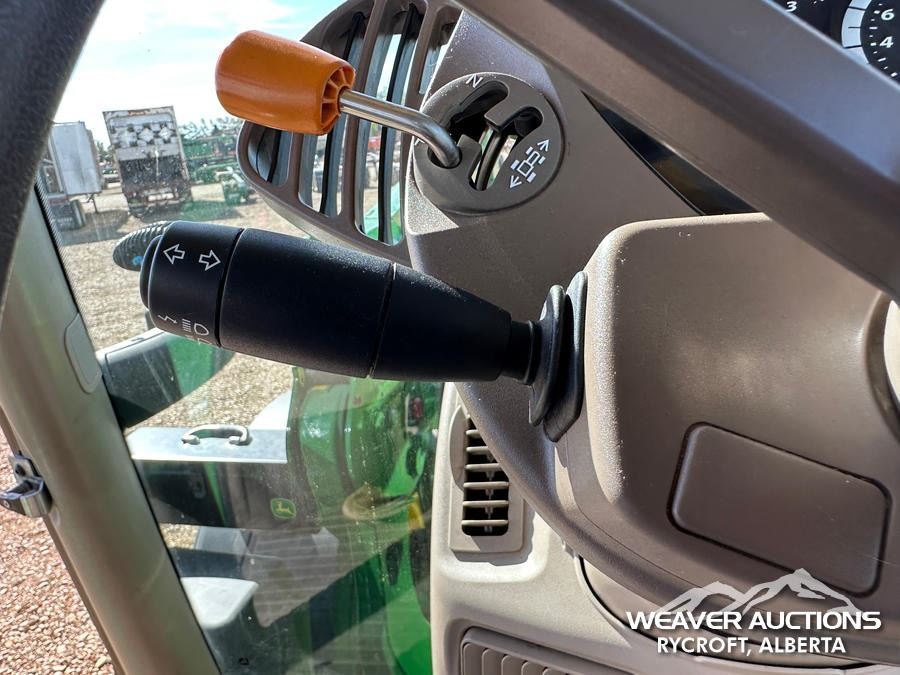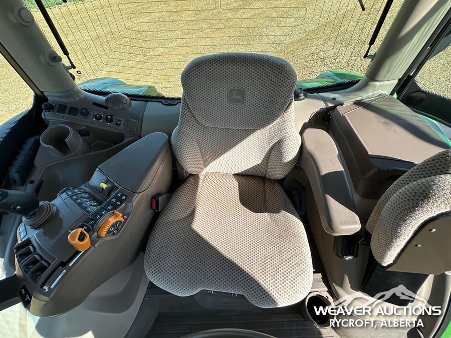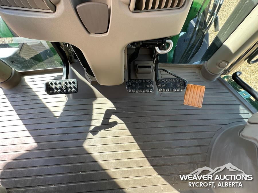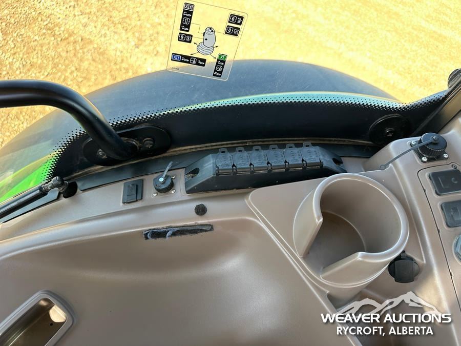 Specifications: C/W JOHN DEERE 640R FRONT END LOADER AND GRAPPLE, IVT TRANSMISSION, PREMIUM CAB, LEFT HAND REVERSER, 4 ELETRONIC REAR SCV'S, 540/1000 PTO, 3PT HITCH WITH FENDER REMOTES, A/C, ELETRIC LOADER JOYSTICK, SUNROOF, ELECTRIC POWER MIRRORS, FRONT AND REAR SUN SHADES, INSTRUCTOR SEAT, 460/8 R38 BKT REAR TIRES, 420/ 85R24 BKT FRONT TIRES