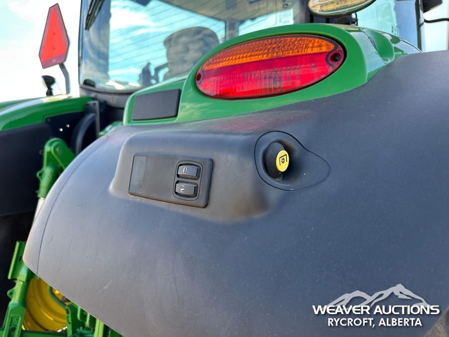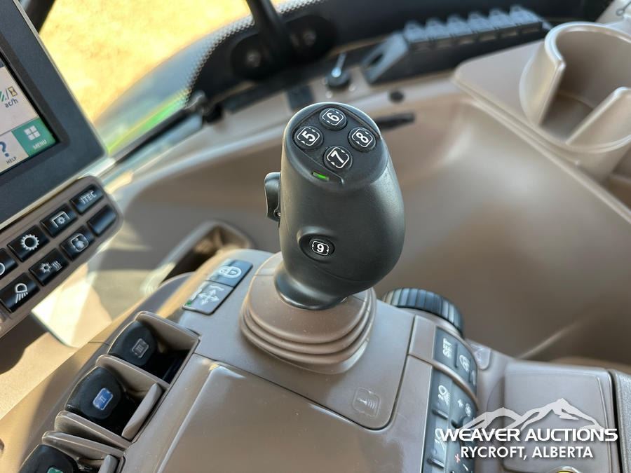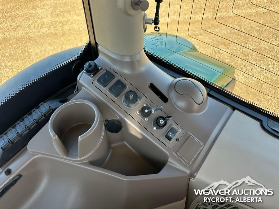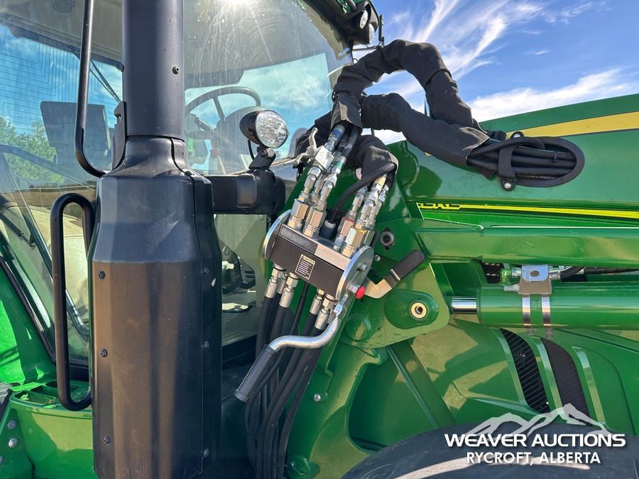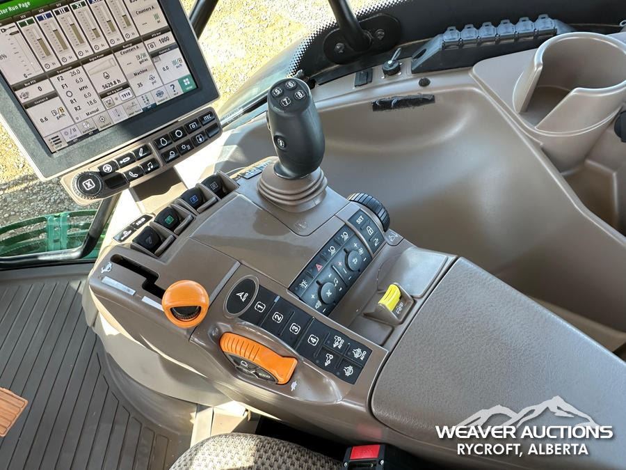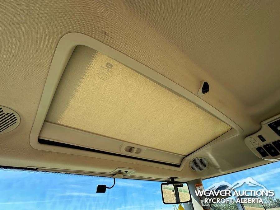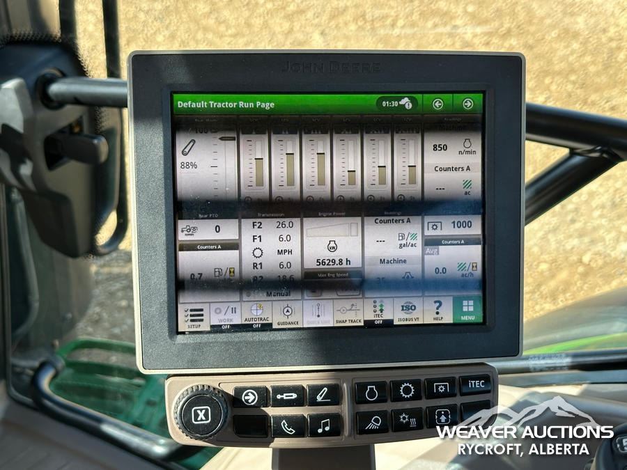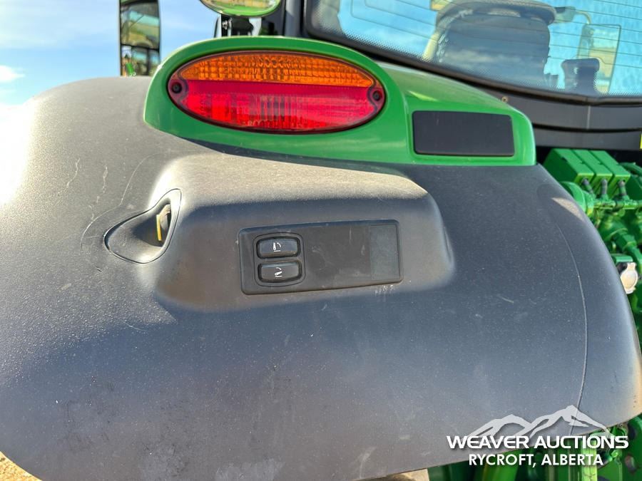 Specifications: C/W JOHN DEERE 640R FRONT END LOADER AND GRAPPLE, IVT TRANSMISSION, PREMIUM CAB, LEFT HAND REVERSER, 4 ELETRONIC REAR SCV'S, 540/1000 PTO, 3PT HITCH WITH FENDER REMOTES, A/C, ELETRIC LOADER JOYSTICK, SUNROOF, ELECTRIC POWER MIRRORS, FRONT AND REAR SUN SHADES, INSTRUCTOR SEAT, 460/8 R38 BKT REAR TIRES, 420/ 85R24 BKT FRONT TIRES
