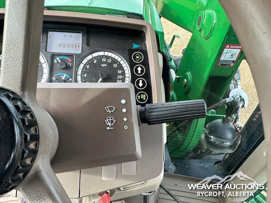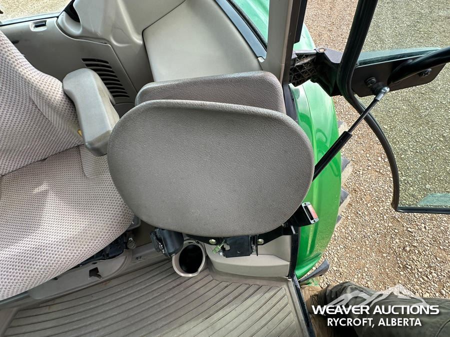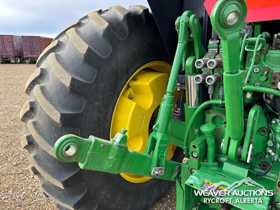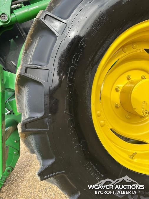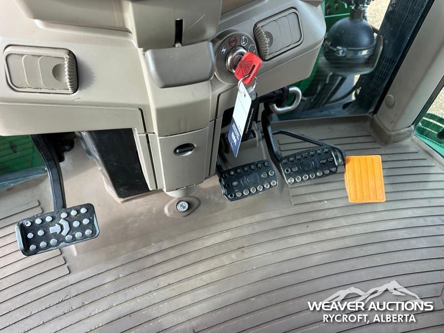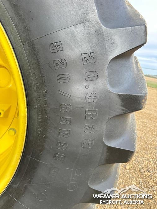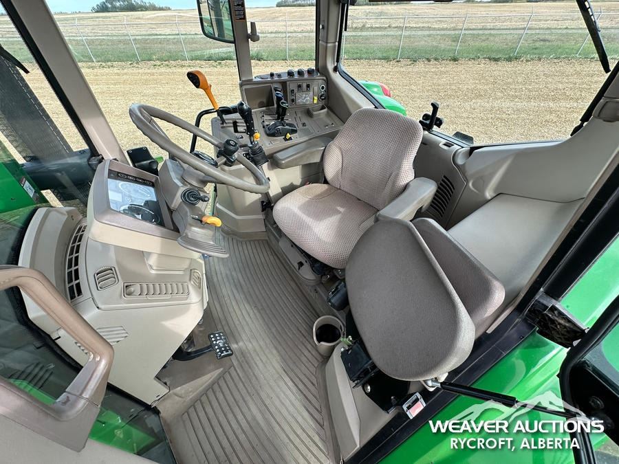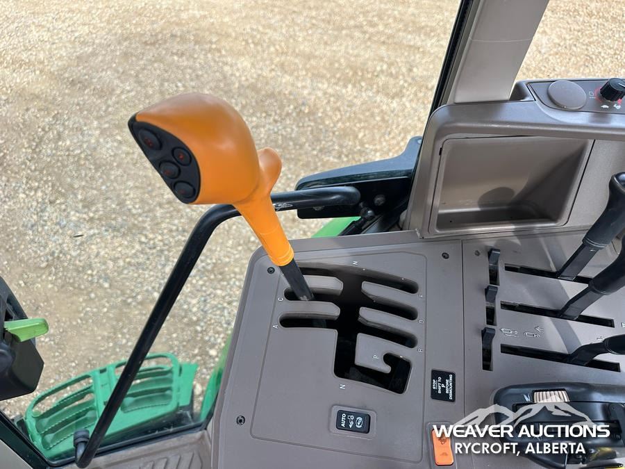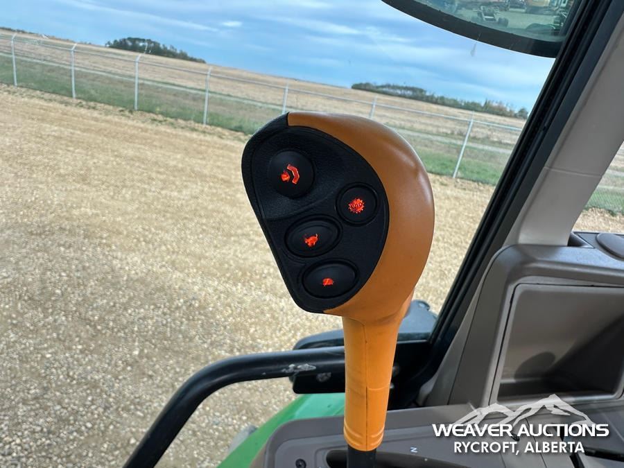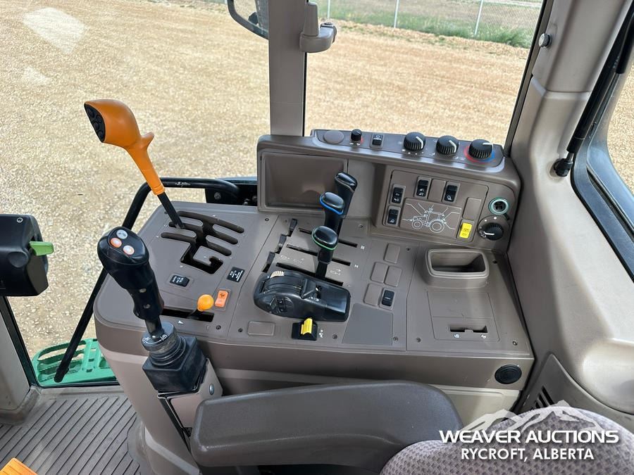 Specifications: 24 SPEED AUTO QUAD TRANSMISSION, STANDARD CAB, RIGHT HAND CONSOL, 3PT HITCH, LEFT HAND REVERSER, 540/1000 PTO, SUNROOF, PRE DEF, INSIDE REAR WEIGHT PACKAGE, 520/85R38 REAR FIRESTONE TIRES, 420/85R28 FIRESTONE FRONT TIRES, BAR AXLE, REMOTE FENDER CONTROLS FOR 3 POINT AND PTO, MANUAL LOADER JOYSTICK, C/W H360 LOADER BUCKET GRAPPLE, JD QUICK ATTACH