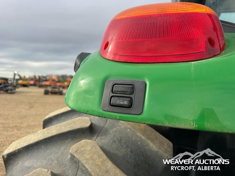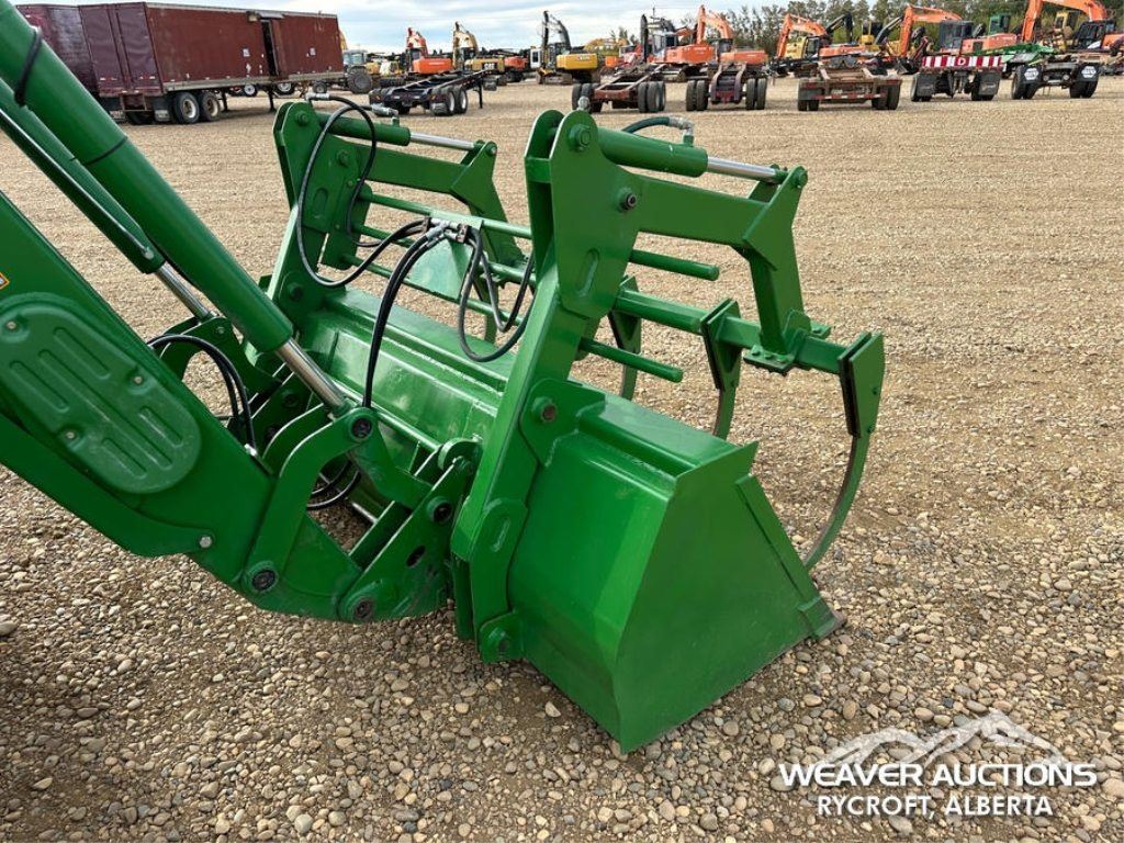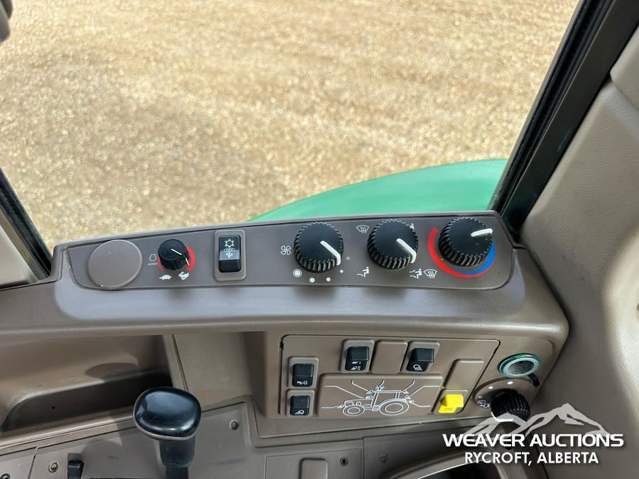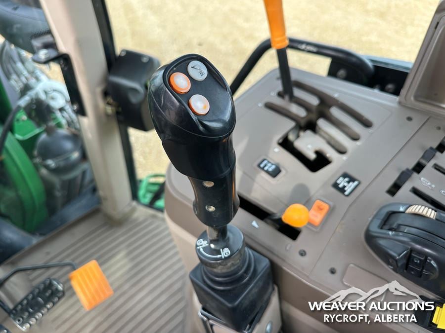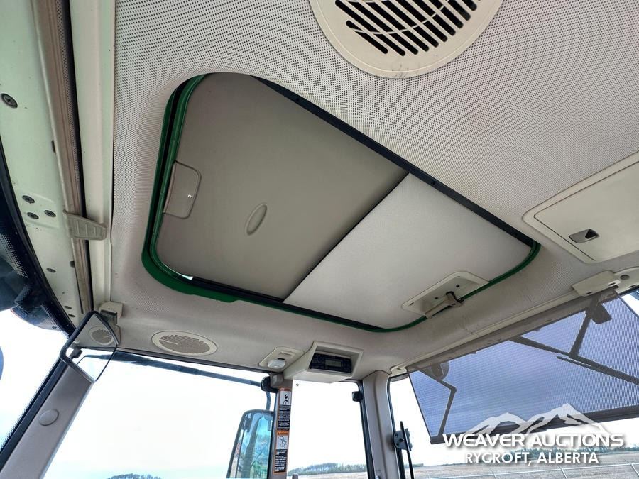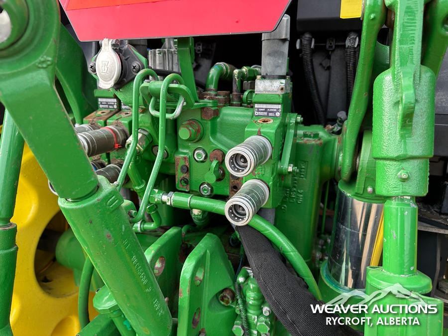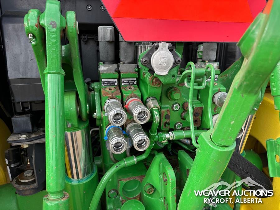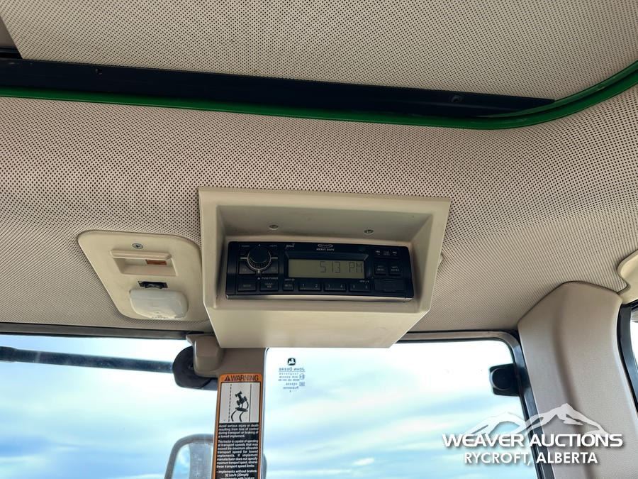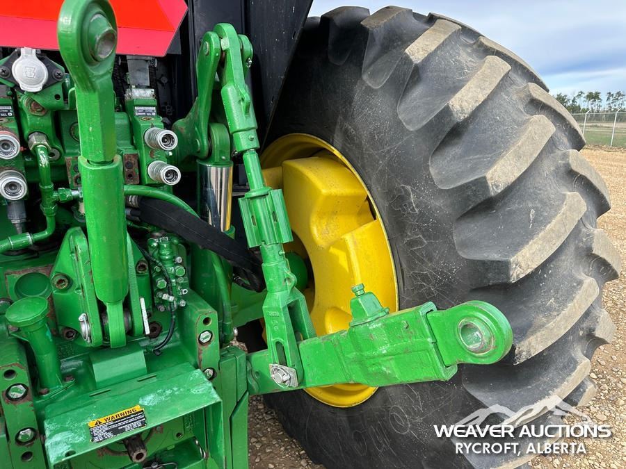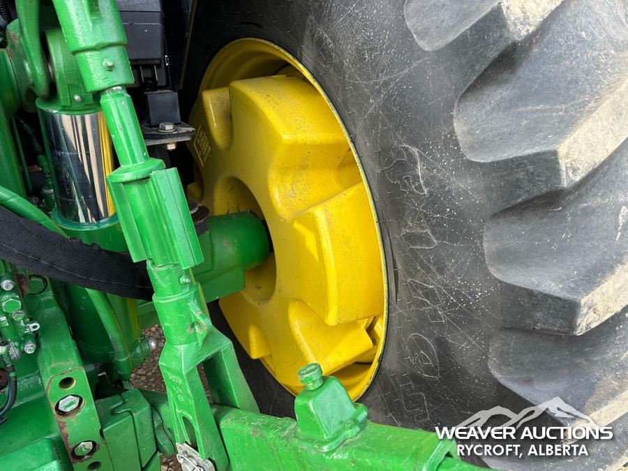 Specifications: 24 SPEED AUTO QUAD TRANSMISSION, STANDARD CAB, RIGHT HAND CONSOL, 3PT HITCH, LEFT HAND REVERSER, 540/1000 PTO, SUNROOF, PRE DEF, INSIDE REAR WEIGHT PACKAGE, 520/85R38 REAR FIRESTONE TIRES, 420/85R28 FIRESTONE FRONT TIRES, BAR AXLE, REMOTE FENDER CONTROLS FOR 3 POINT AND PTO, MANUAL LOADER JOYSTICK, C/W H360 LOADER BUCKET GRAPPLE, JD QUICK ATTACH