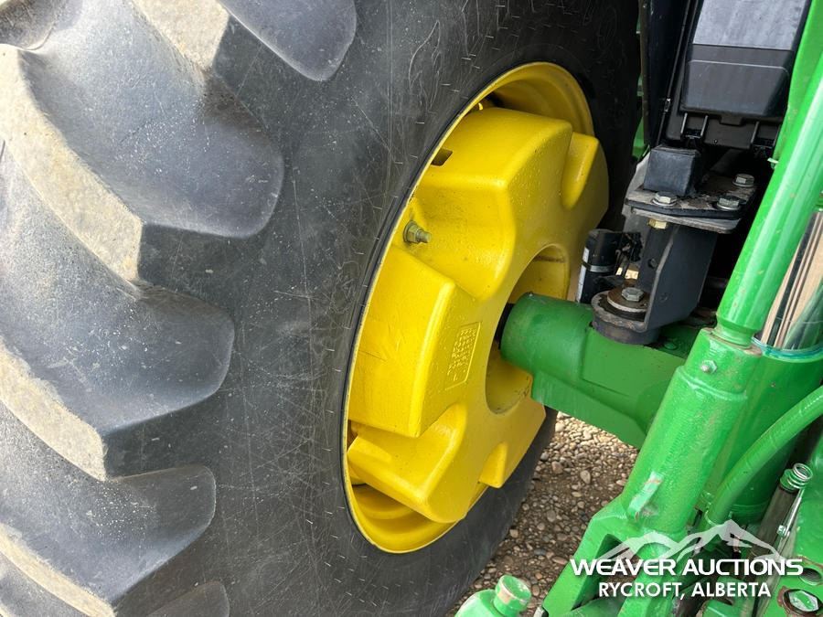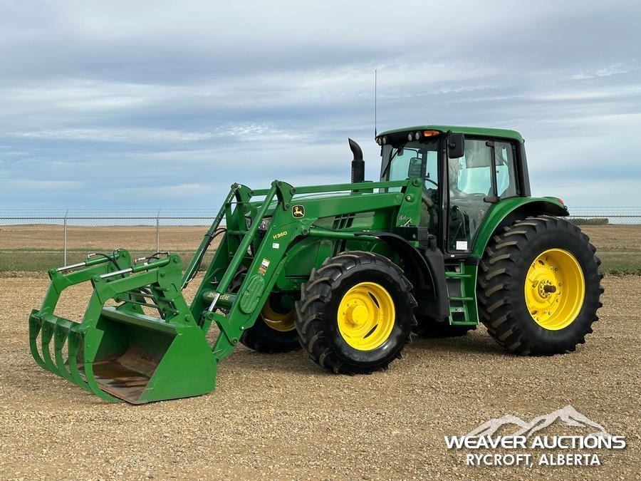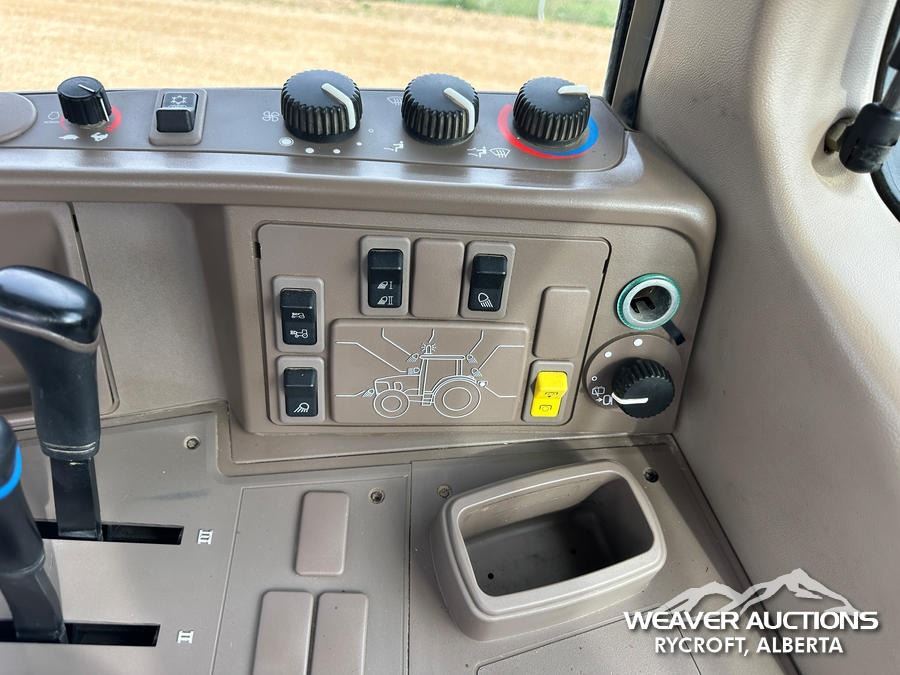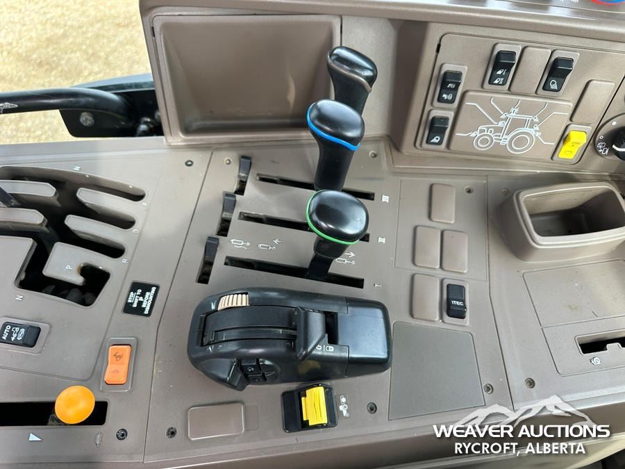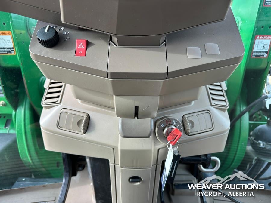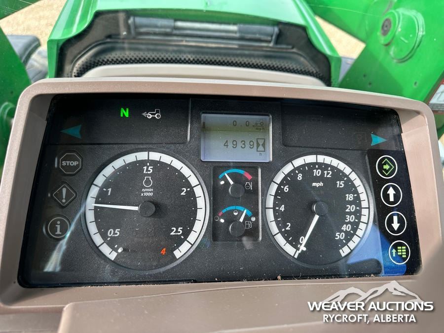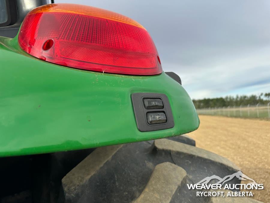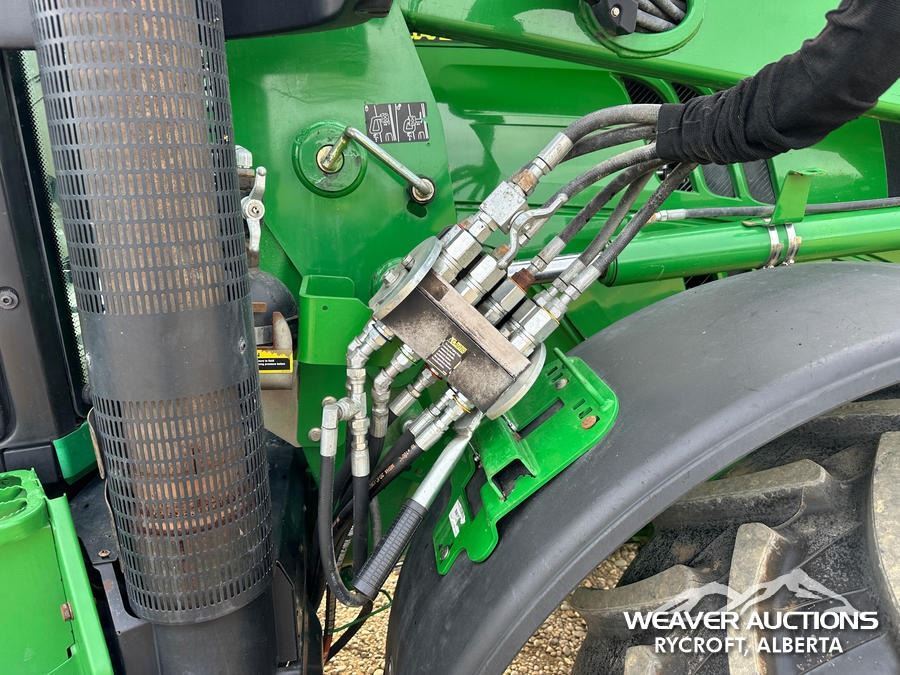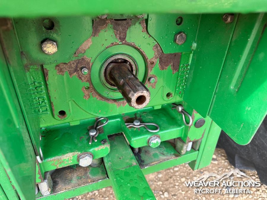 Specifications: 24 SPEED AUTO QUAD TRANSMISSION, STANDARD CAB, RIGHT HAND CONSOL, 3PT HITCH, LEFT HAND REVERSER, 540/1000 PTO, SUNROOF, PRE DEF, INSIDE REAR WEIGHT PACKAGE, 520/85R38 REAR FIRESTONE TIRES, 420/85R28 FIRESTONE FRONT TIRES, BAR AXLE, REMOTE FENDER CONTROLS FOR 3 POINT AND PTO, MANUAL LOADER JOYSTICK, C/W H360 LOADER BUCKET GRAPPLE, JD QUICK ATTACH