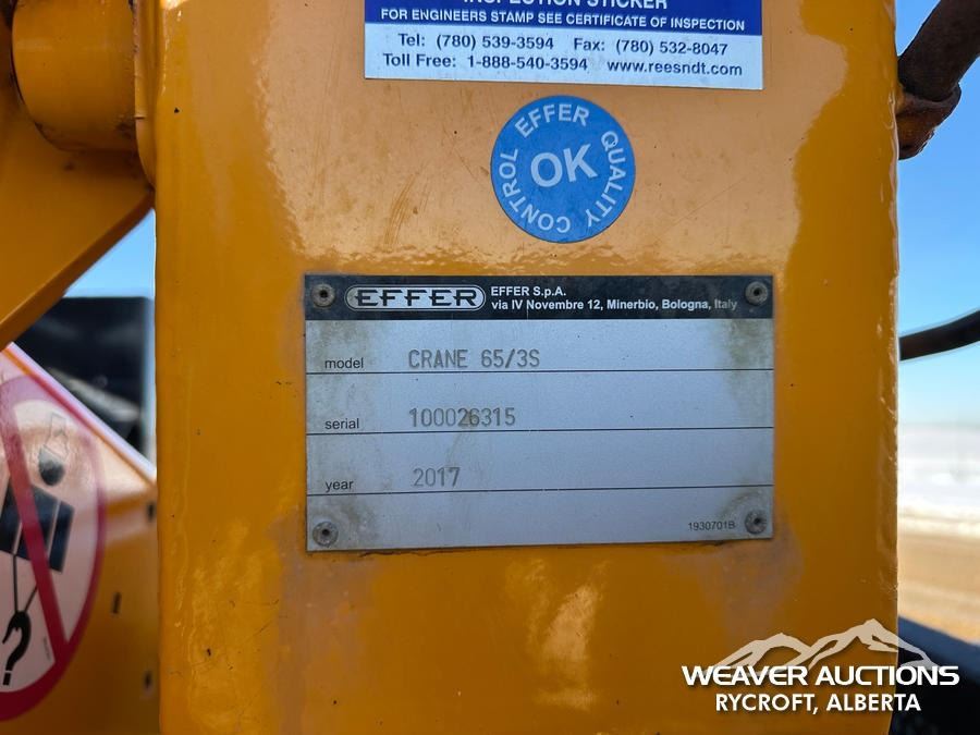 Specifications: V8 6.7 L DIESEL ENGINE, POSITIVE AIR SHUTOFF, EXHAUST BRAKE, AUTOMATIC TRANSMISSION, 7000 LB FRONT AXLE, 14706 LB REARS, ALUMINUM WHEELS, 225/70R19.5, SPRING SUSPENSION, PTO, CENTER MOUNTED, 2017 EFFER 65/3S KNUCKLE BOOM, DUAL CONTROLS, OUT AND DOWN OUTRIGGERS