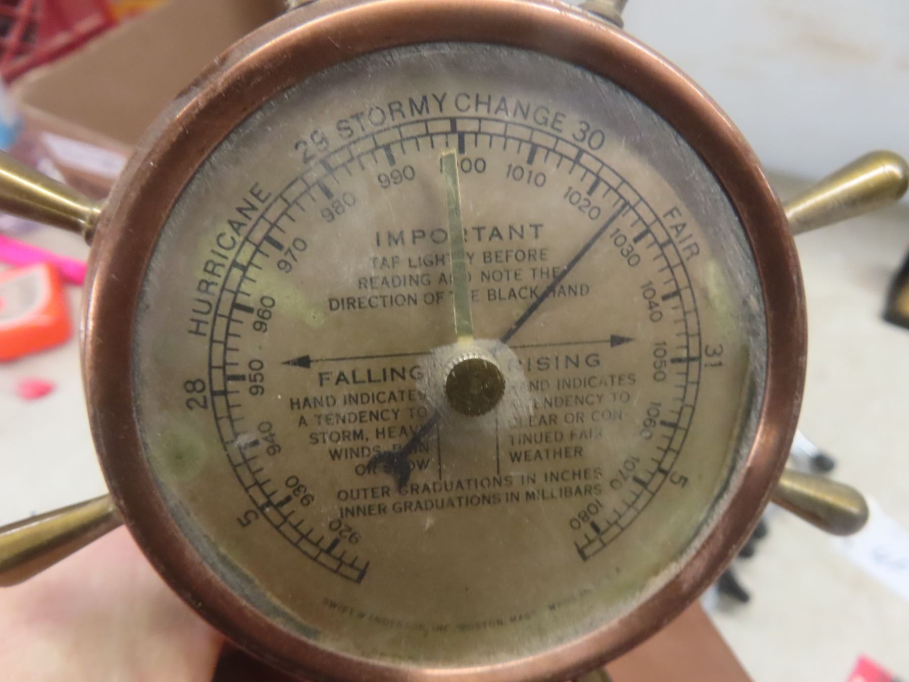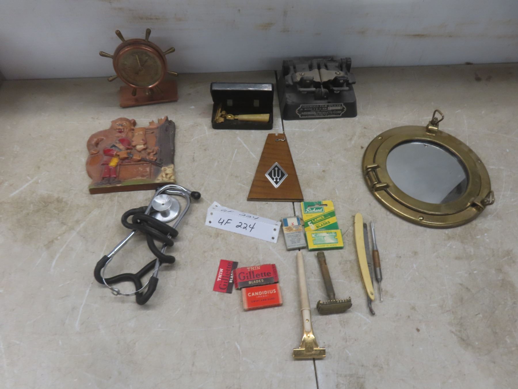 Vintage Swift and Anderson Ships Wheel Barometer Brass Porthole Mirrors Griswold Film Slicer Stethoscope Razors and More