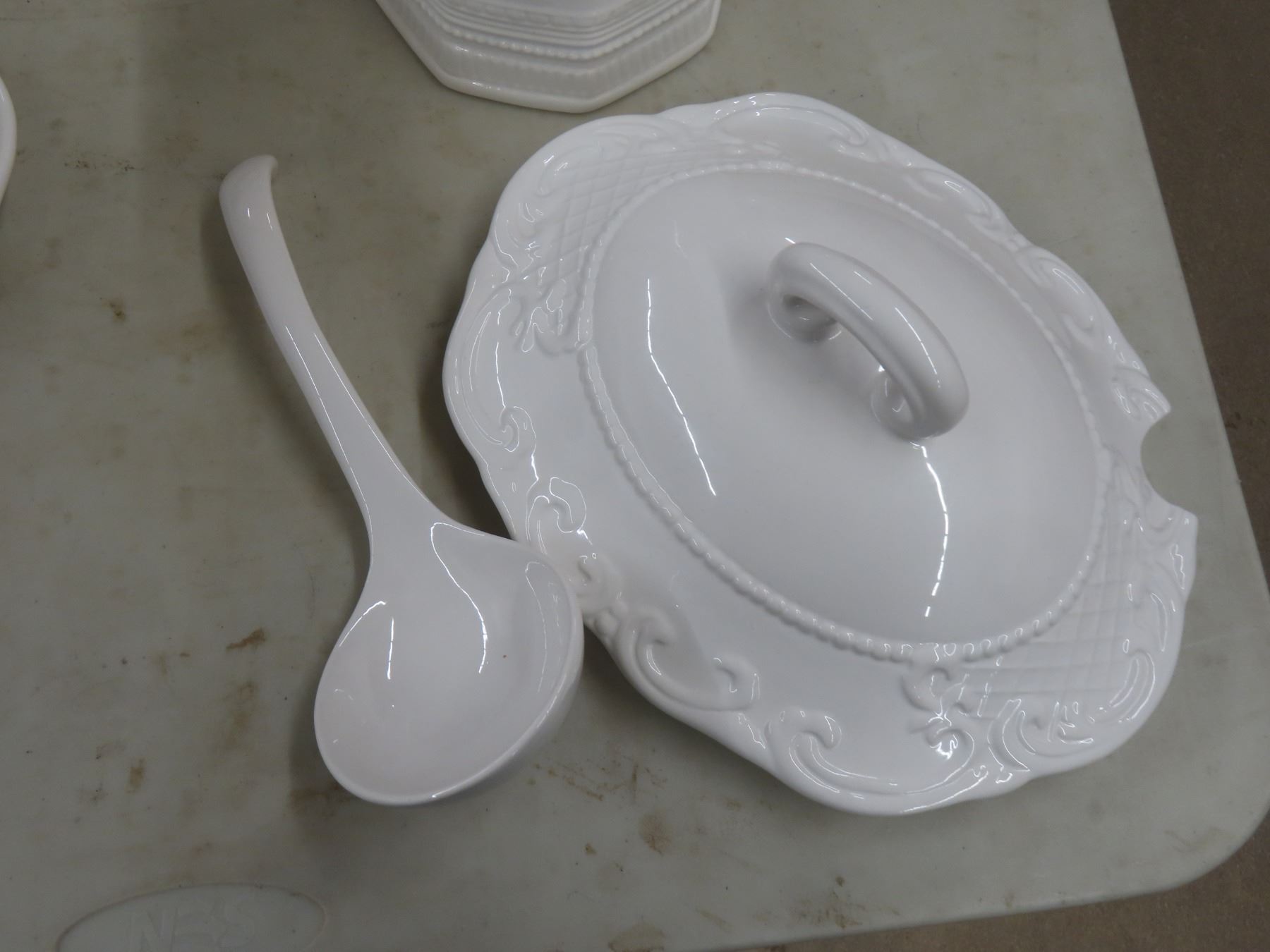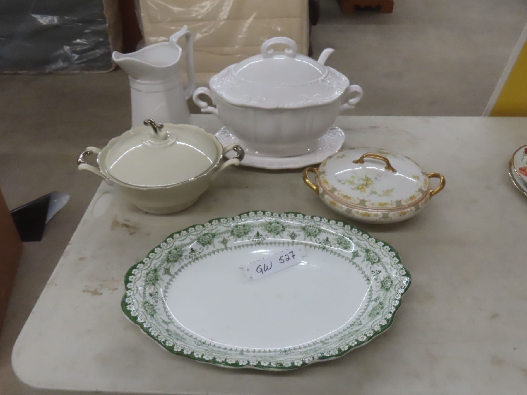 Lot 527 Soup Tureen With Drip Plate and Ladle, Pitcher, Serving Plates, and 2 Covered Serving Dishes