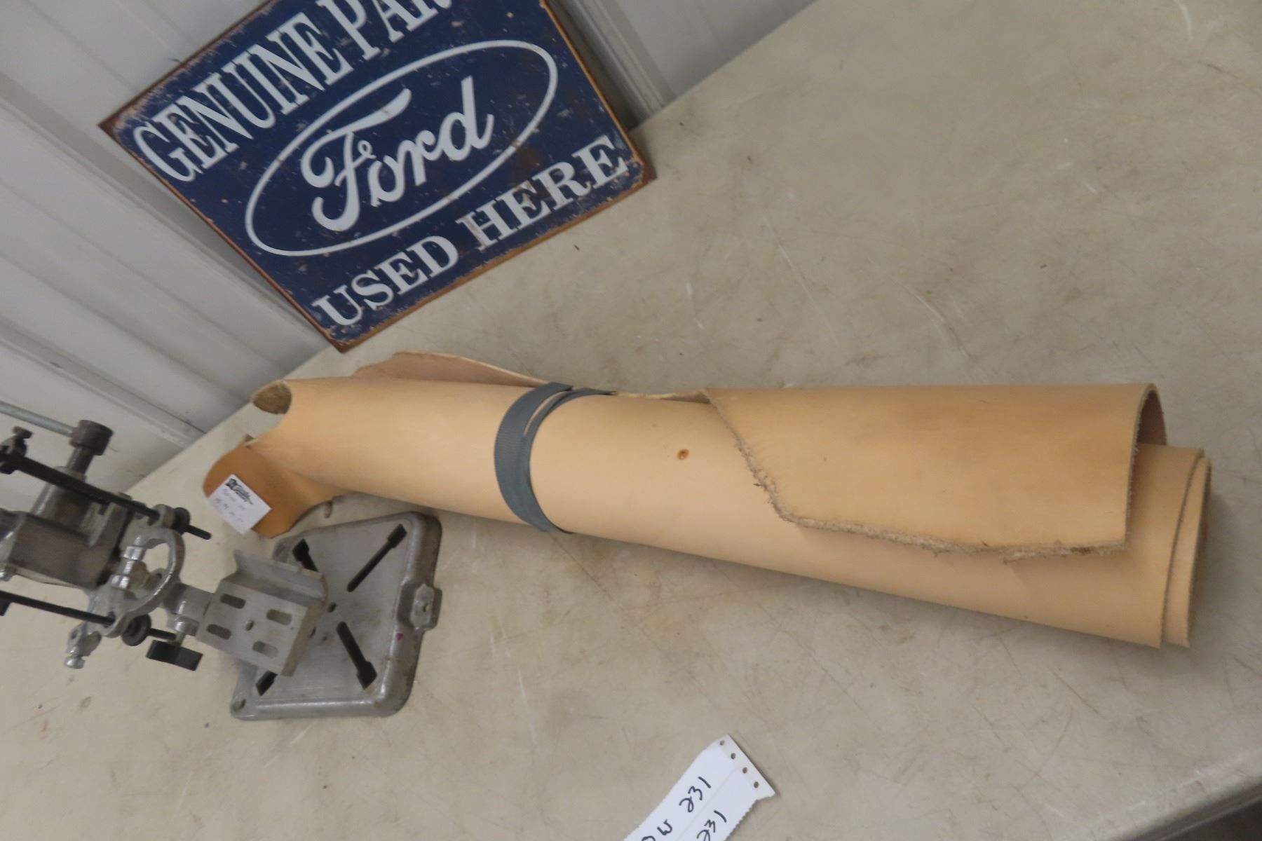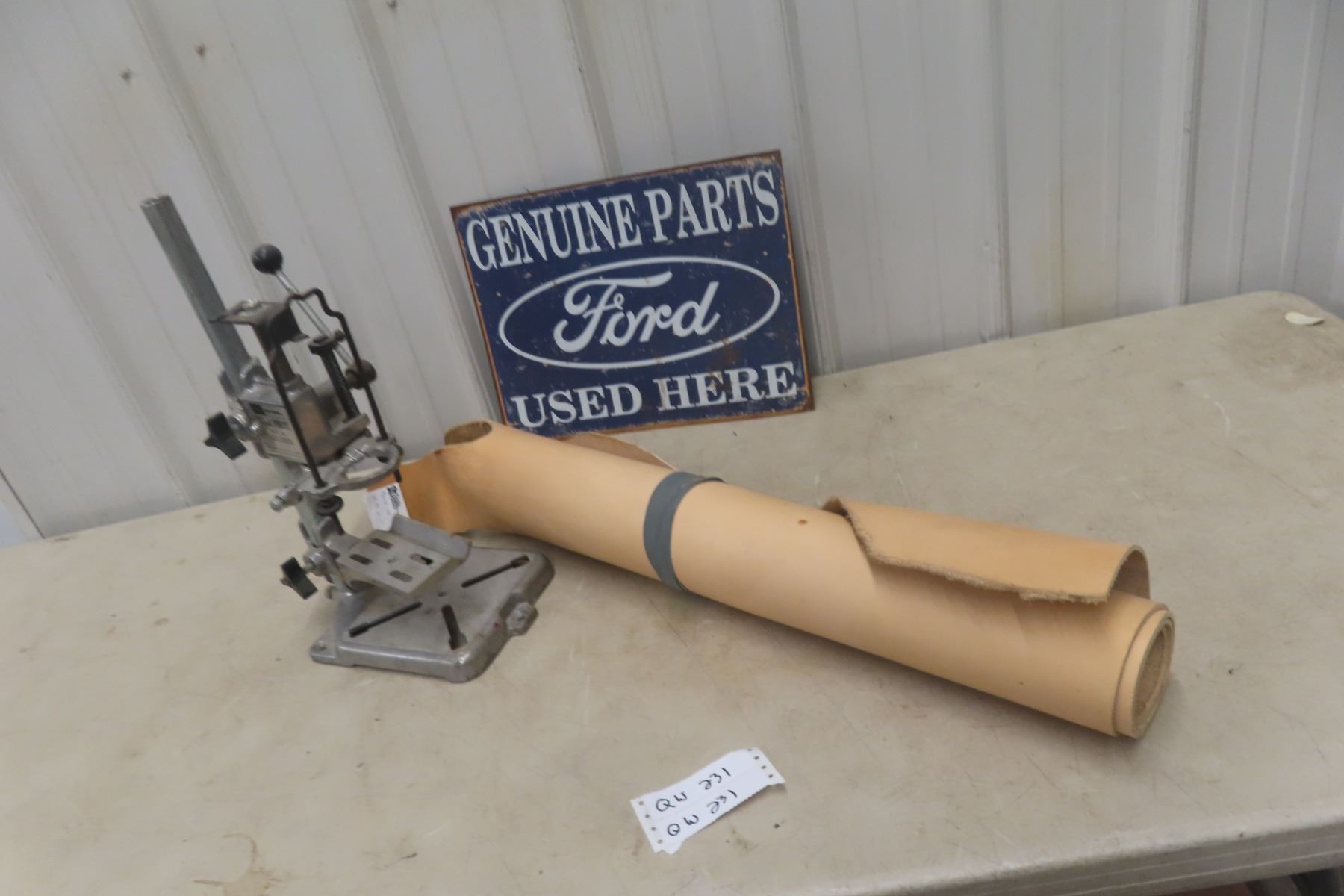 Lot 231 Craftsman Press for a Drill, Modern Ford Sign, and Roll of Leather