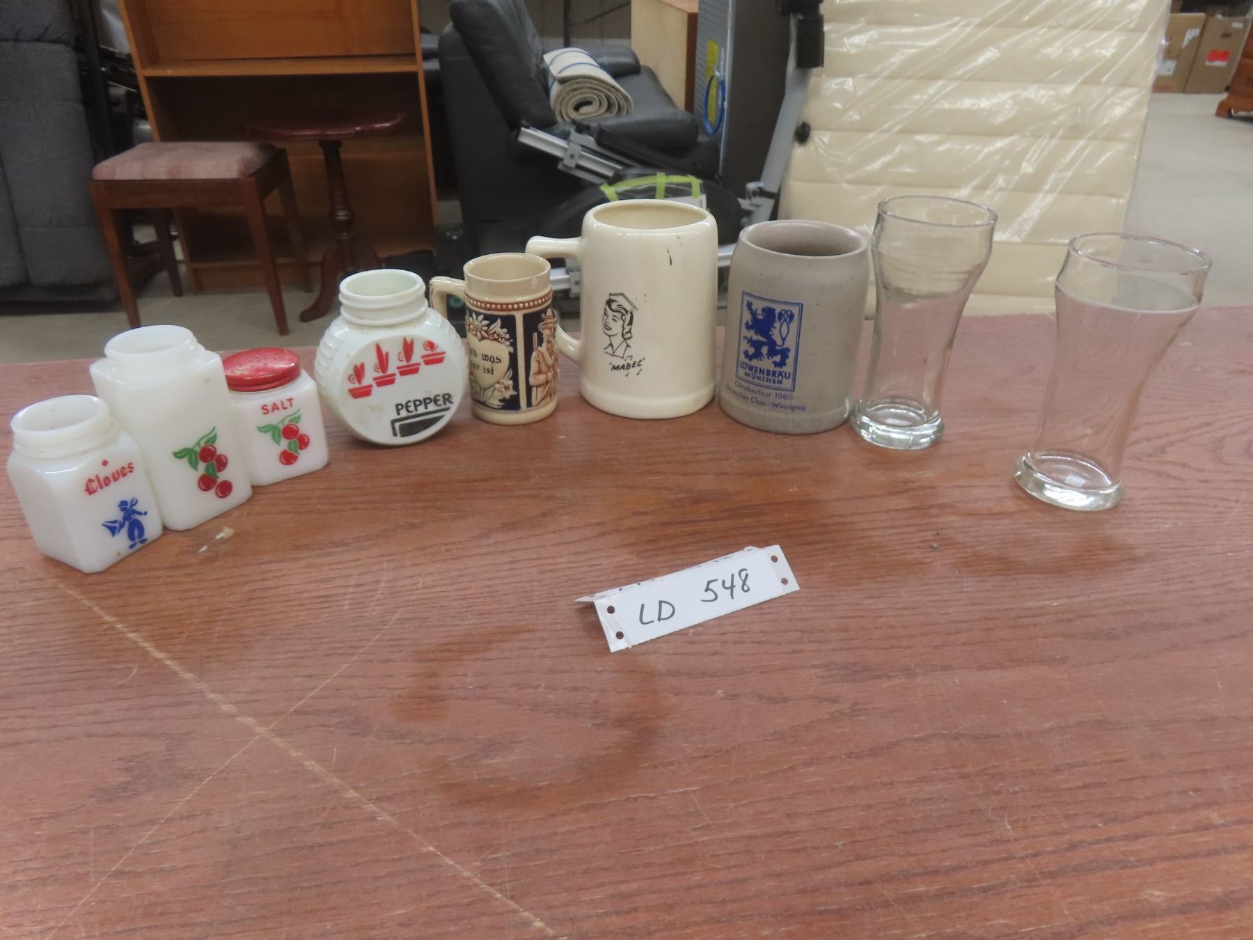 Lot 548 Beer Glasses and Steins With 4 Milk Glass Spice Jars (Missing Lids)