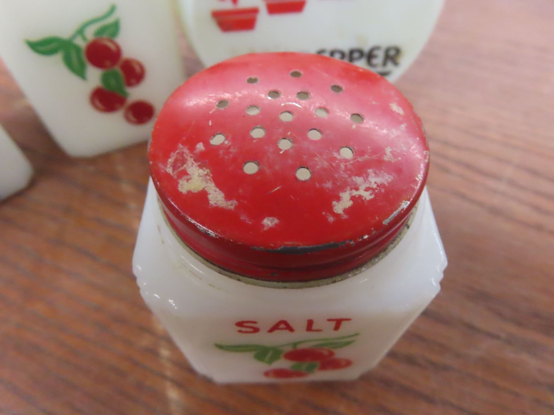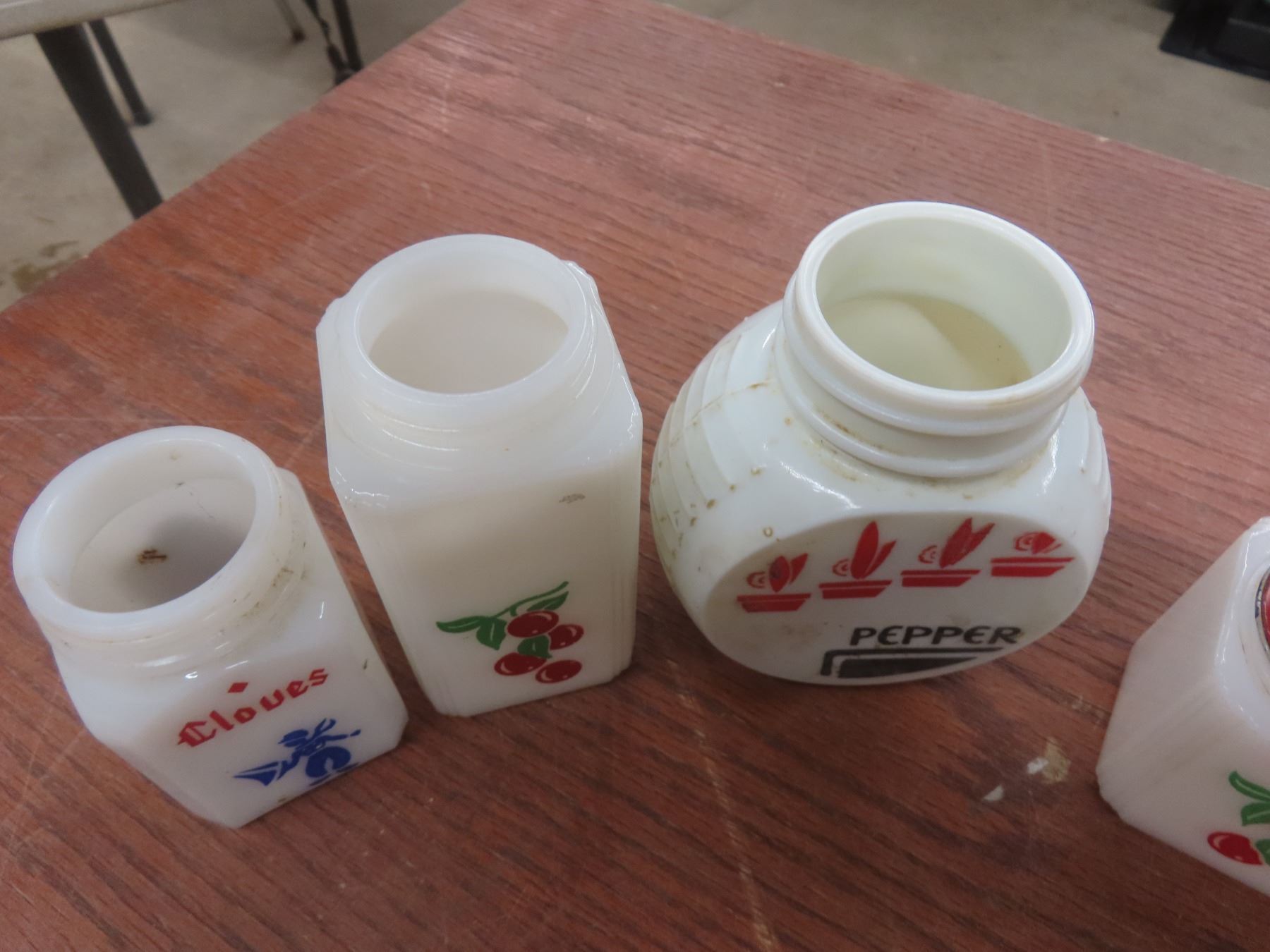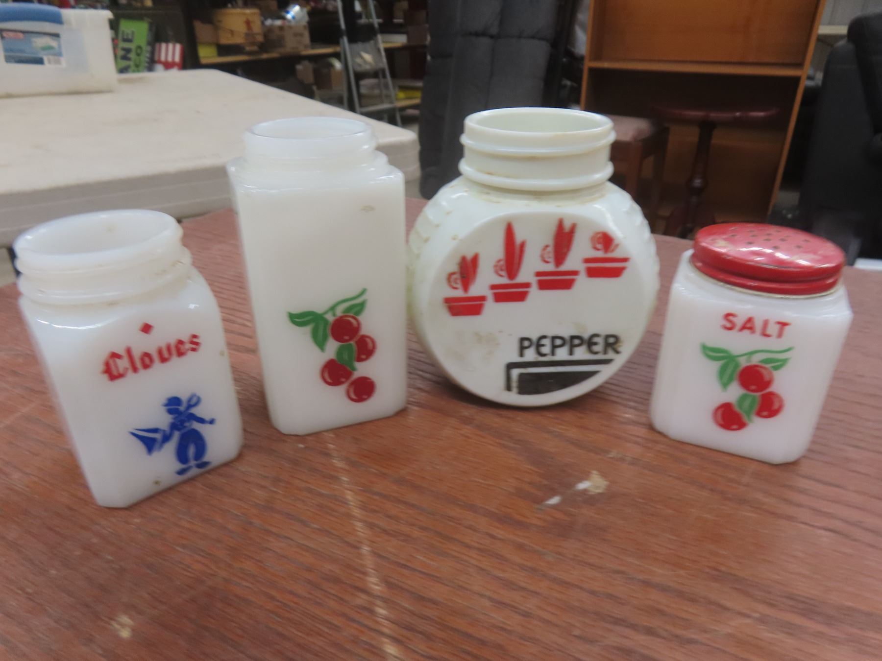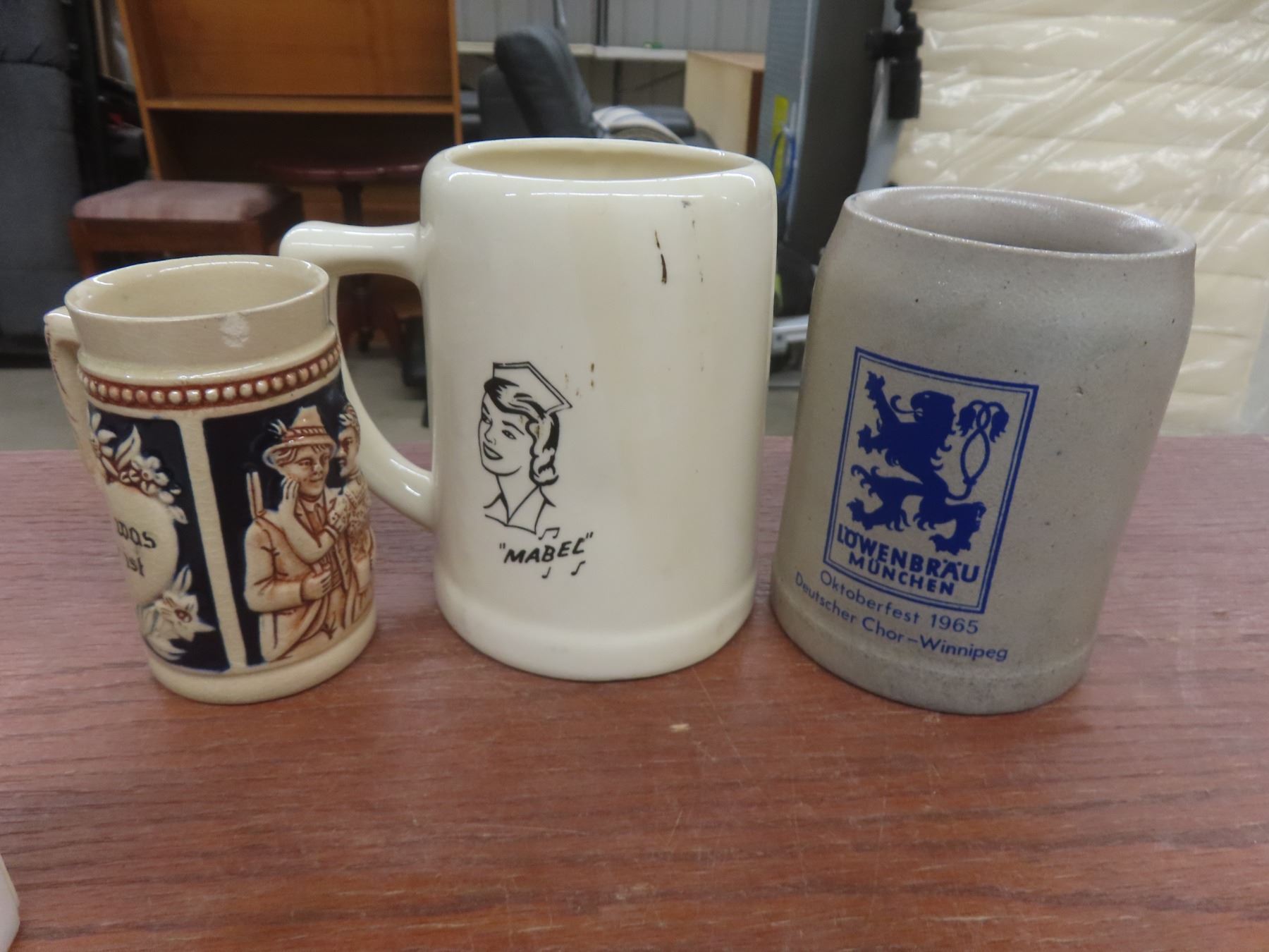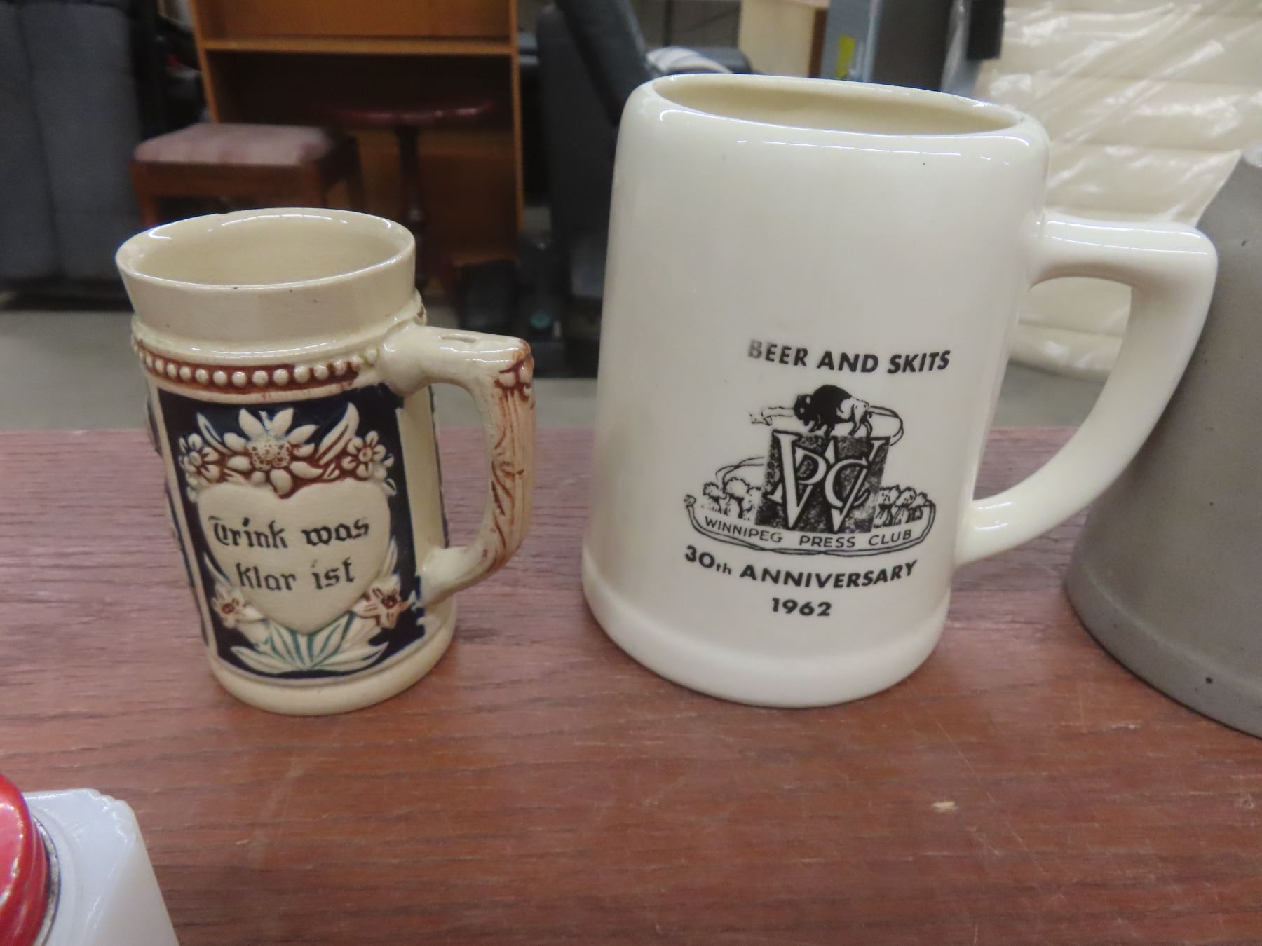 Beer Glasses and Steins With 4 Milk Glass Spice Jars (Missing Lids)