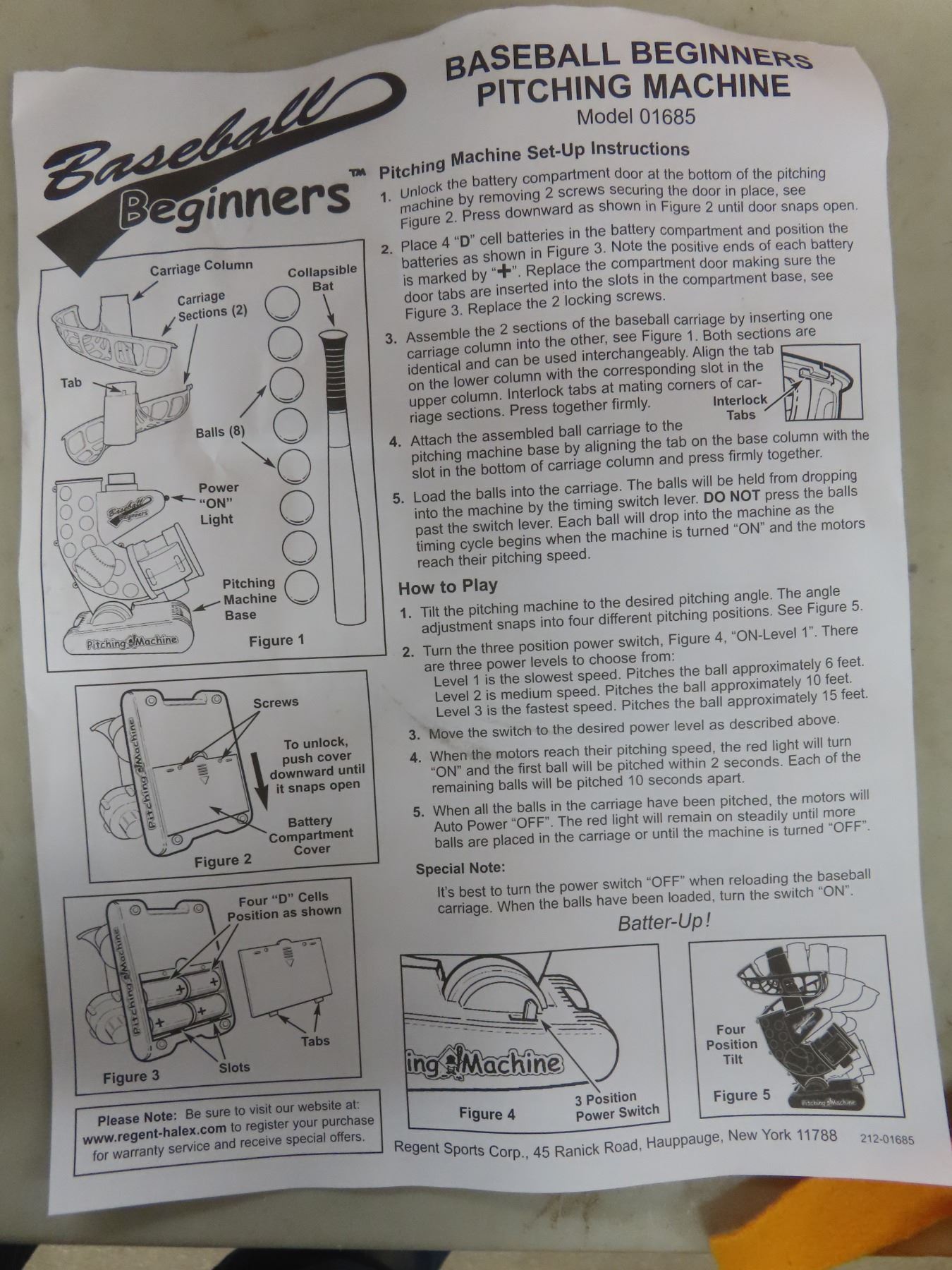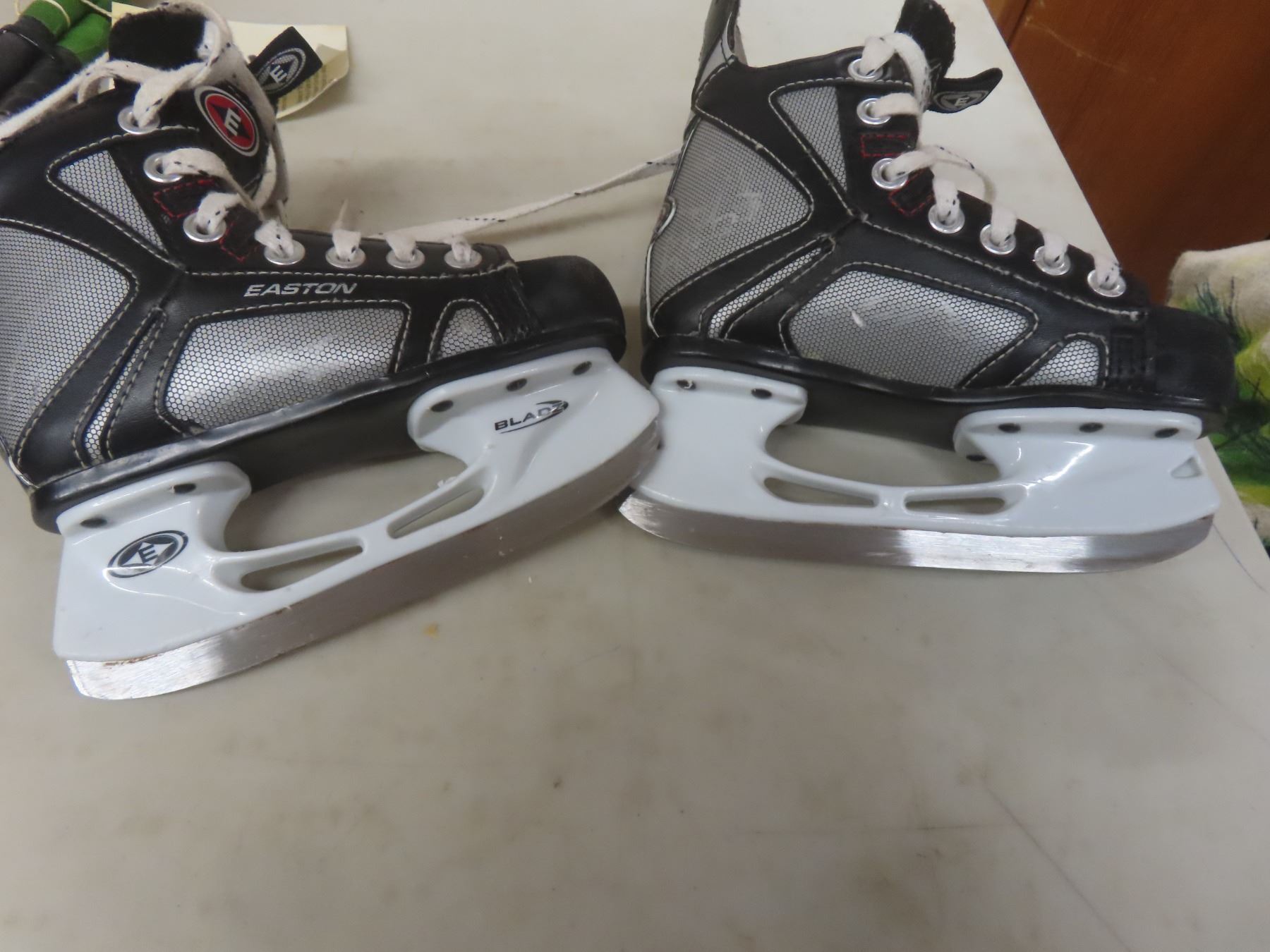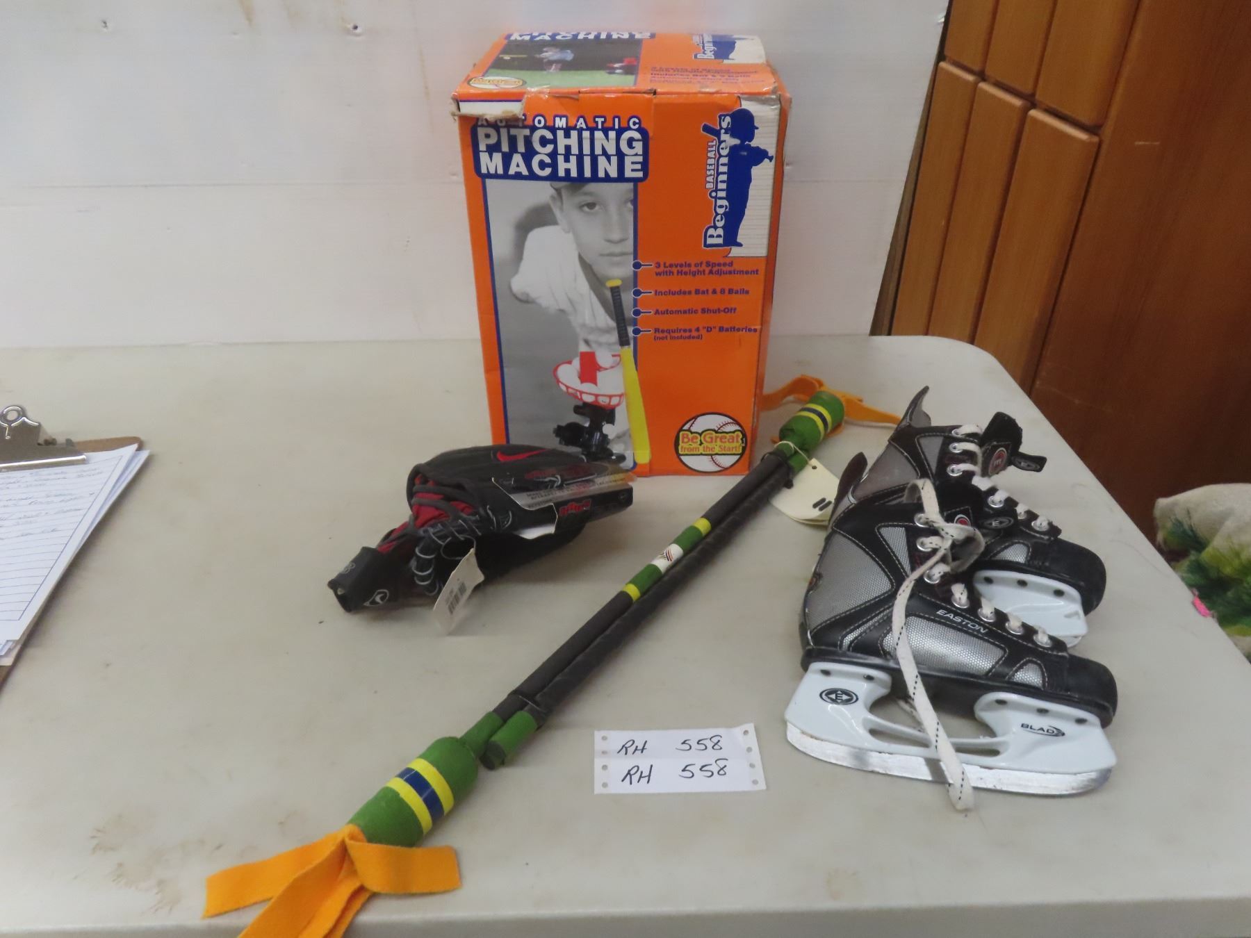 Lot 558 Automatic Pitching Machine, New Right Hand Glove and Youth Size 11 Skates