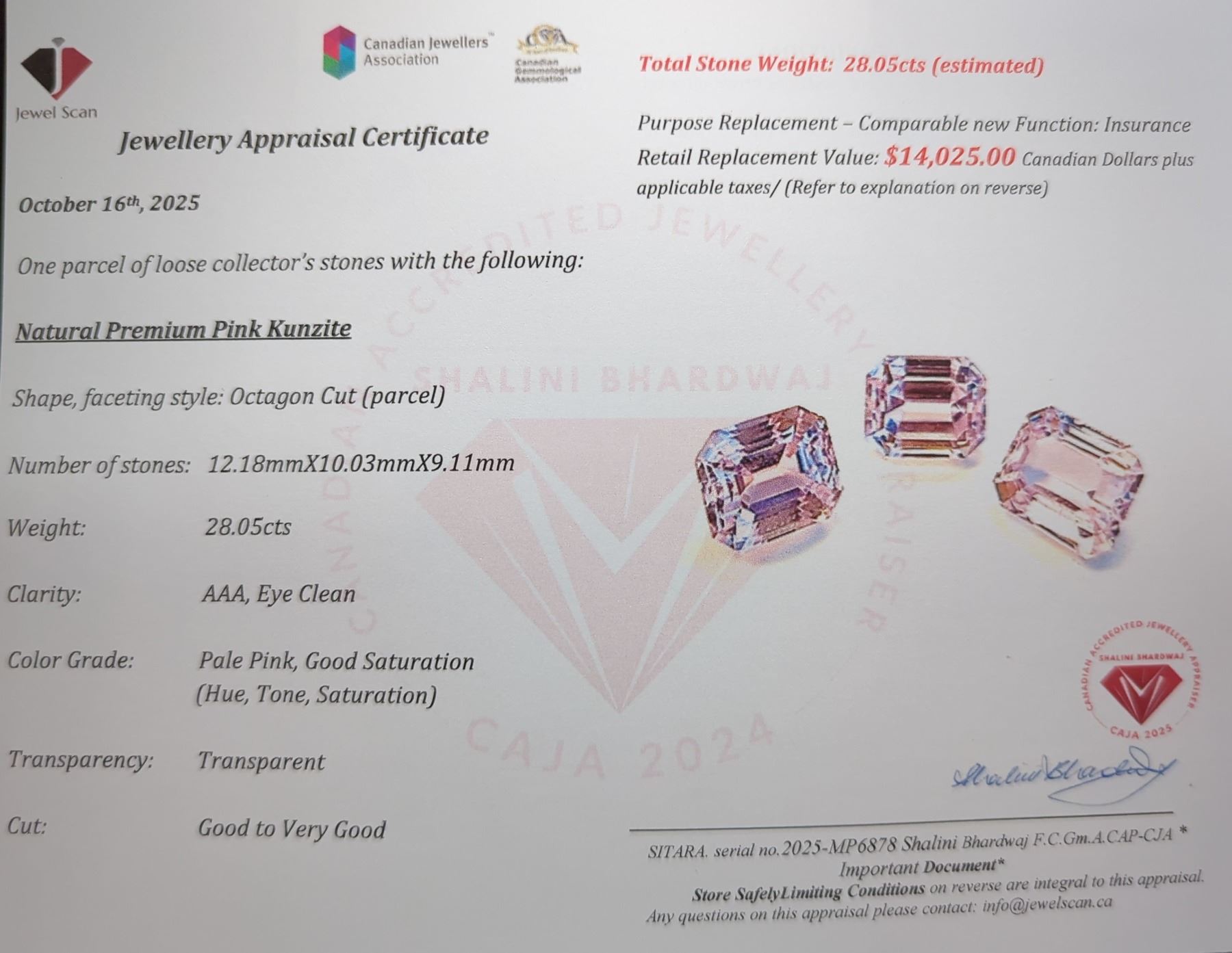 28.05 ct Certified Pink Kunzite gemstone Parcel ($14,025 Appraisal)