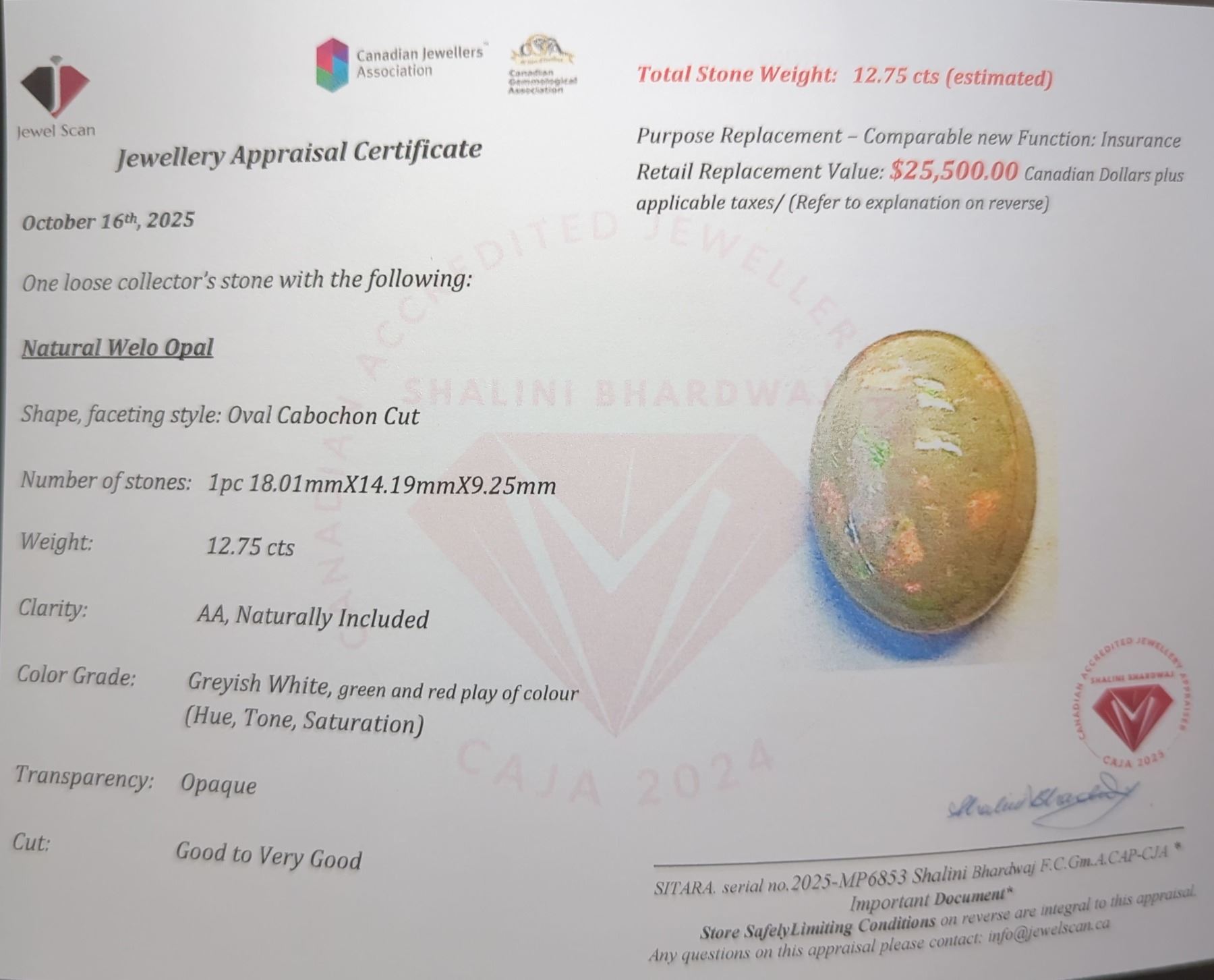 12.75 ct Certified Opal gemstone ($25,500 Appraisal)