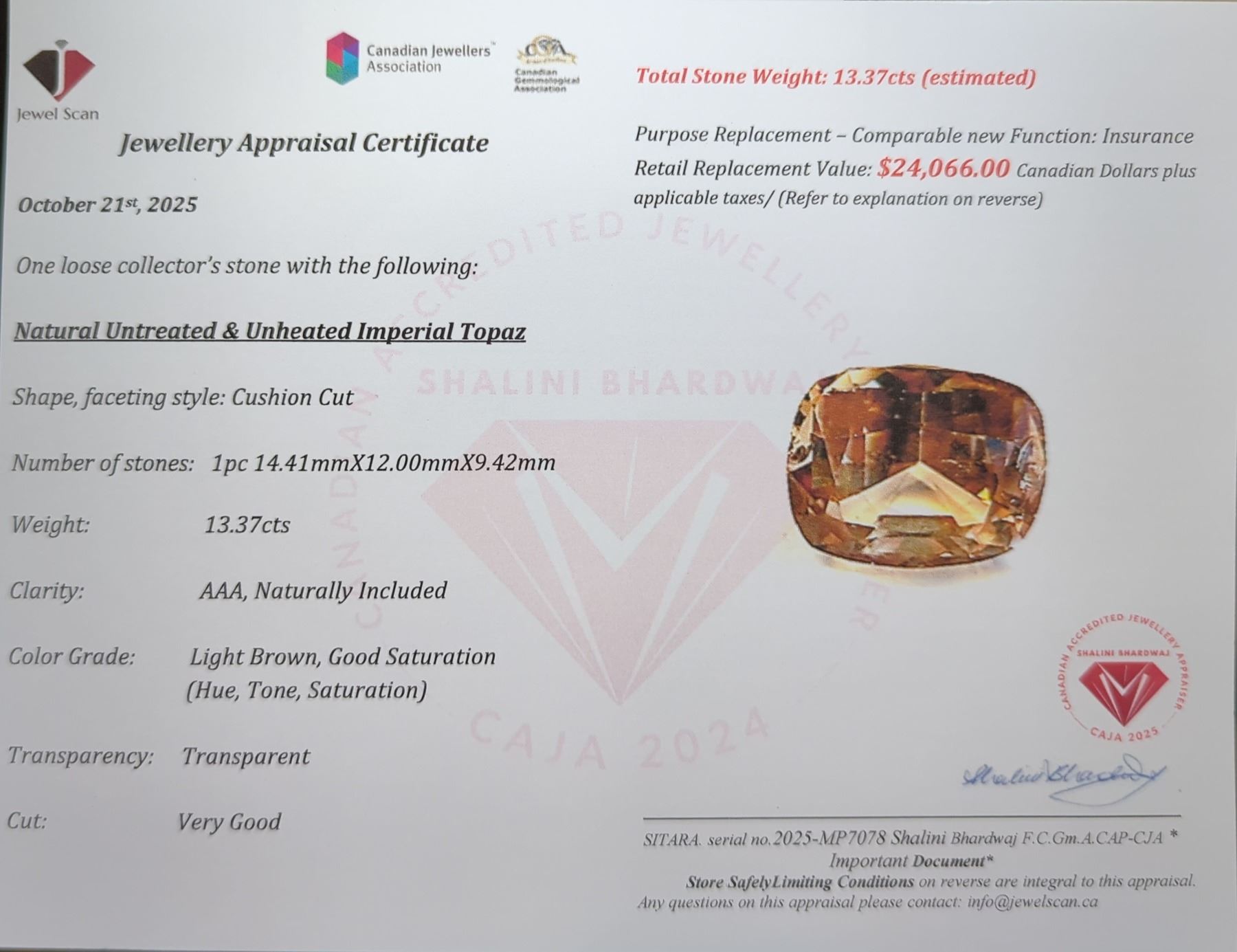 13.37 ct Certified Imperial Topaz gemstone ($24,066 Appraisal)