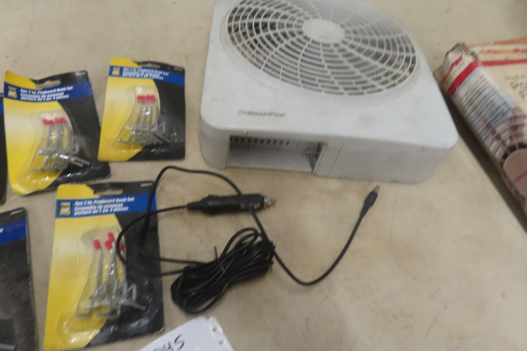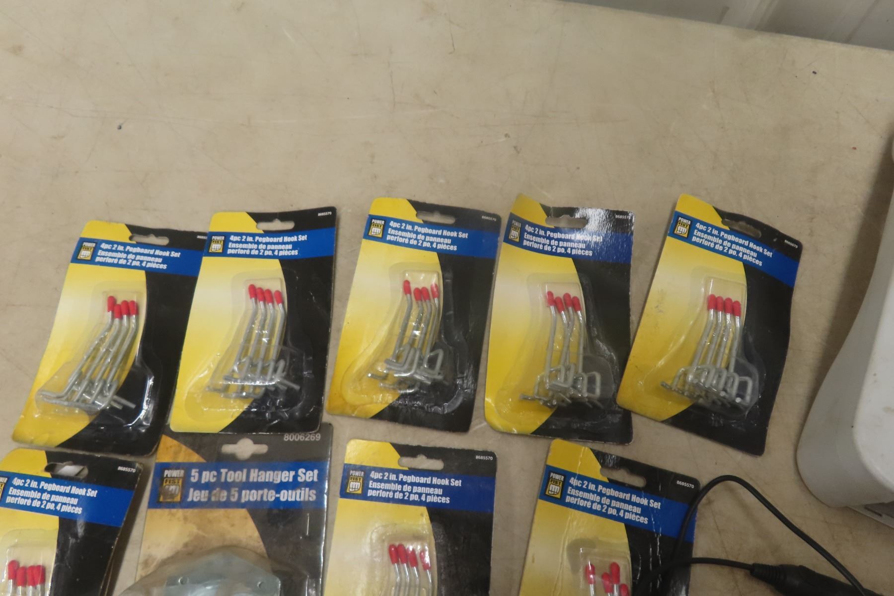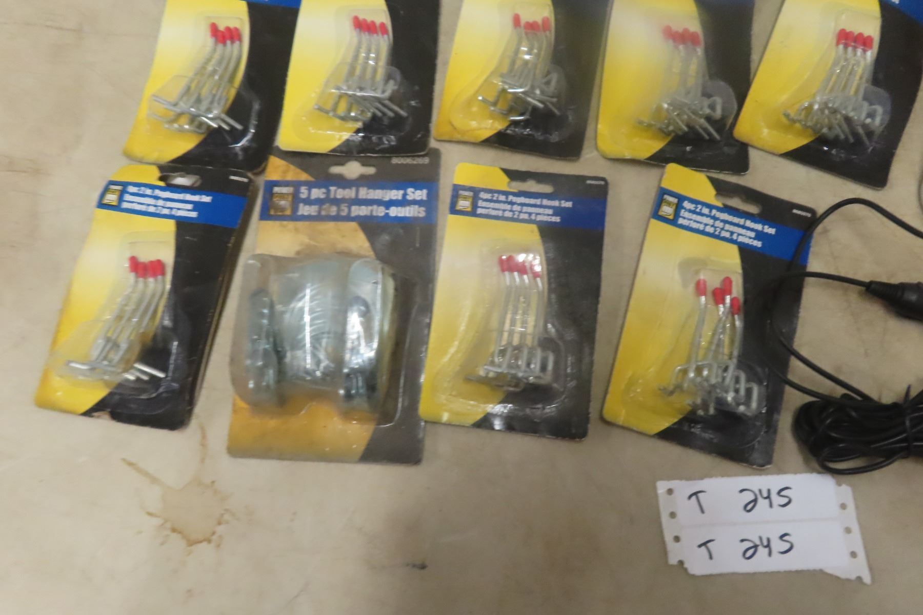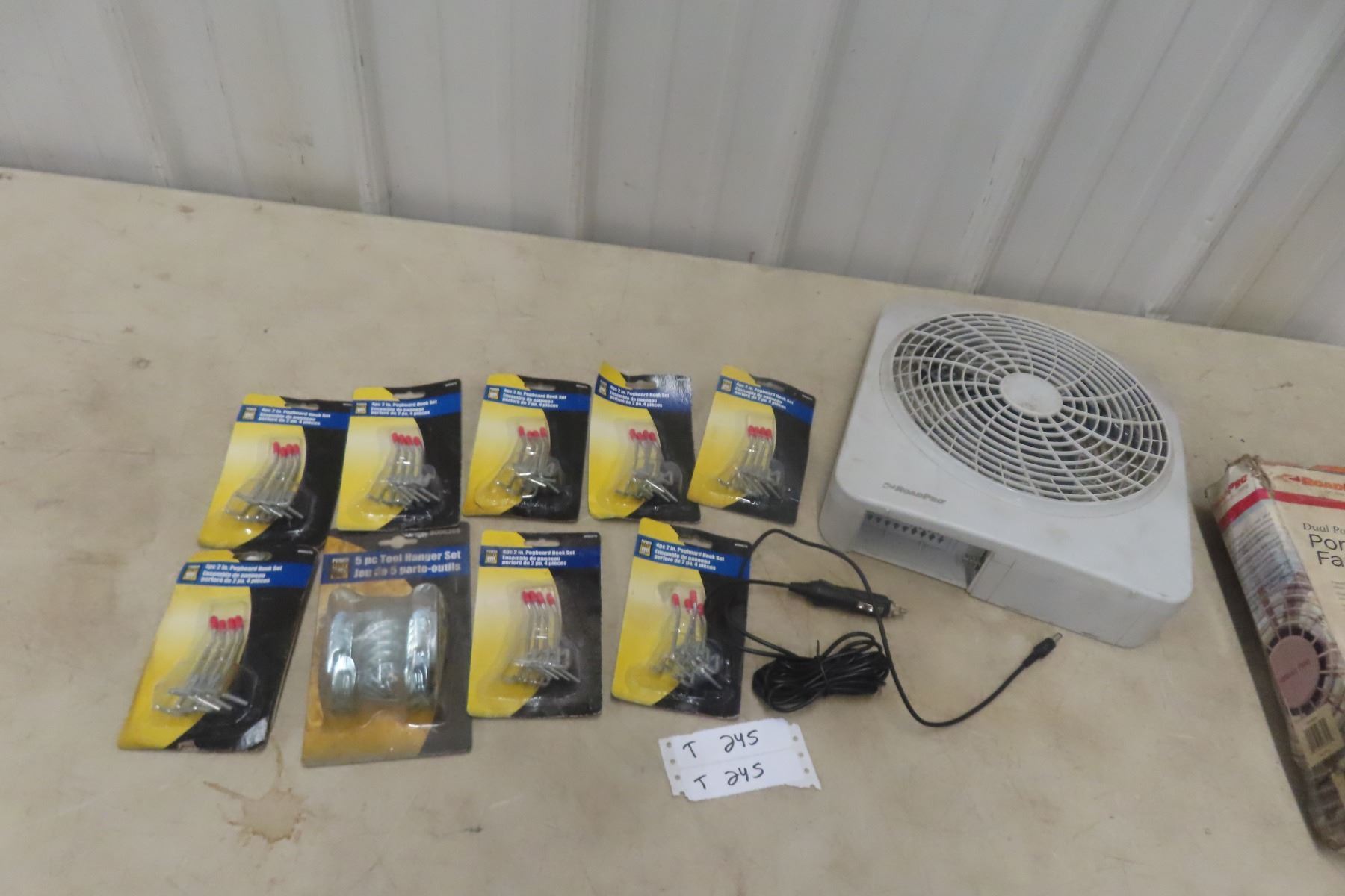 Lot 245 Pegboard Hooks, Plug Pro 12V, Battery, 10 Inch Fan, Tool Hangers