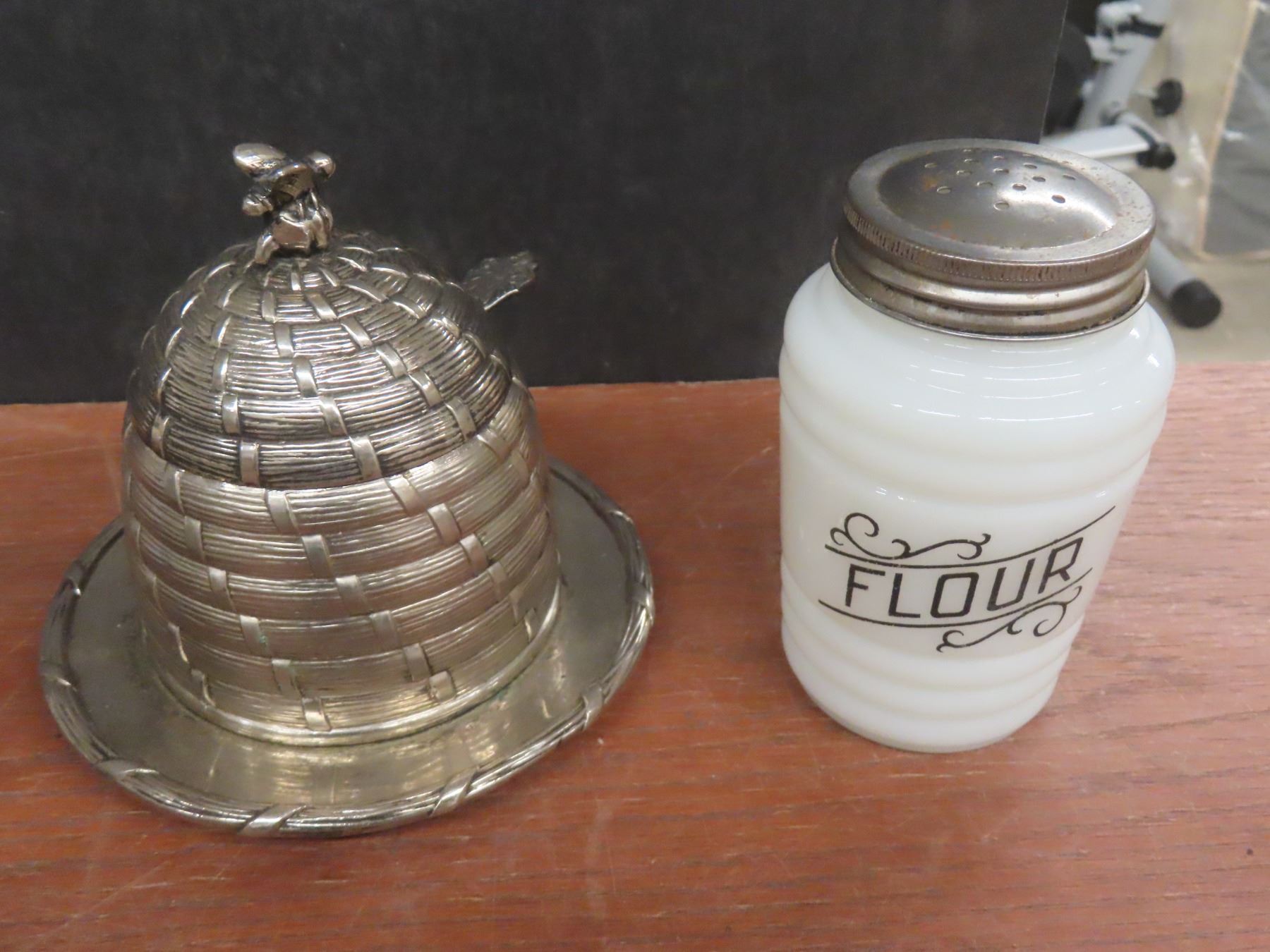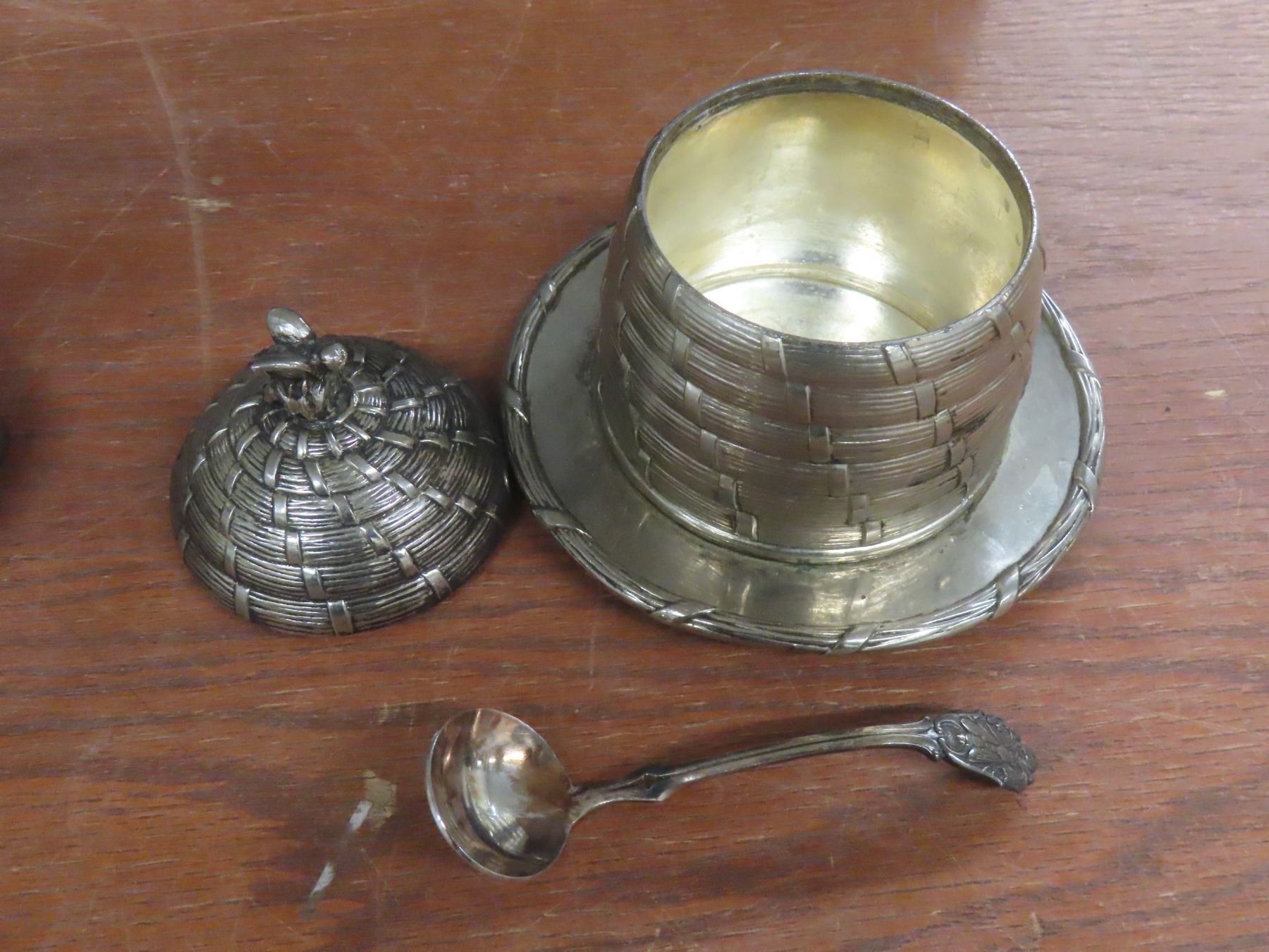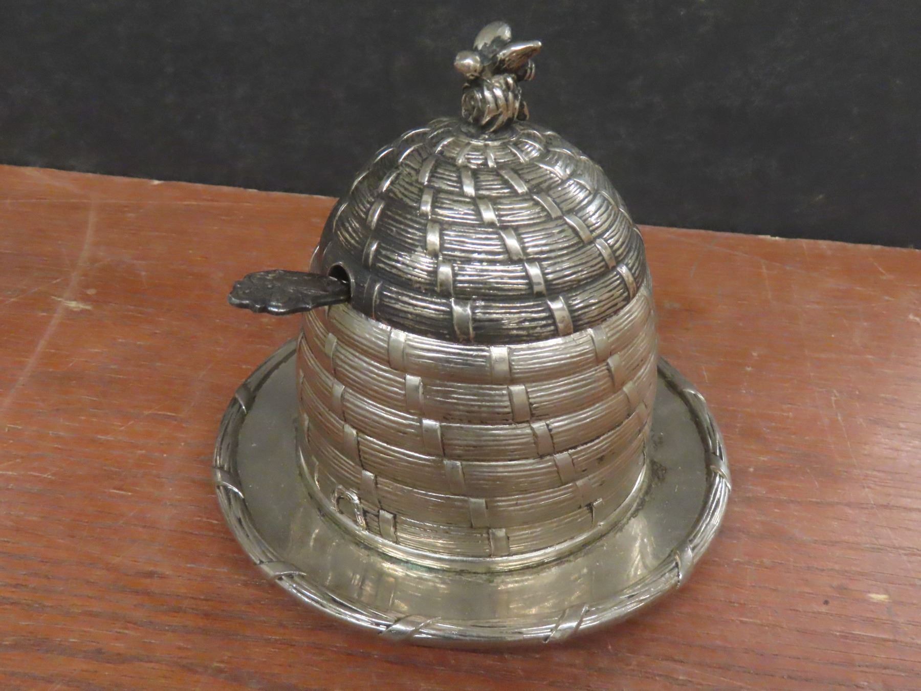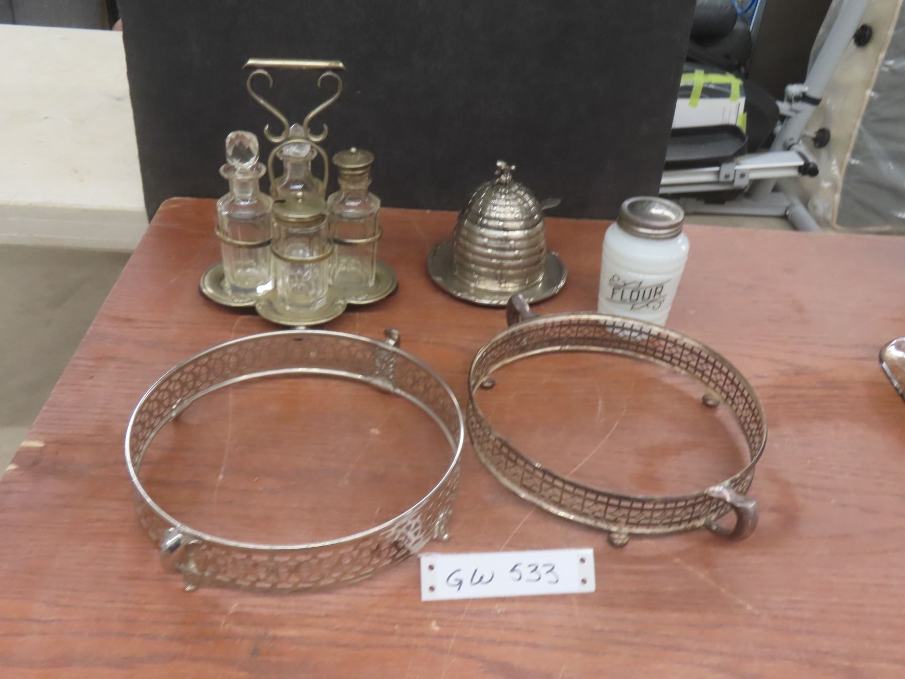 Lot 533 Silver-Plated Honey Keeper, 2 Casserole Dish Holders, and 5-Piece Salt, Pepper, Oil, and Vinegar Se