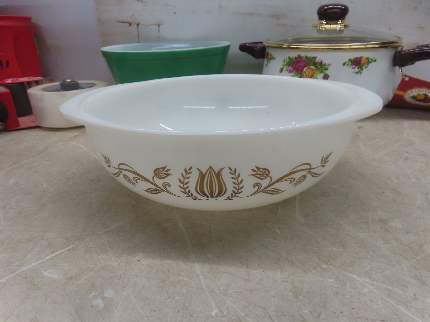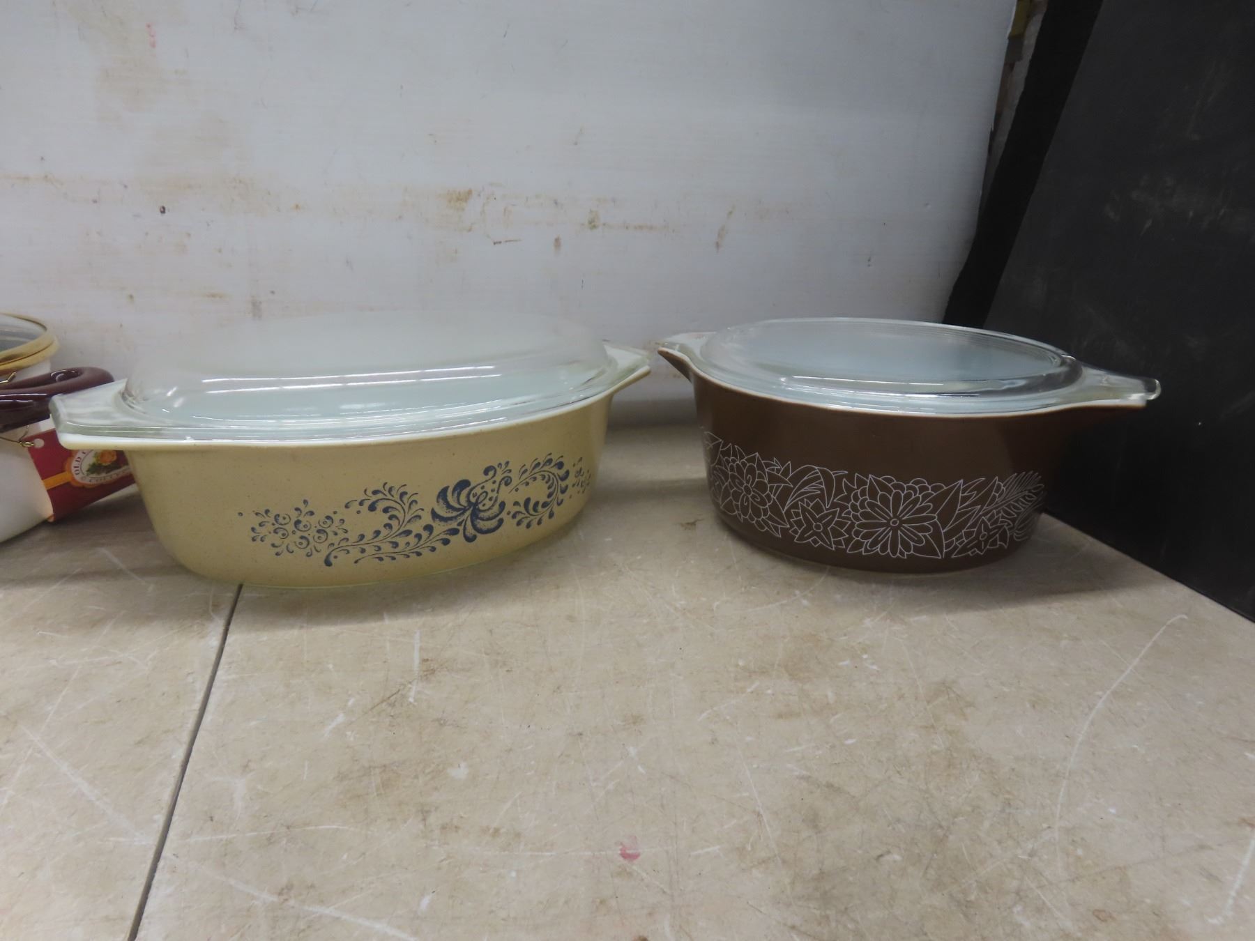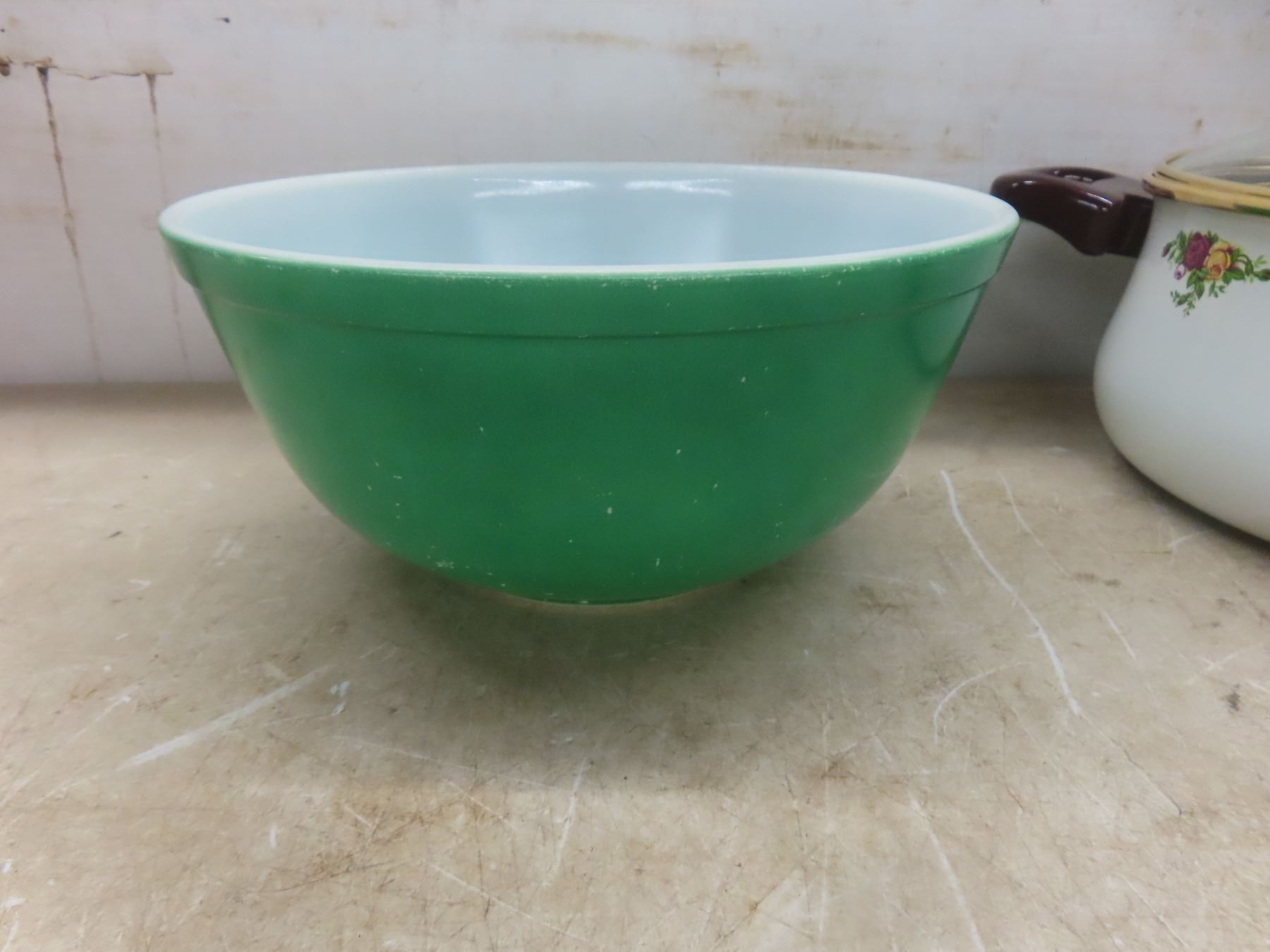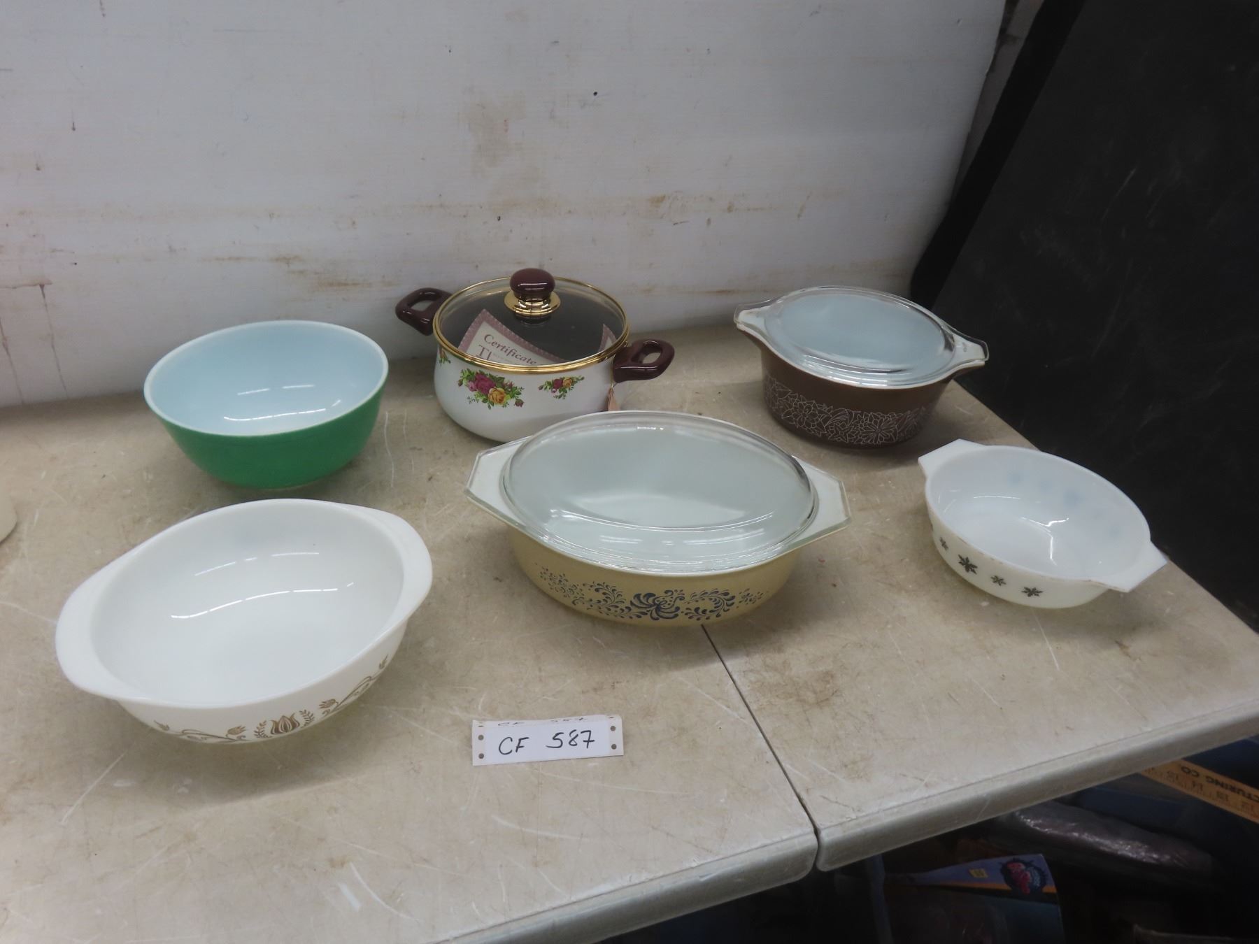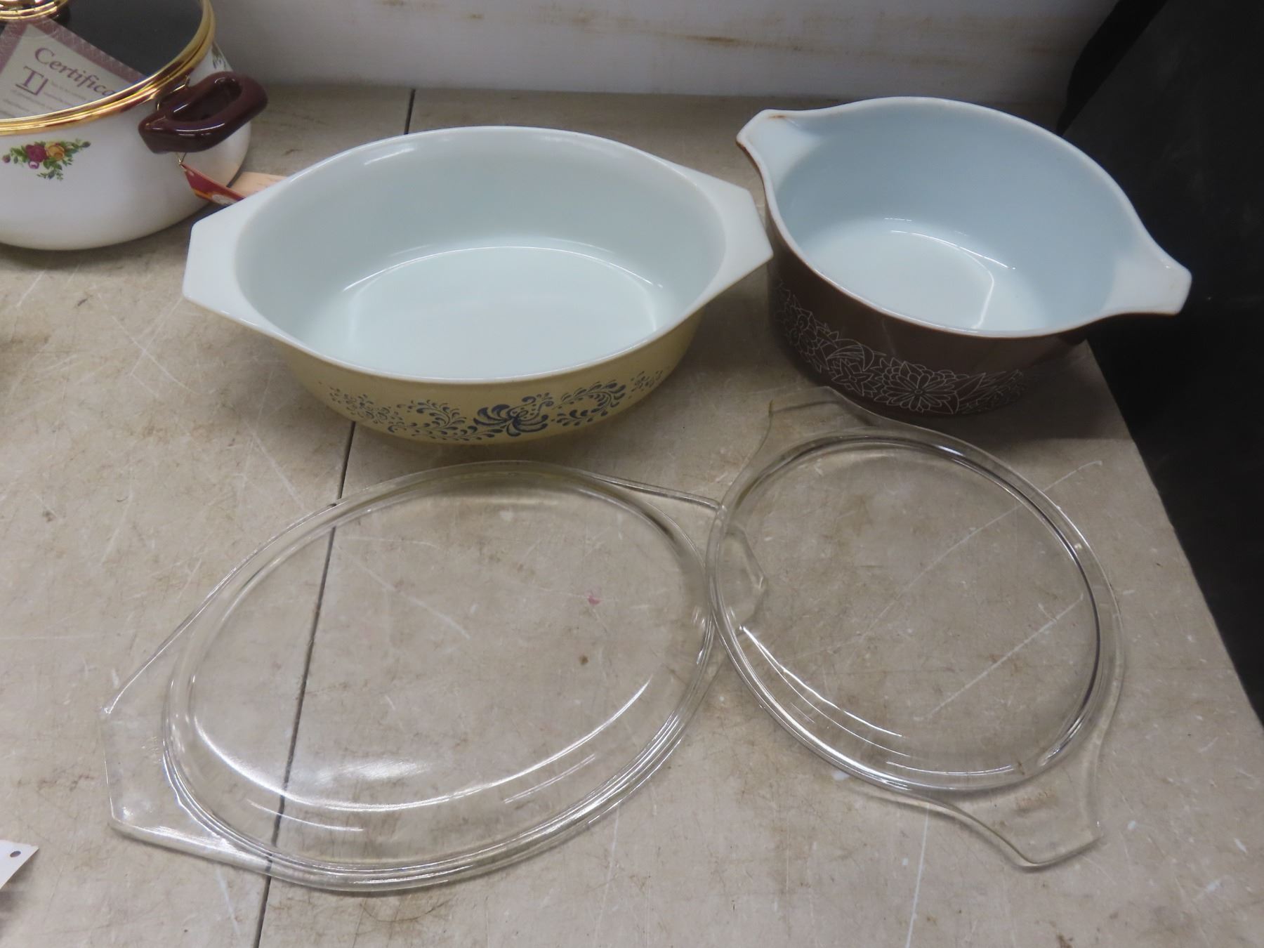 Lot 587 4 Pyrex Mixing Bowls, Covered Casserole Dishes, and Old Country Roses Formal Cookware With Lid