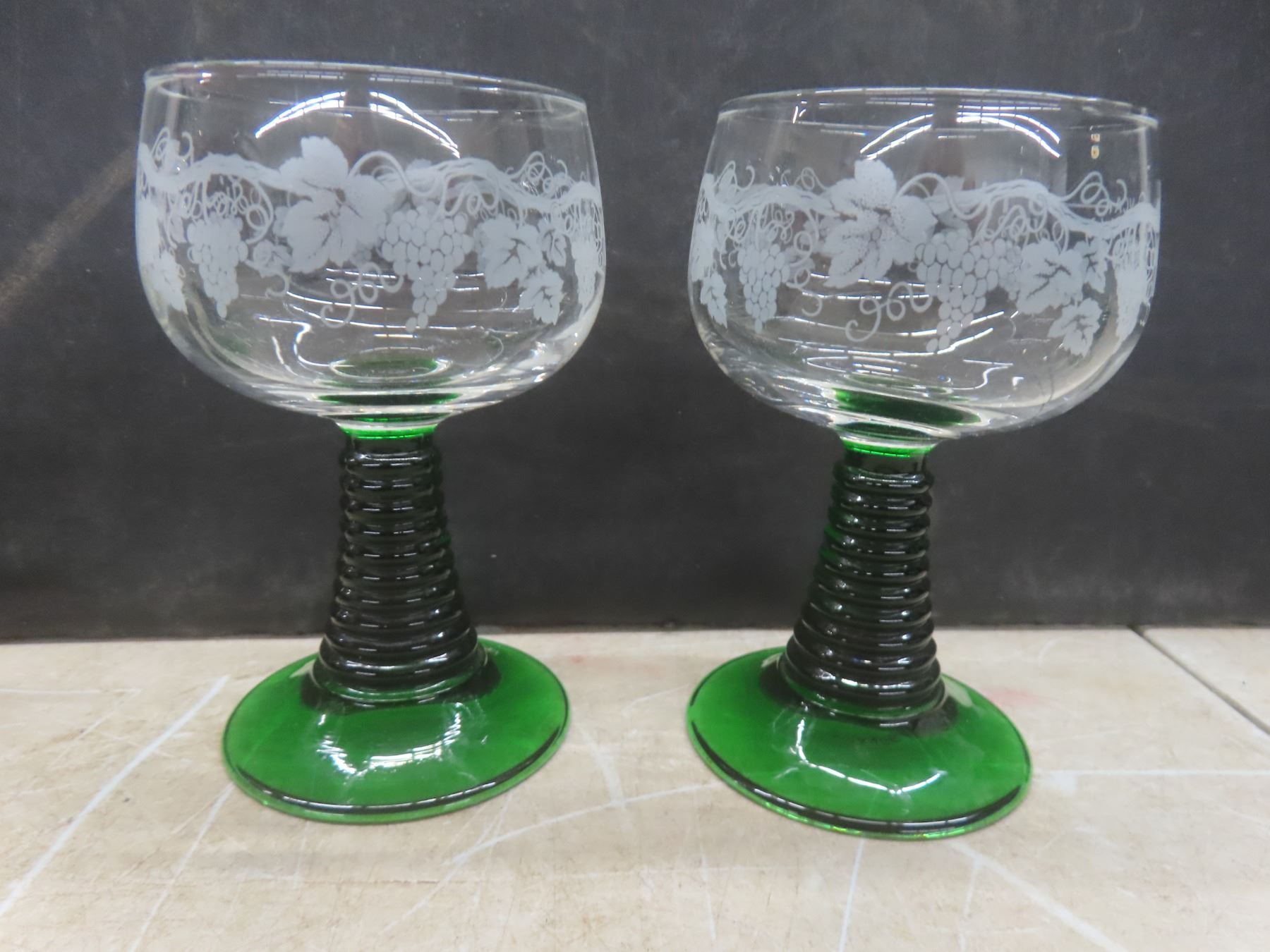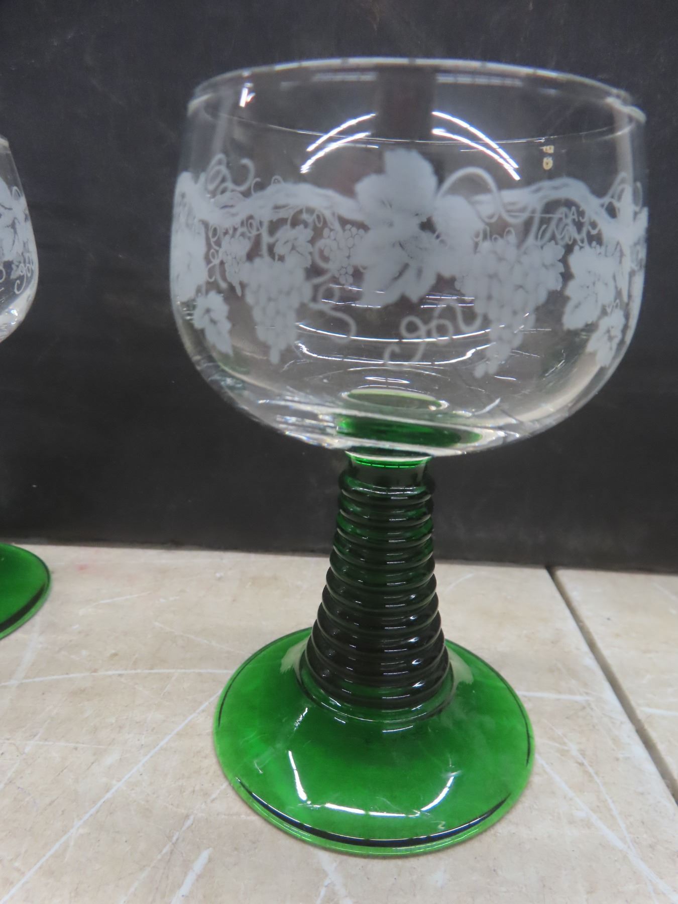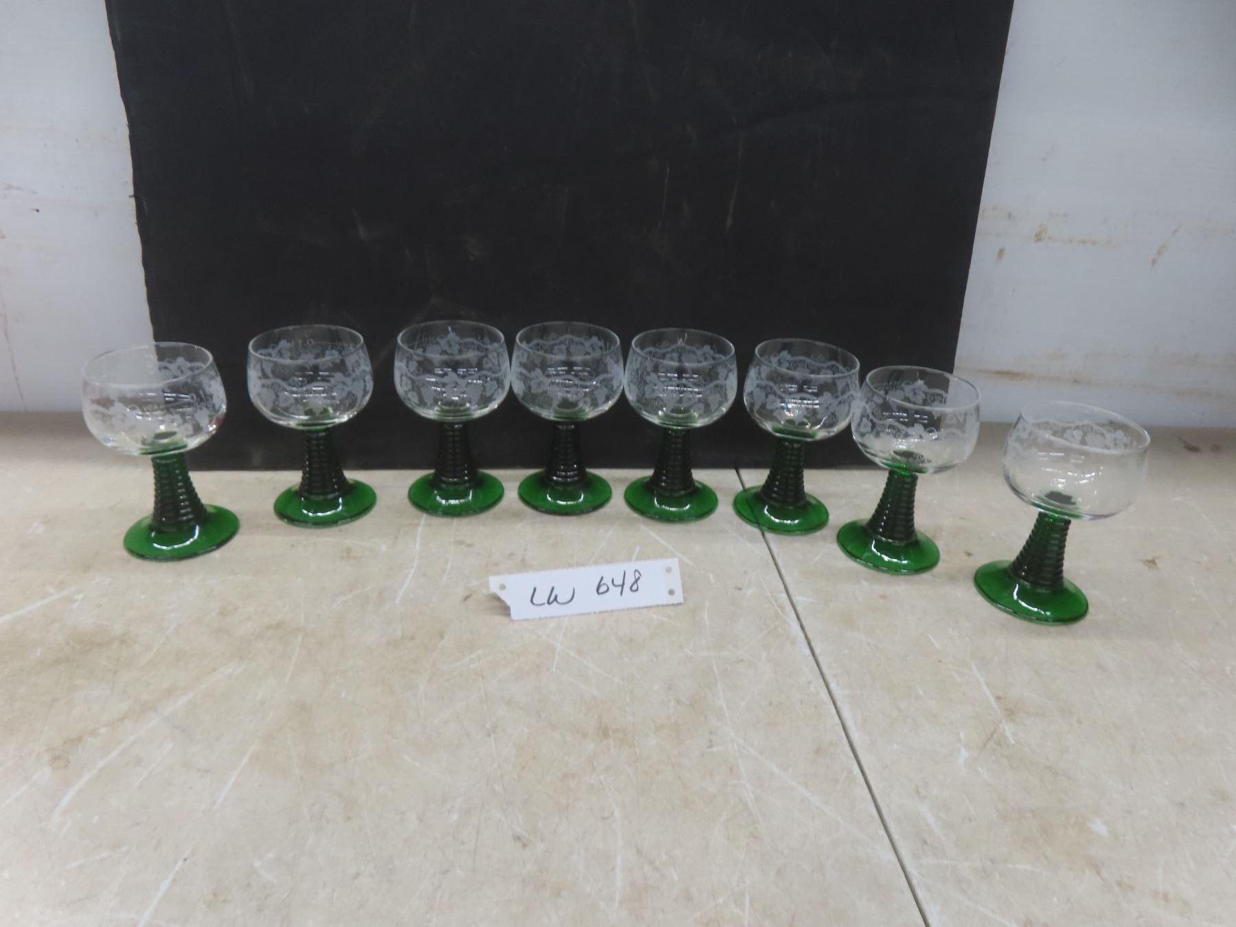 Lot 648 8 Vintage Luminarc Roma-Style Wine Glasses w/Green Ribbed Stem