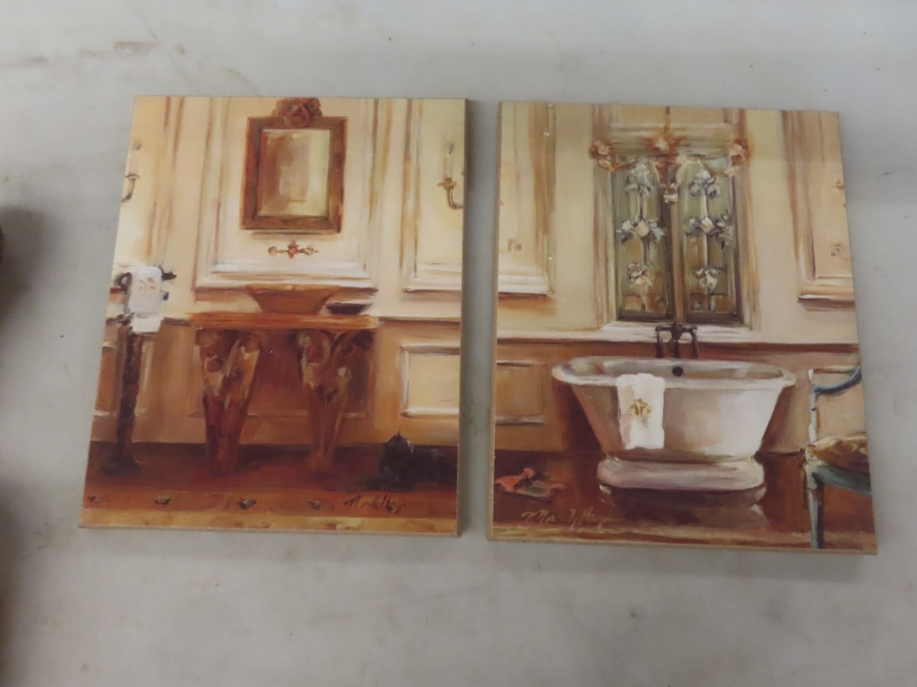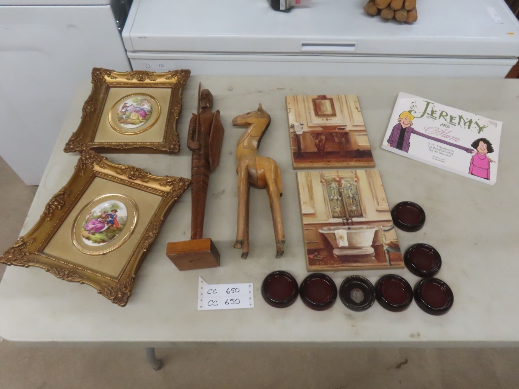 Lot 650 4 Pictures (Largest 12" x 11"), 2 Wood Sculptures, 6 Vintage Furniture Coasters