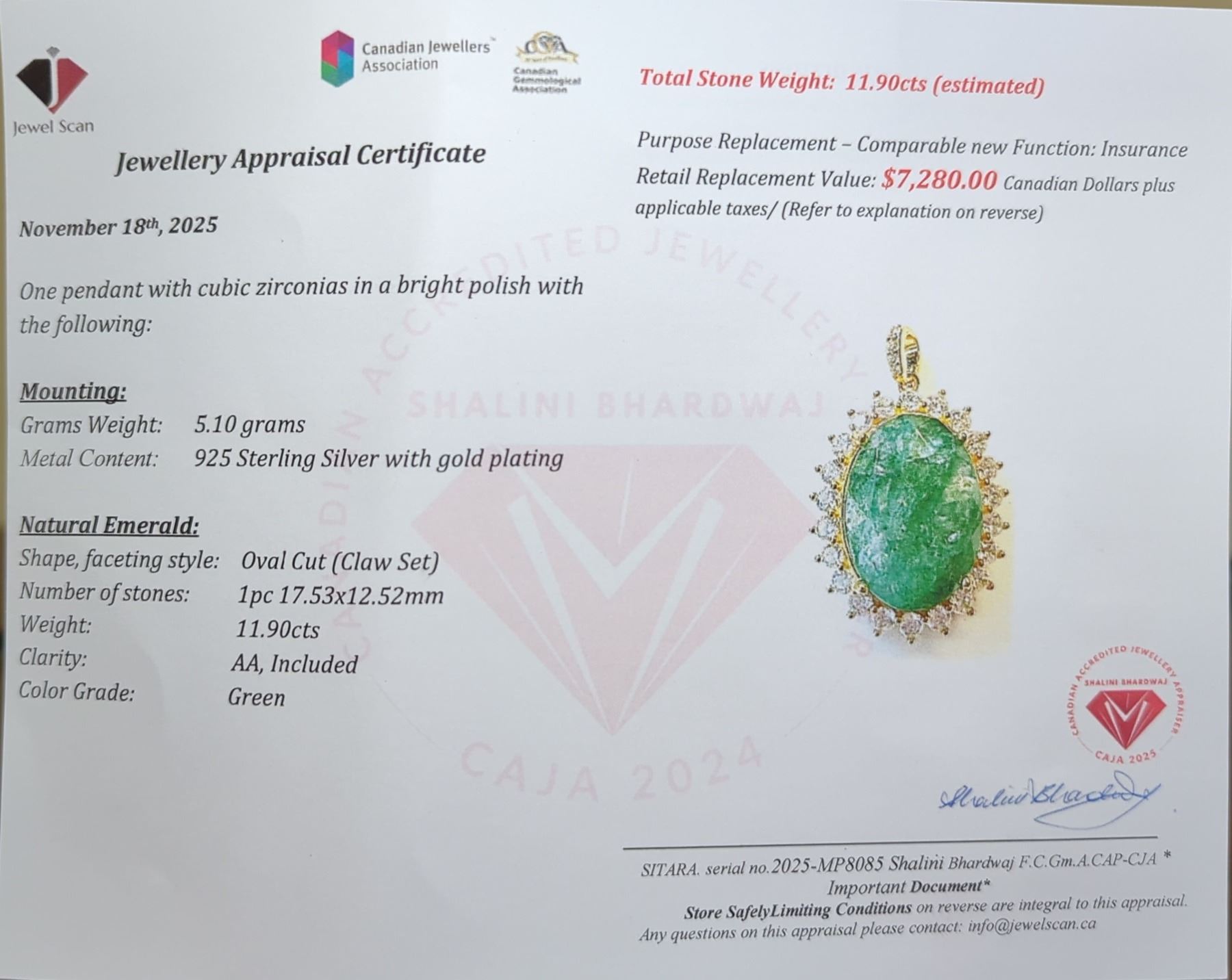 5.1 ct Certified Silver Emerald gemstone Pendant ($7,280 Appraisal)