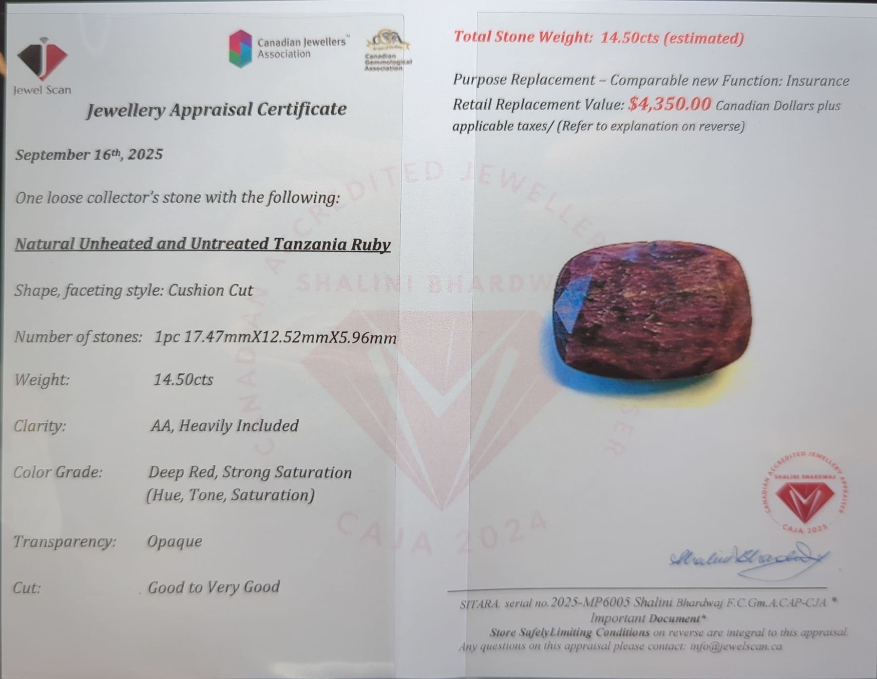 Lot 778B 14.5 ct Certified Ruby gemstone ($7,250 Appraisal)