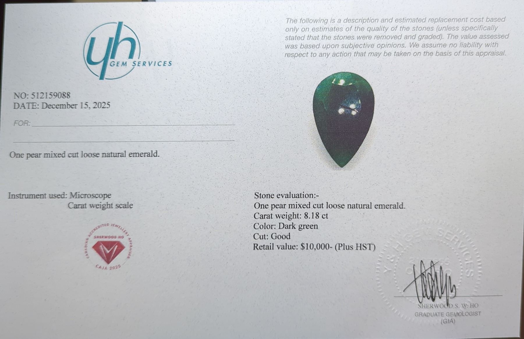 8.2 ct Certified Emerald gemstone ($10,000 Appraisal)