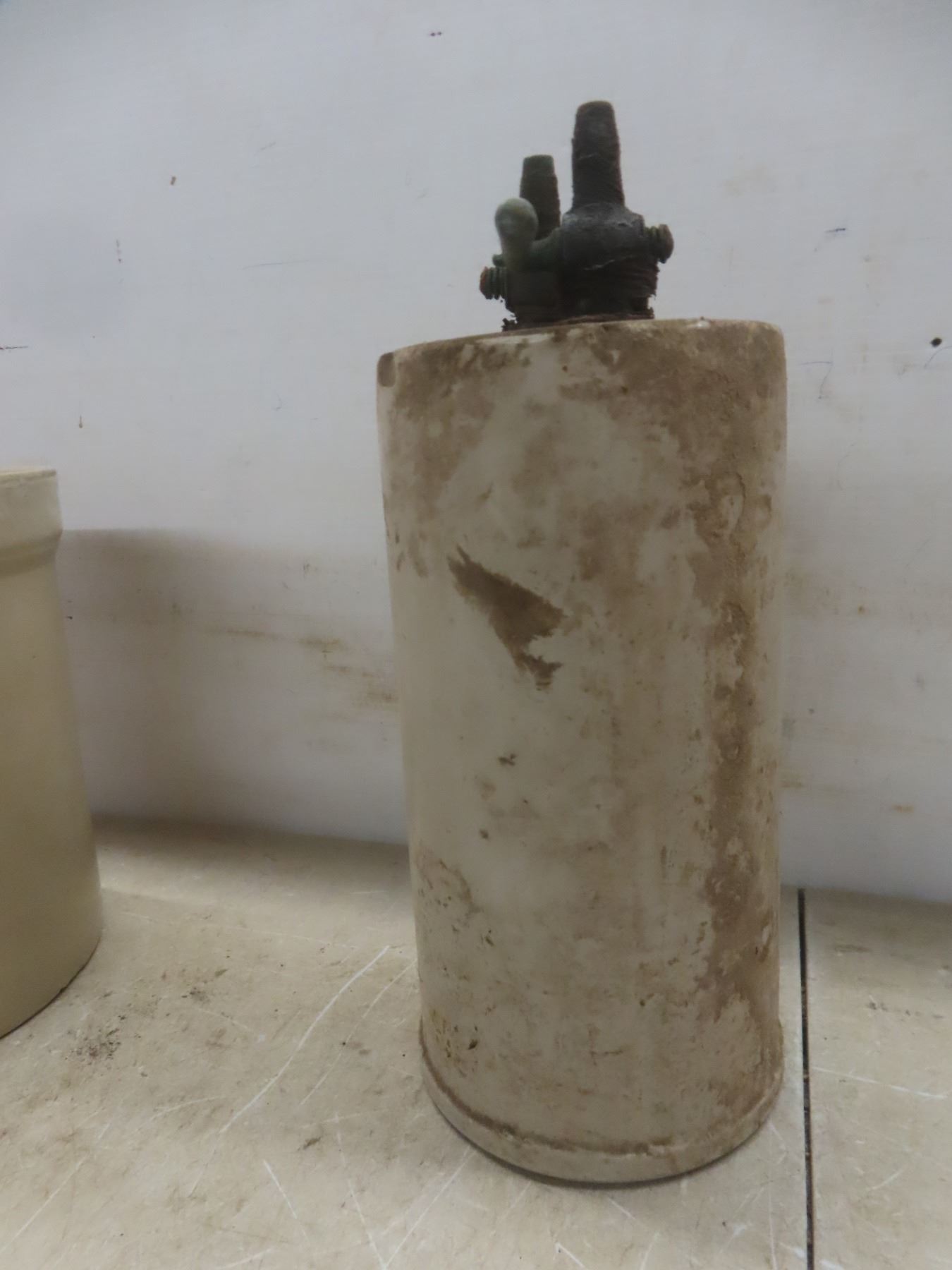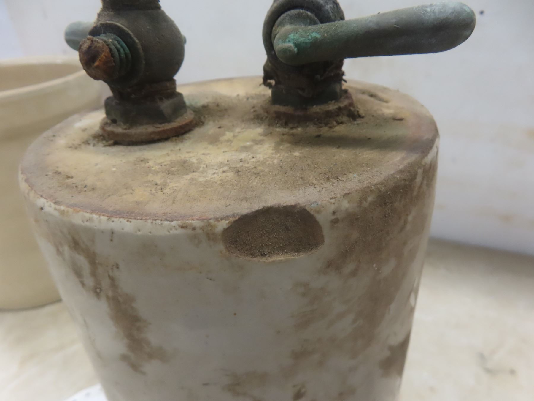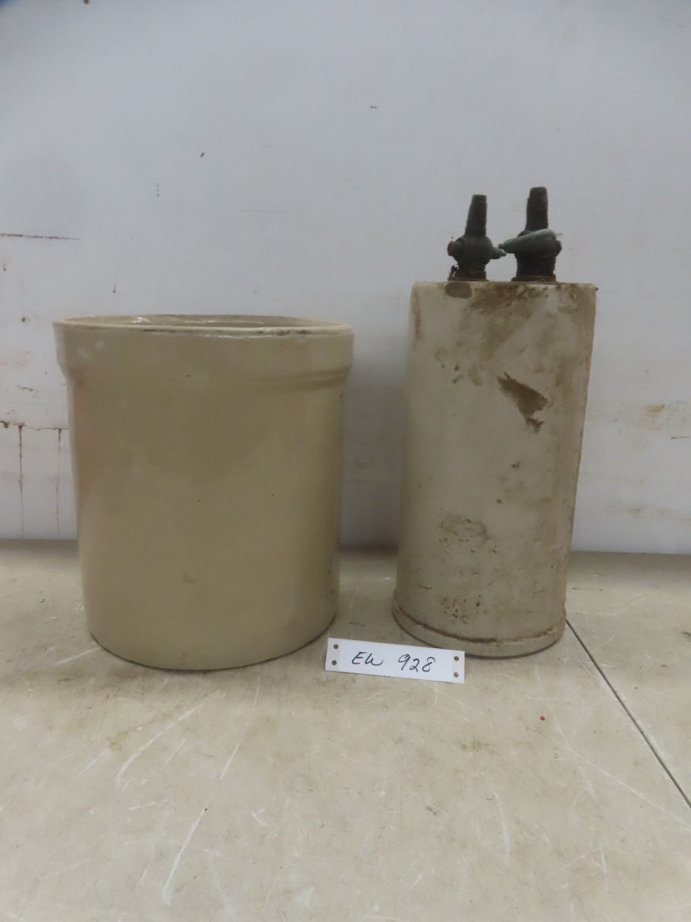 Lot 928 2-Gallon Stoneware Crock and Vintage Lye Solution Stoneware Container With Brass Dispenser