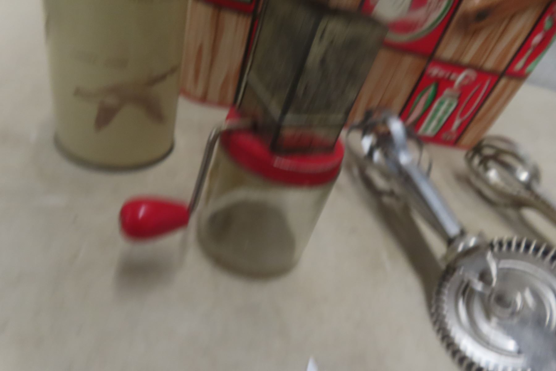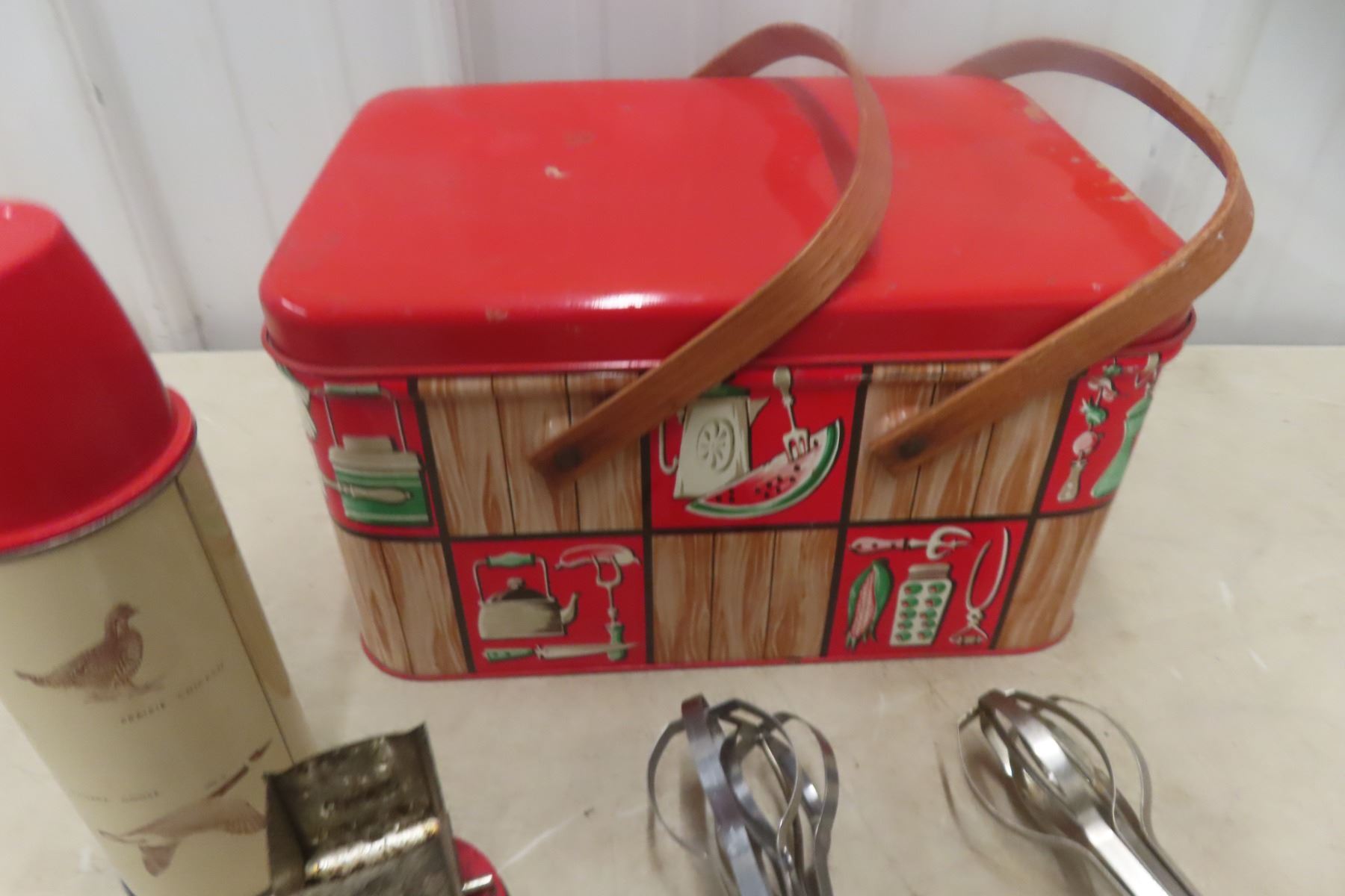 Vintage Picnic Basket, Thermos, Egg Beater Mixer, and More