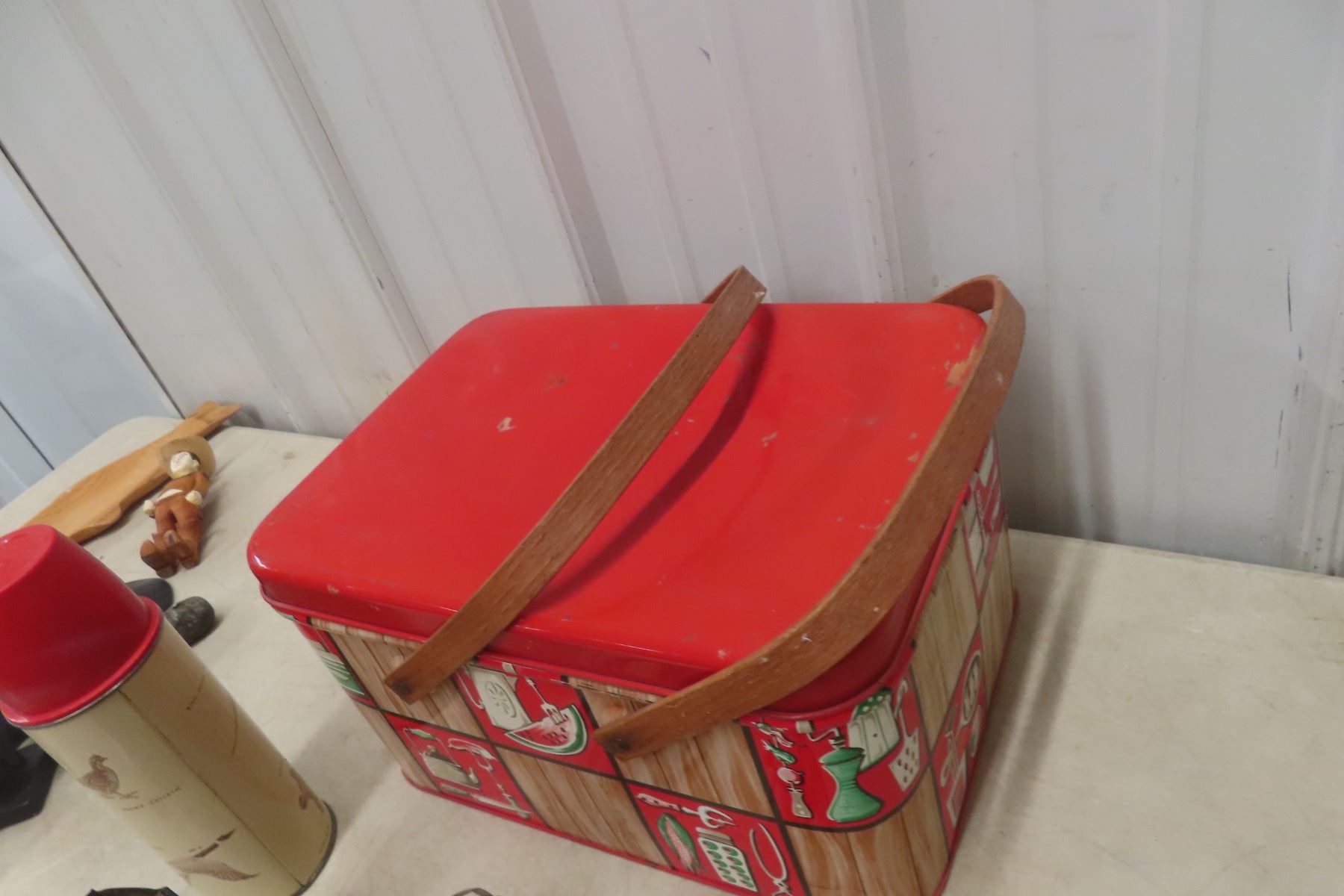 Lot 185 Vintage Picnic Basket, Thermos, Egg Beater Mixer, and More