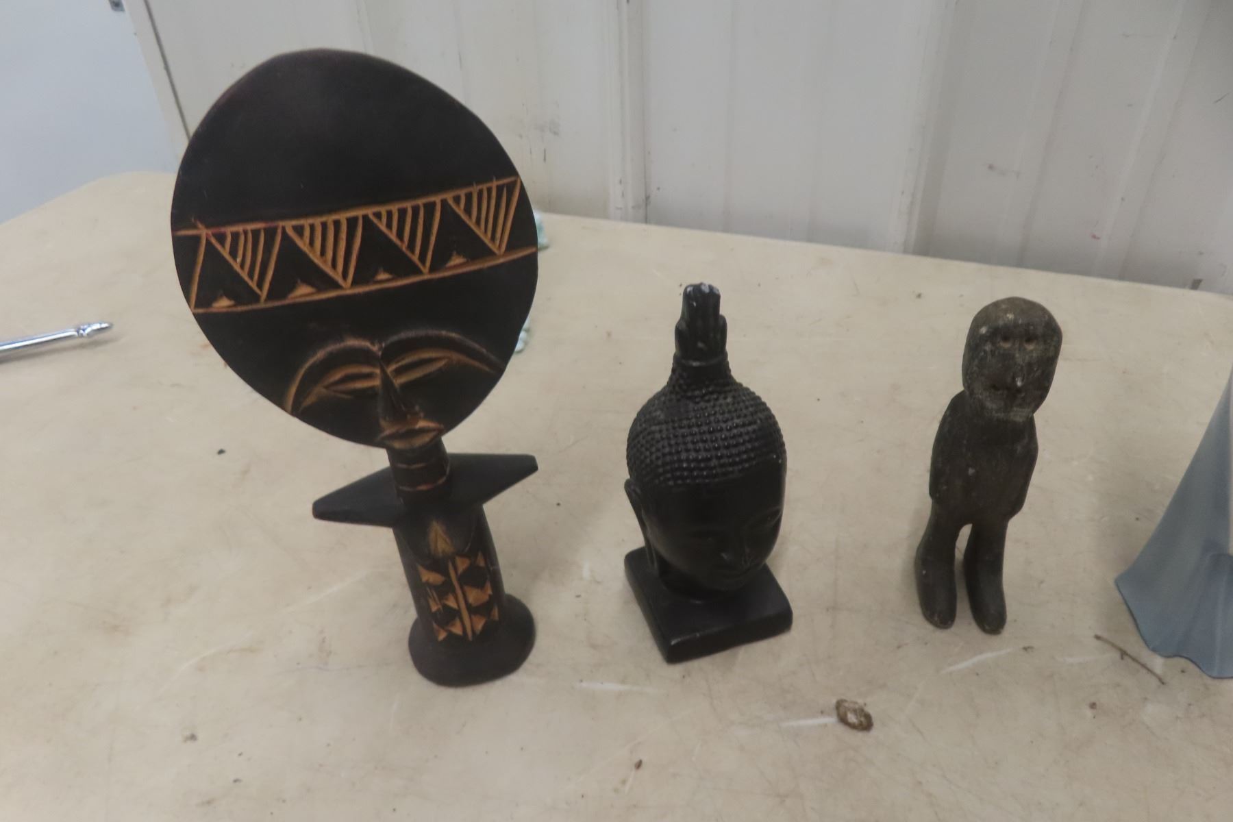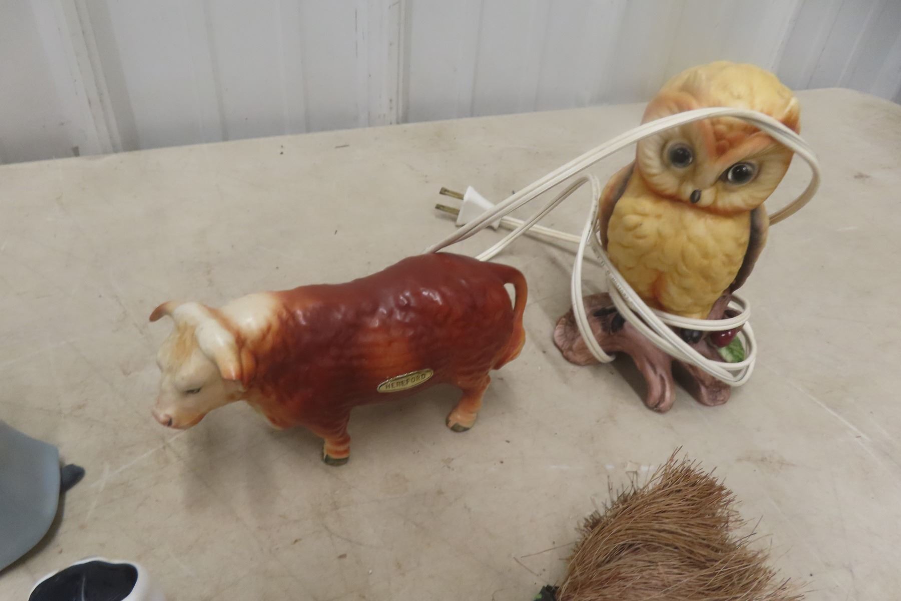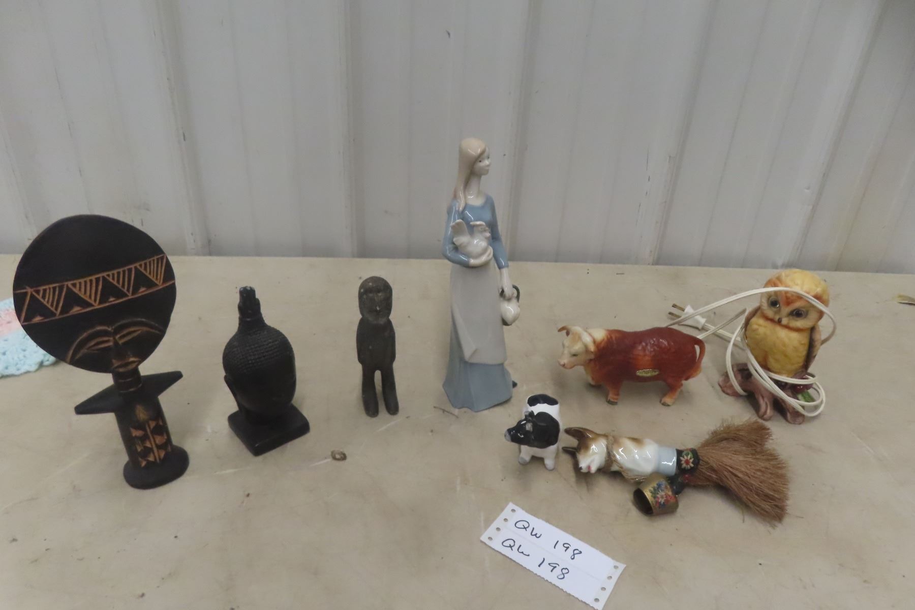 Lot 198 Figurines, Owl Lamp, Tribal Ornaments, and More