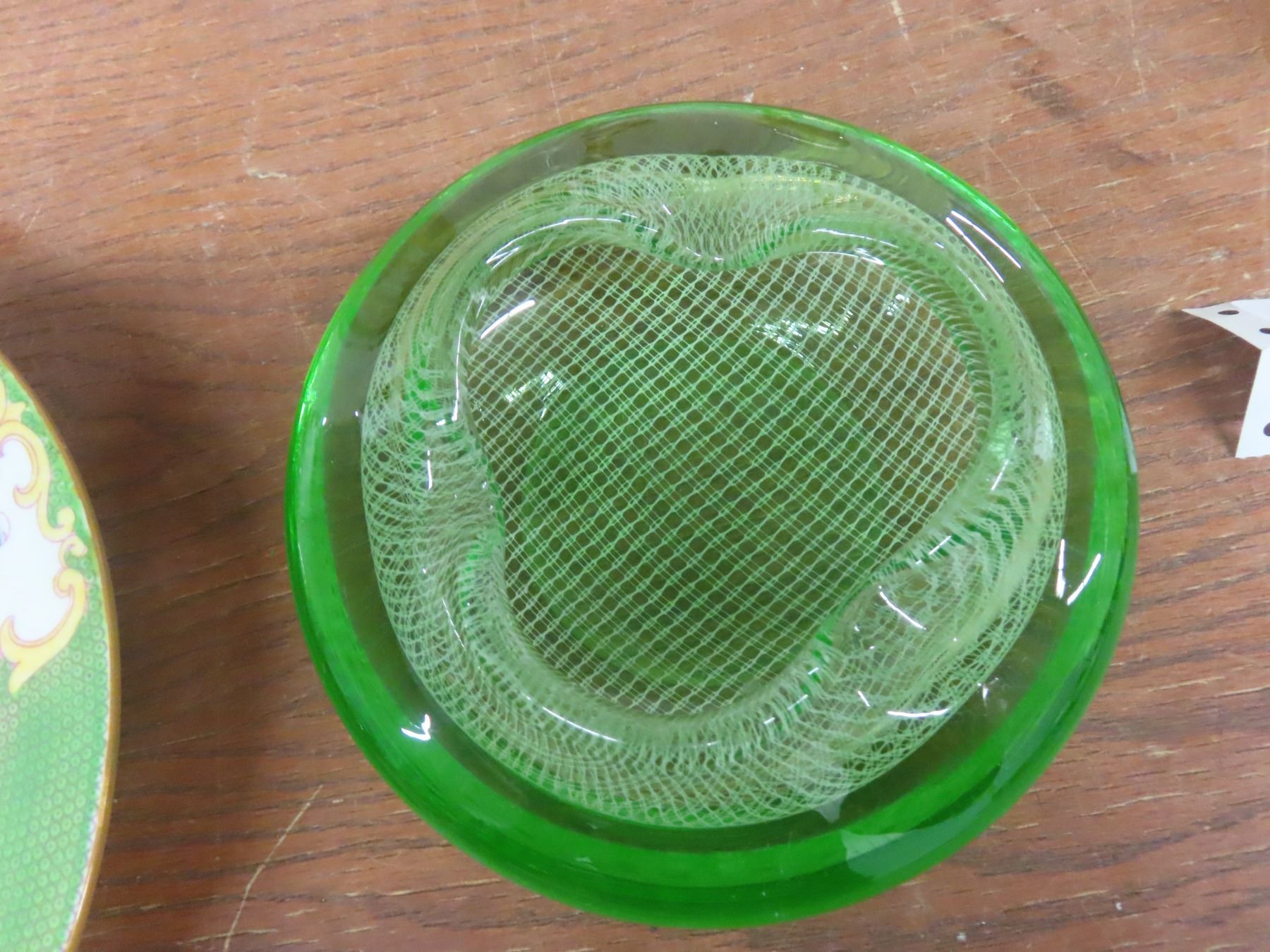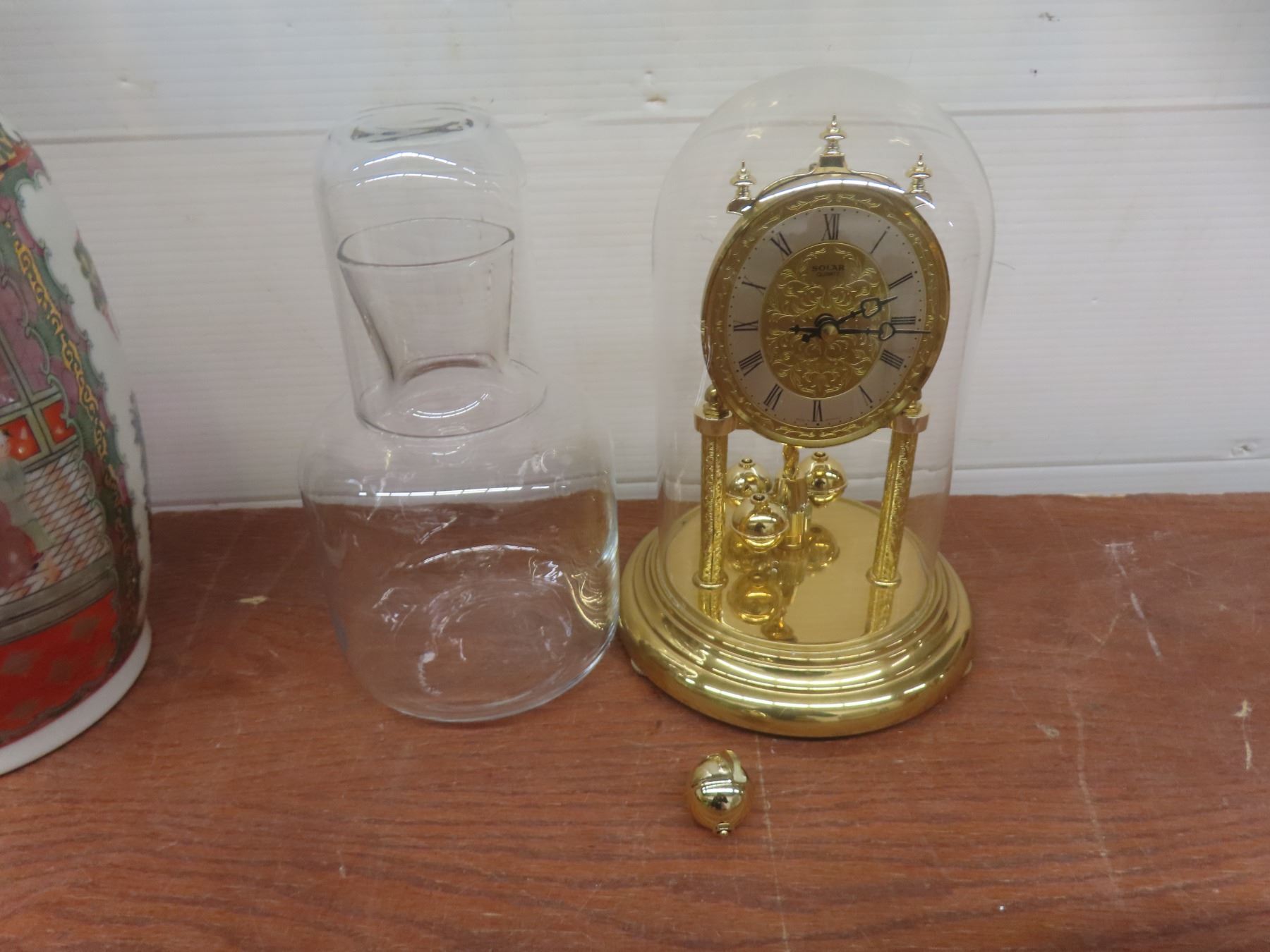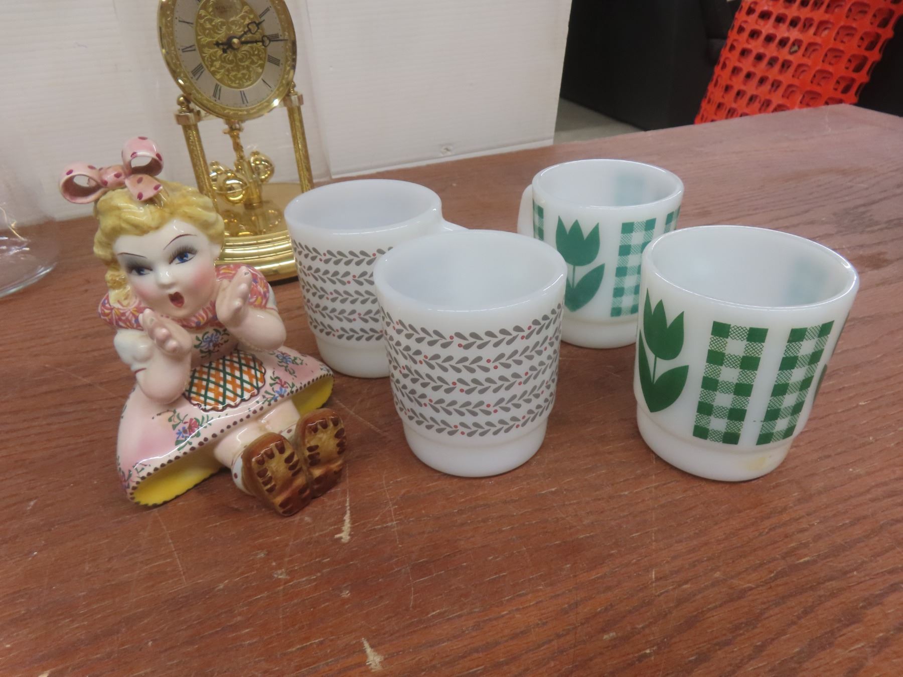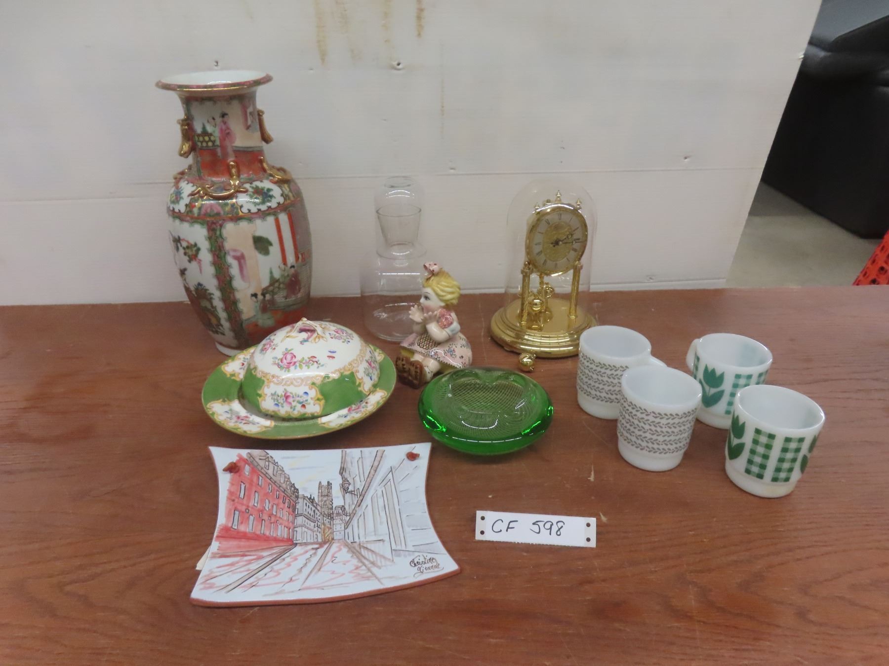 Lot 598 Art Glass Ashtray, Covered China Butter Dish, 4 Coffee Mugs, Vase, Figurine, Anniversary Clock With