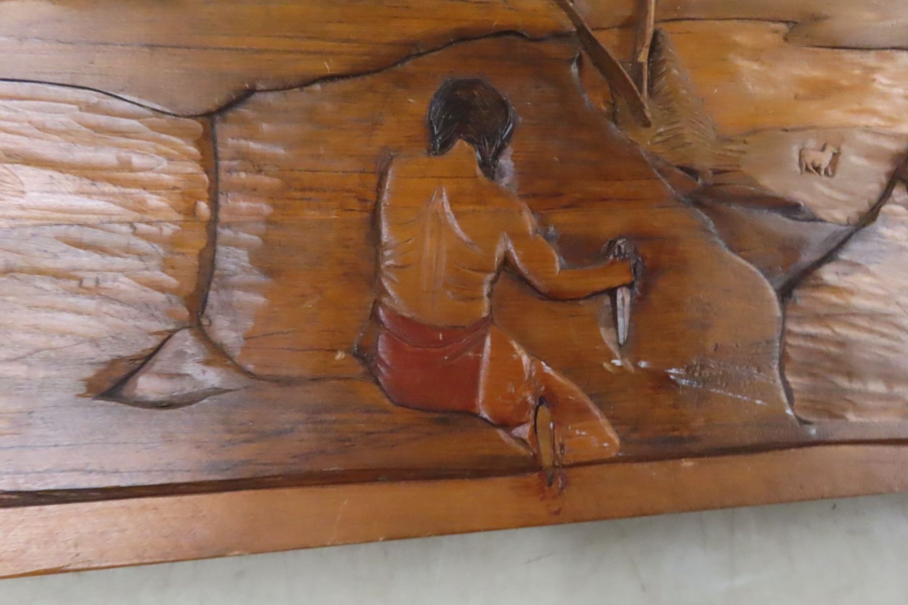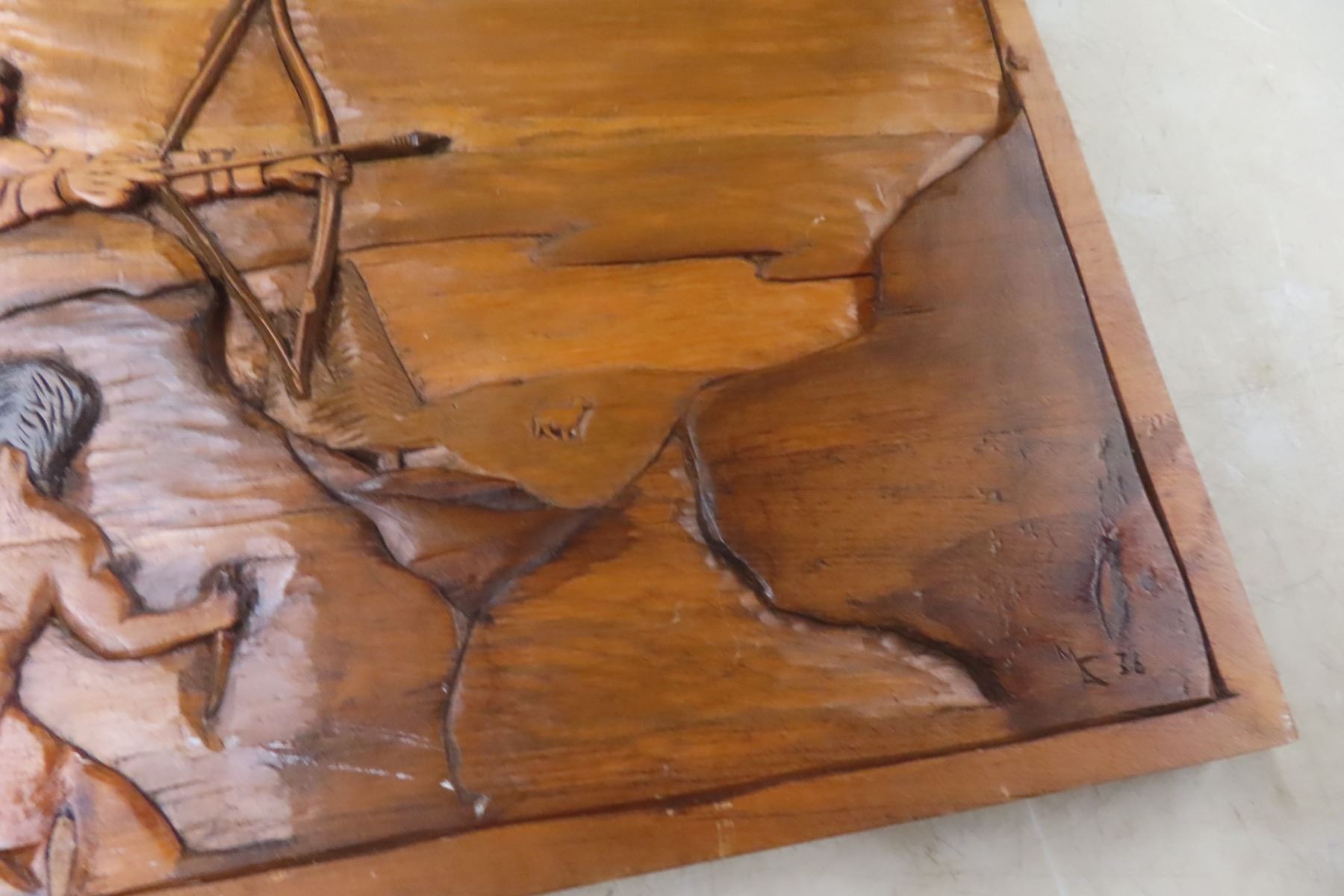 Native Indigenous Wooden Carving of Hunters by Murray Courchene, Finished by Lillian Fontaine, 17" x 25"