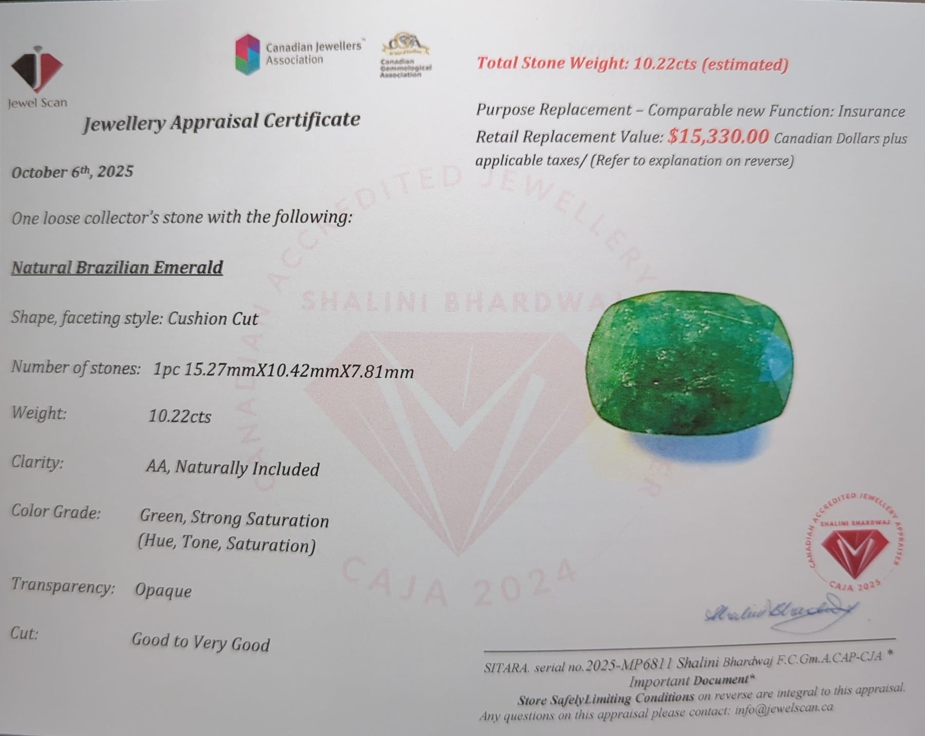 10.22 ct Certified Brazilian Emerald gemstone ($15,330 Appraisal)