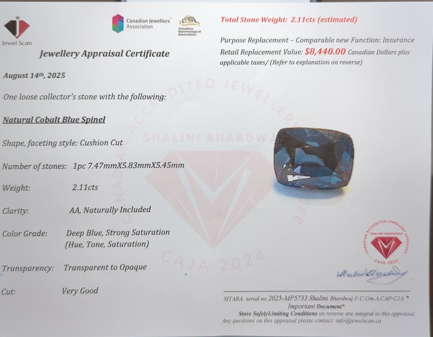 Lot 804B 2.11 ct Certified Cobalt Blue Spinel gemstone ($8,440 Appraisal)