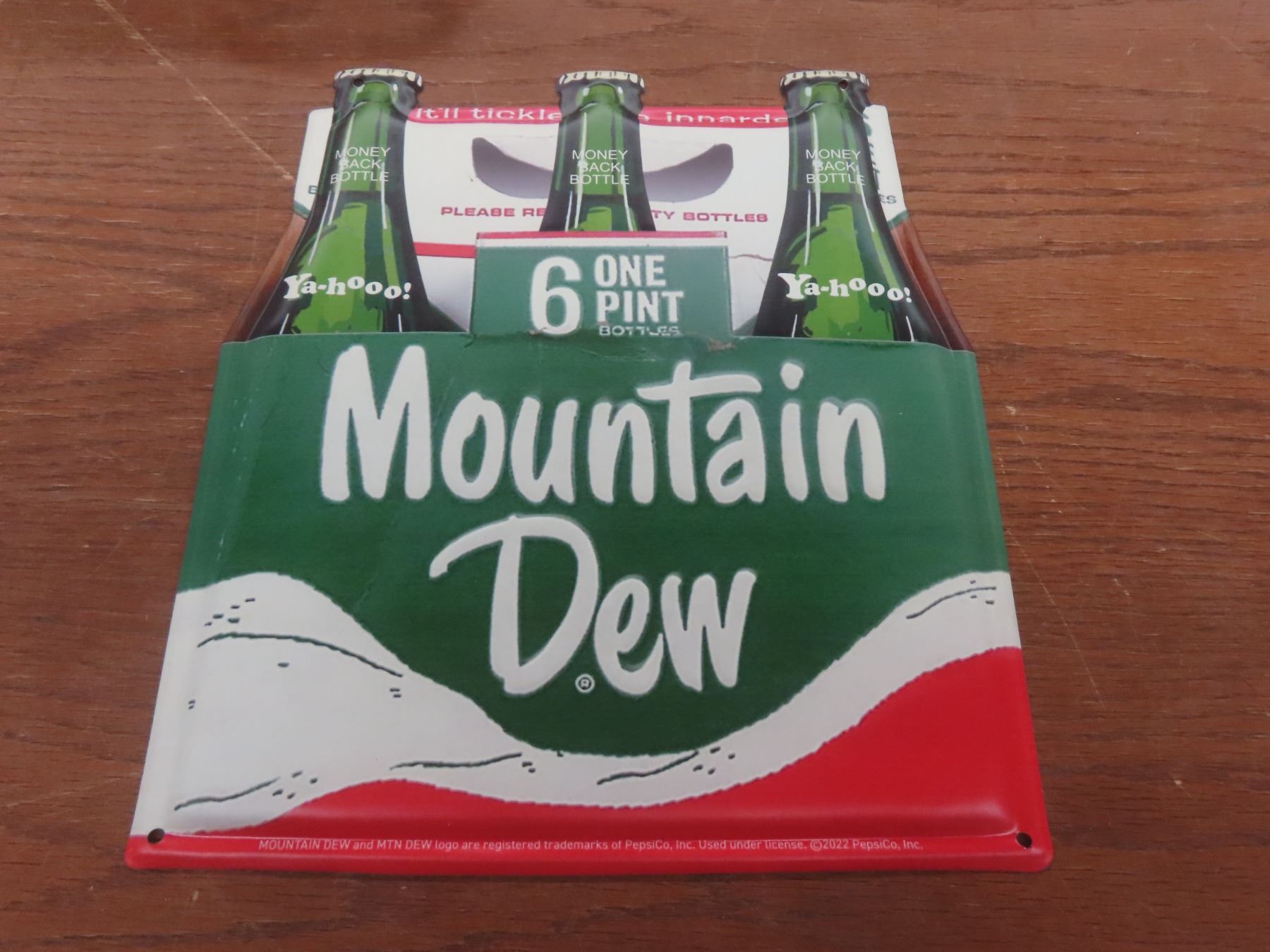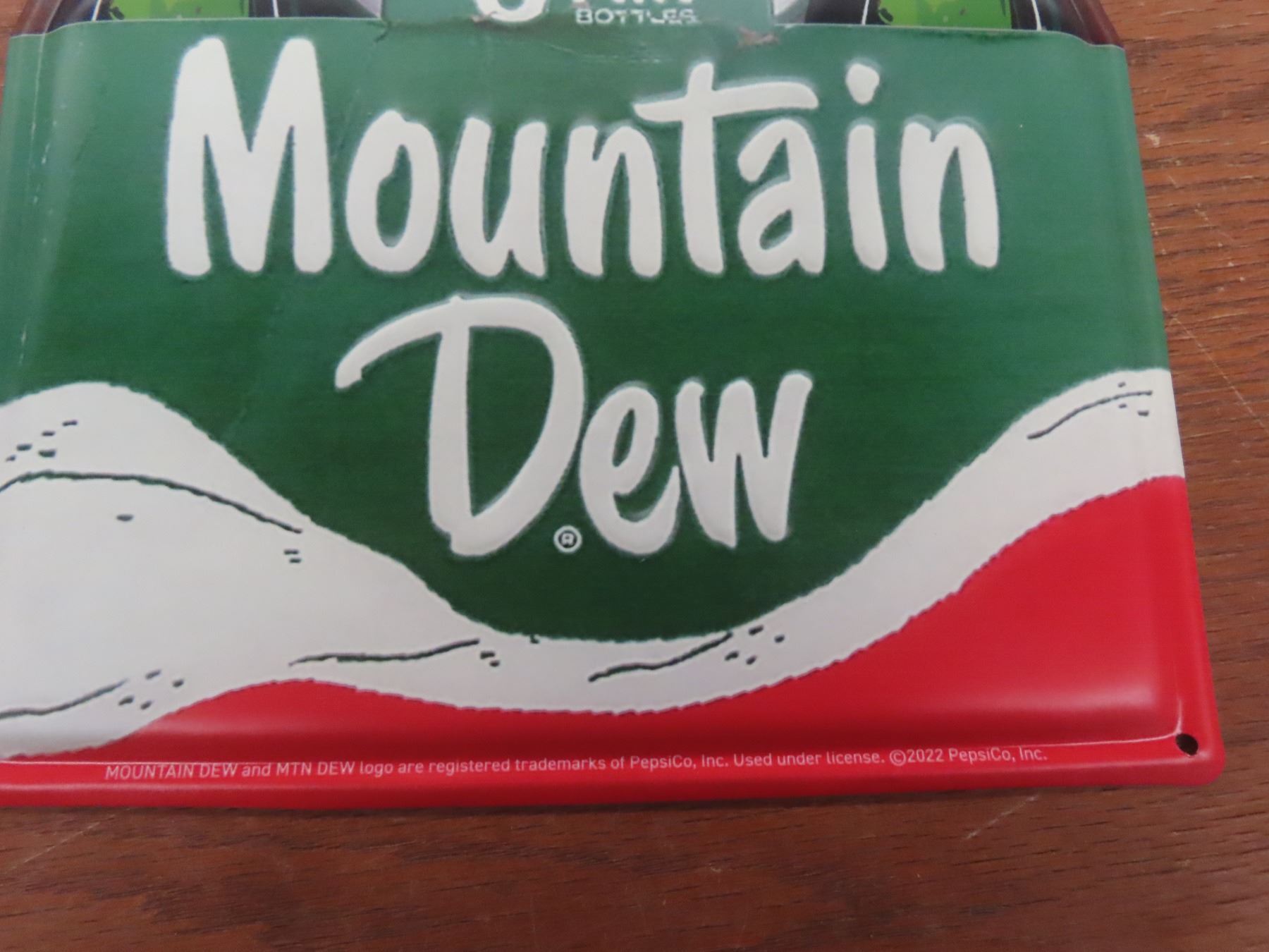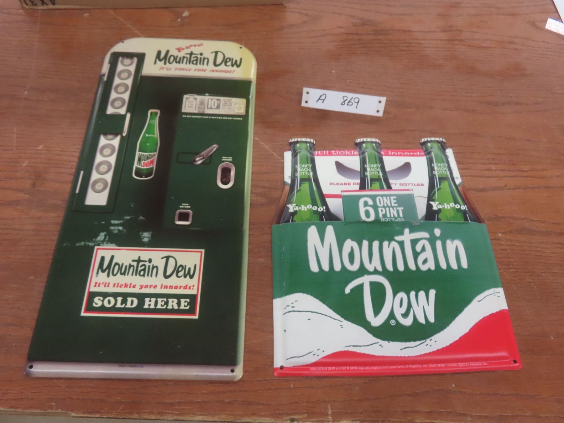 Lot 869 2 Modern Metal Mountain Dew Signs 18" x 8 1/2" and 11" x 10"