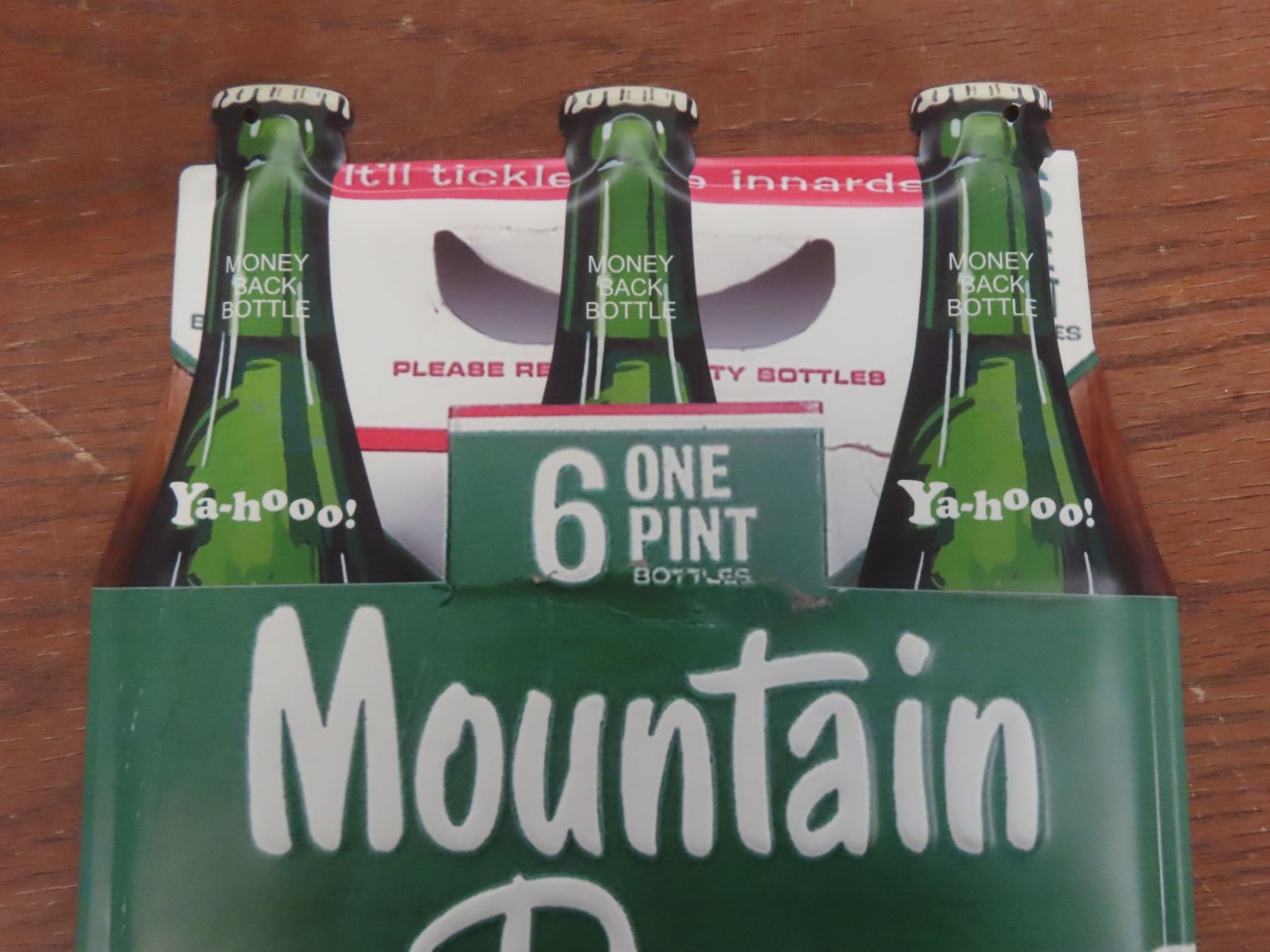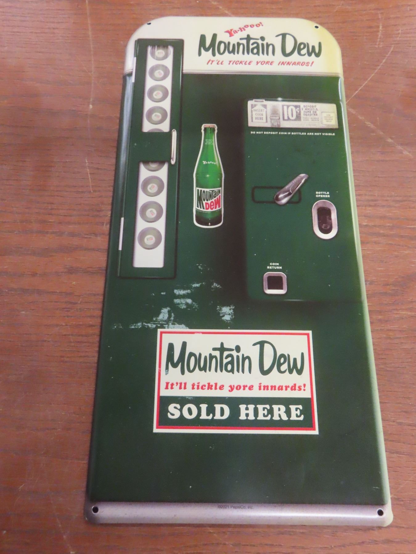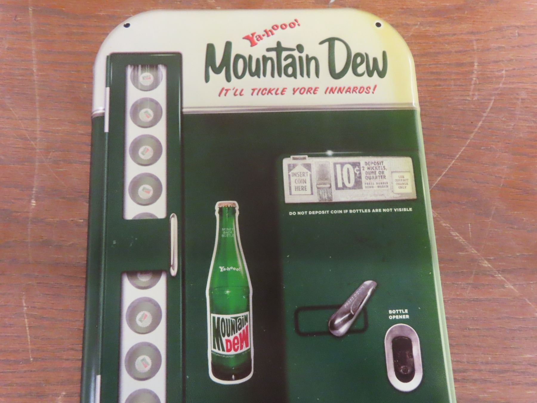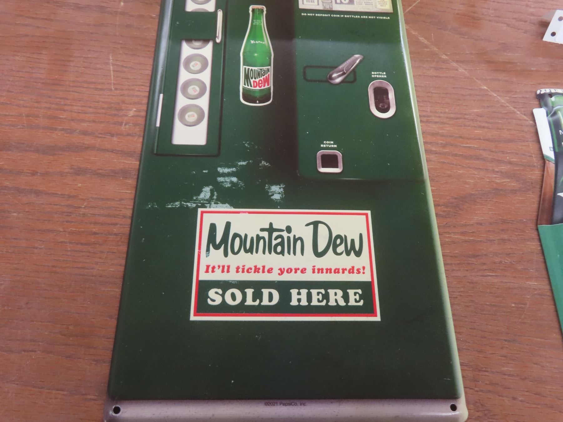 Lot 869 2 Modern Metal Mountain Dew Signs 18" x 8 1/2" and 11" x 10"