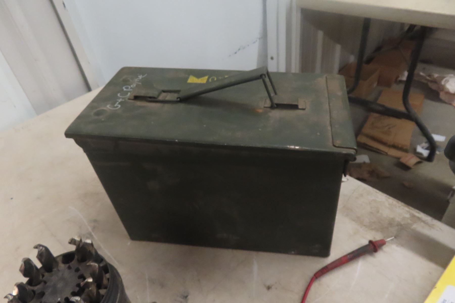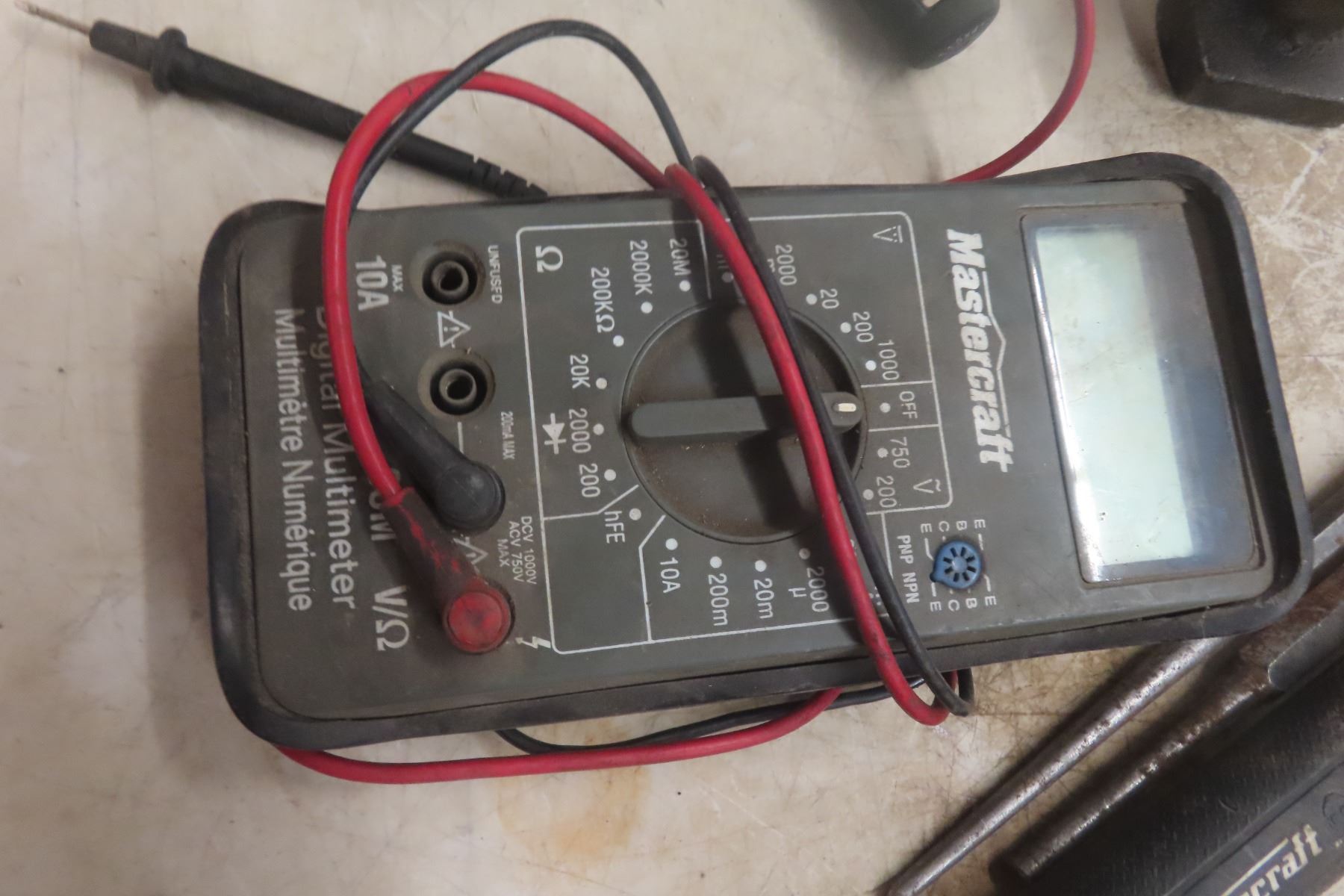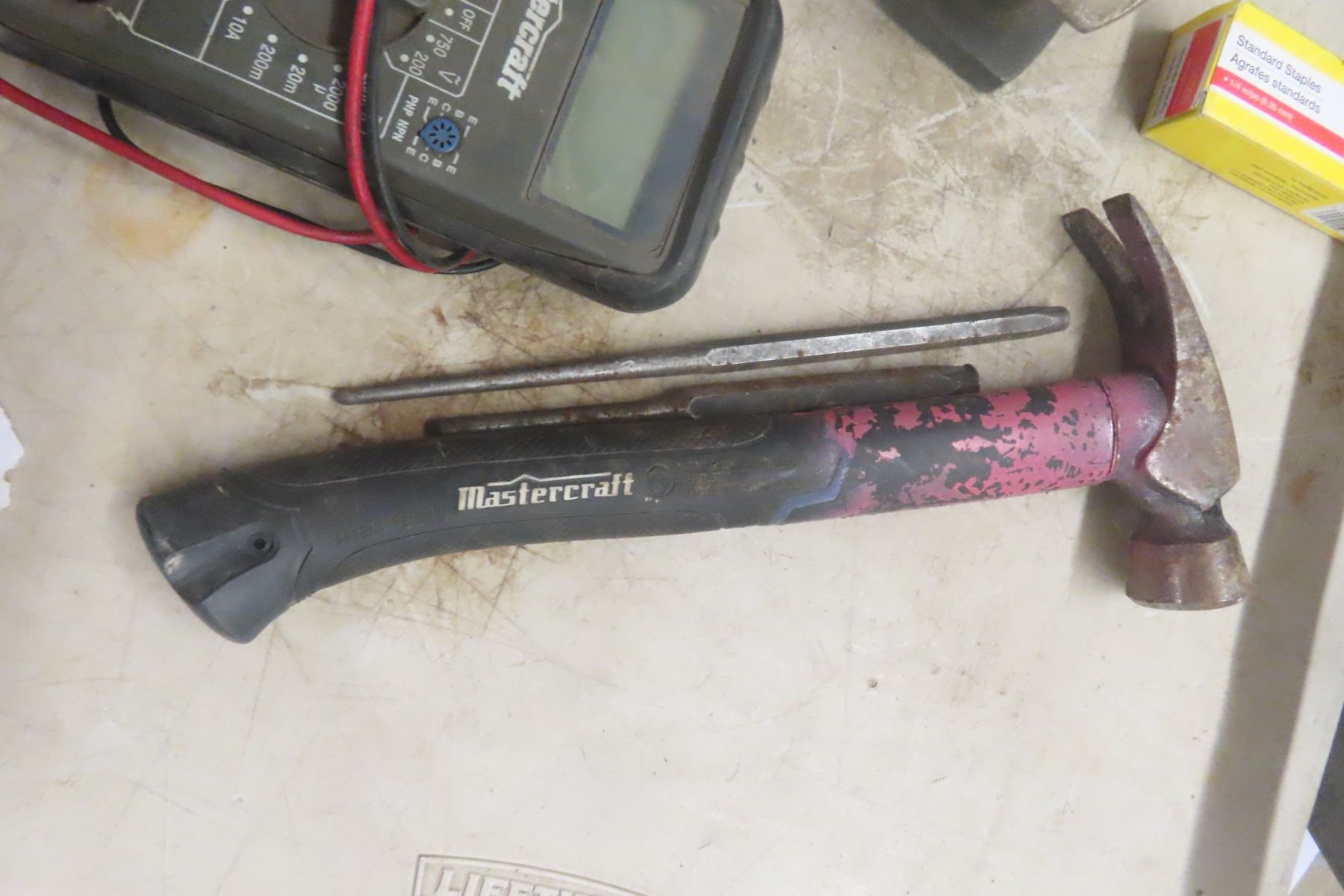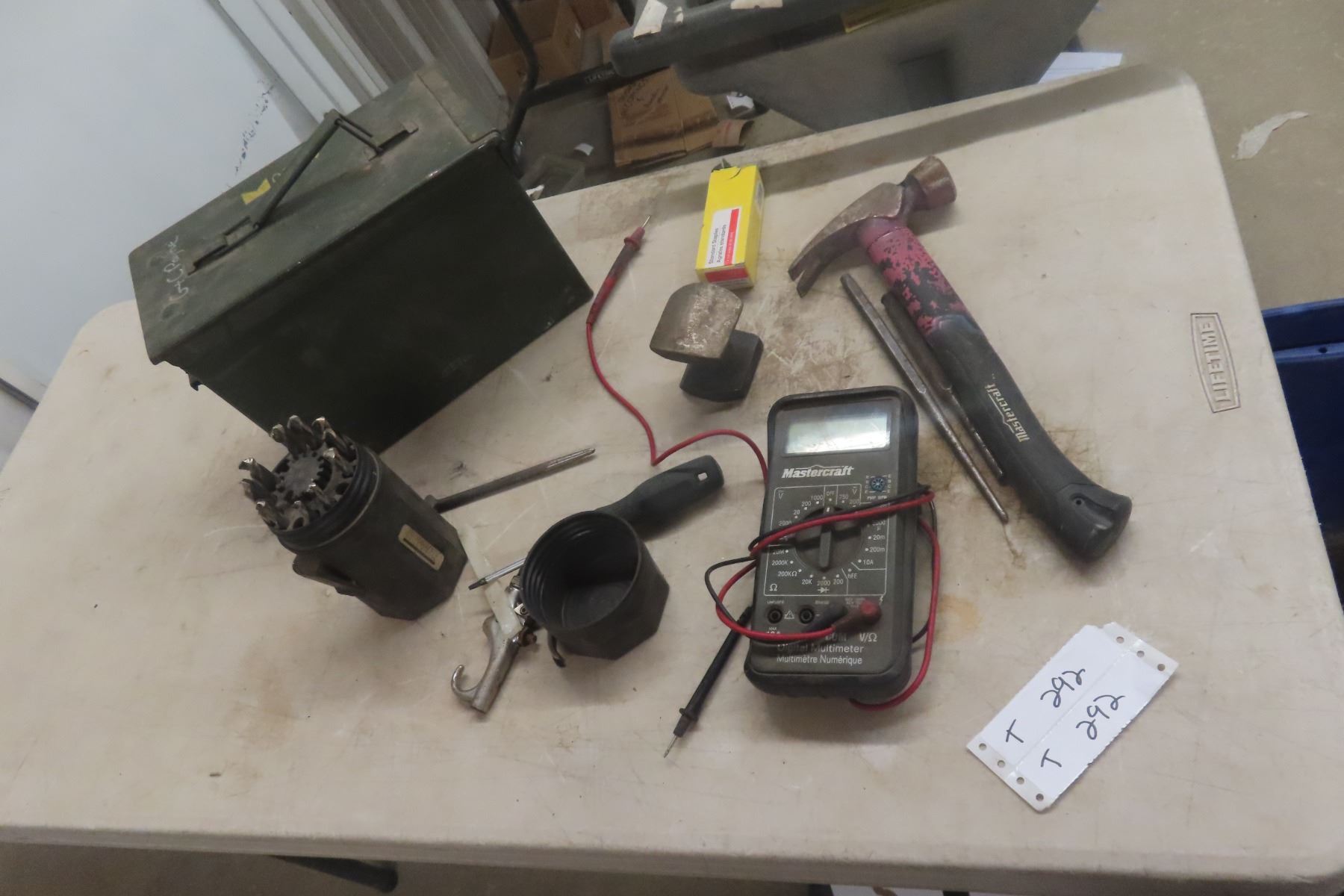 Lot 292 Mastercraft Digital Multimeter, Framing Hammer, Wedge Drill Bit, Metal Ammo Box