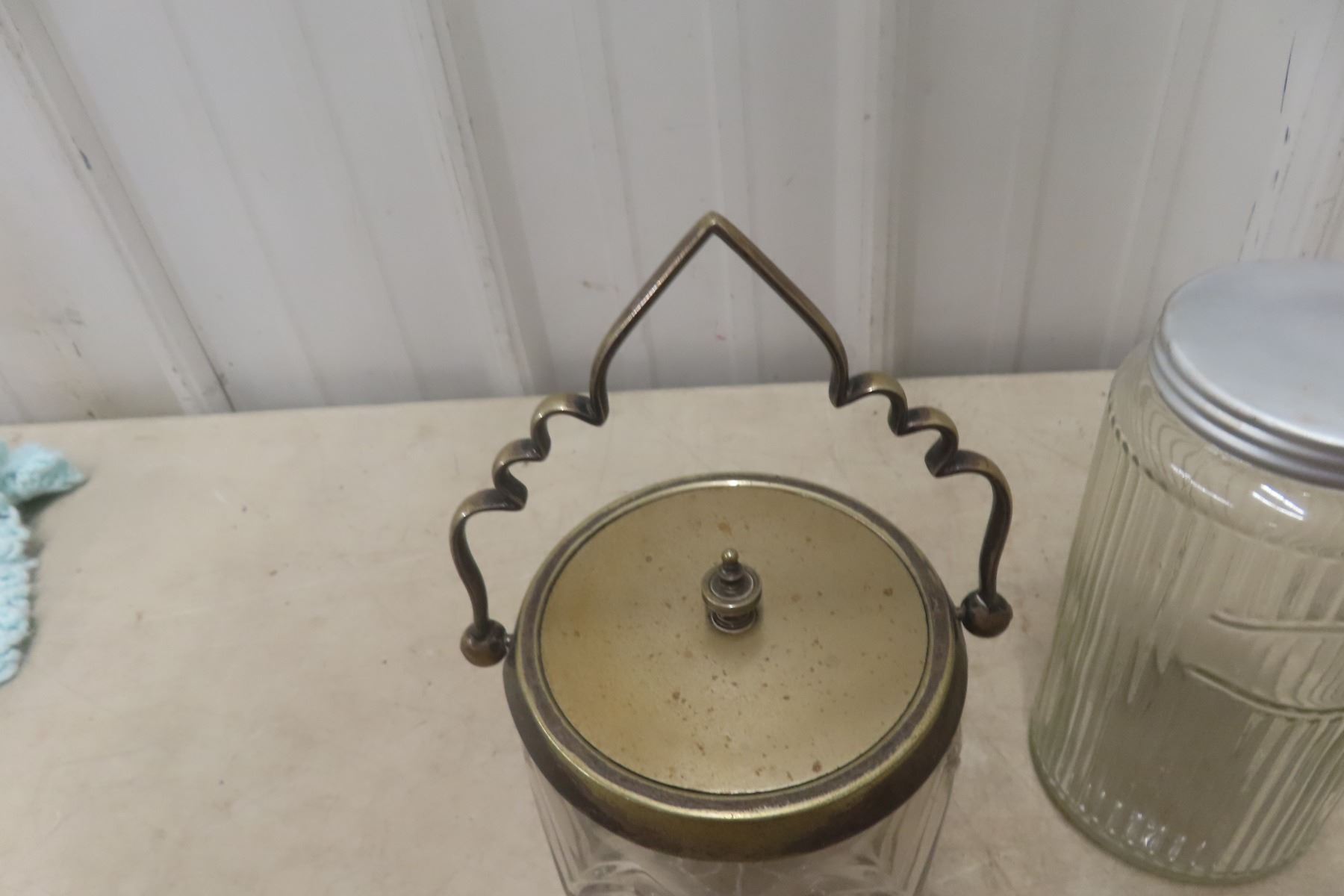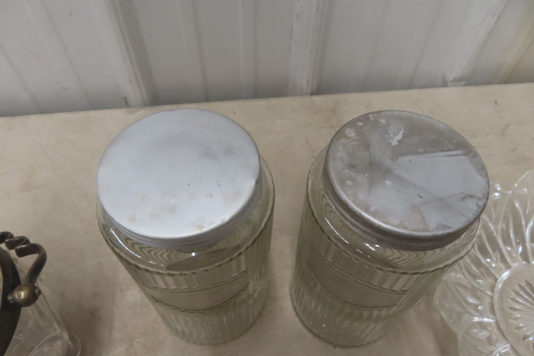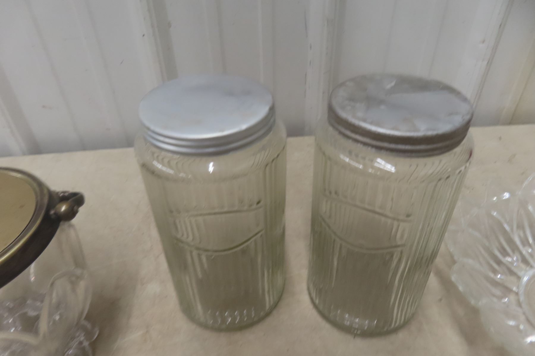 2 Housing Canister Biscuit Tins and 3 Cut Glass Bowls