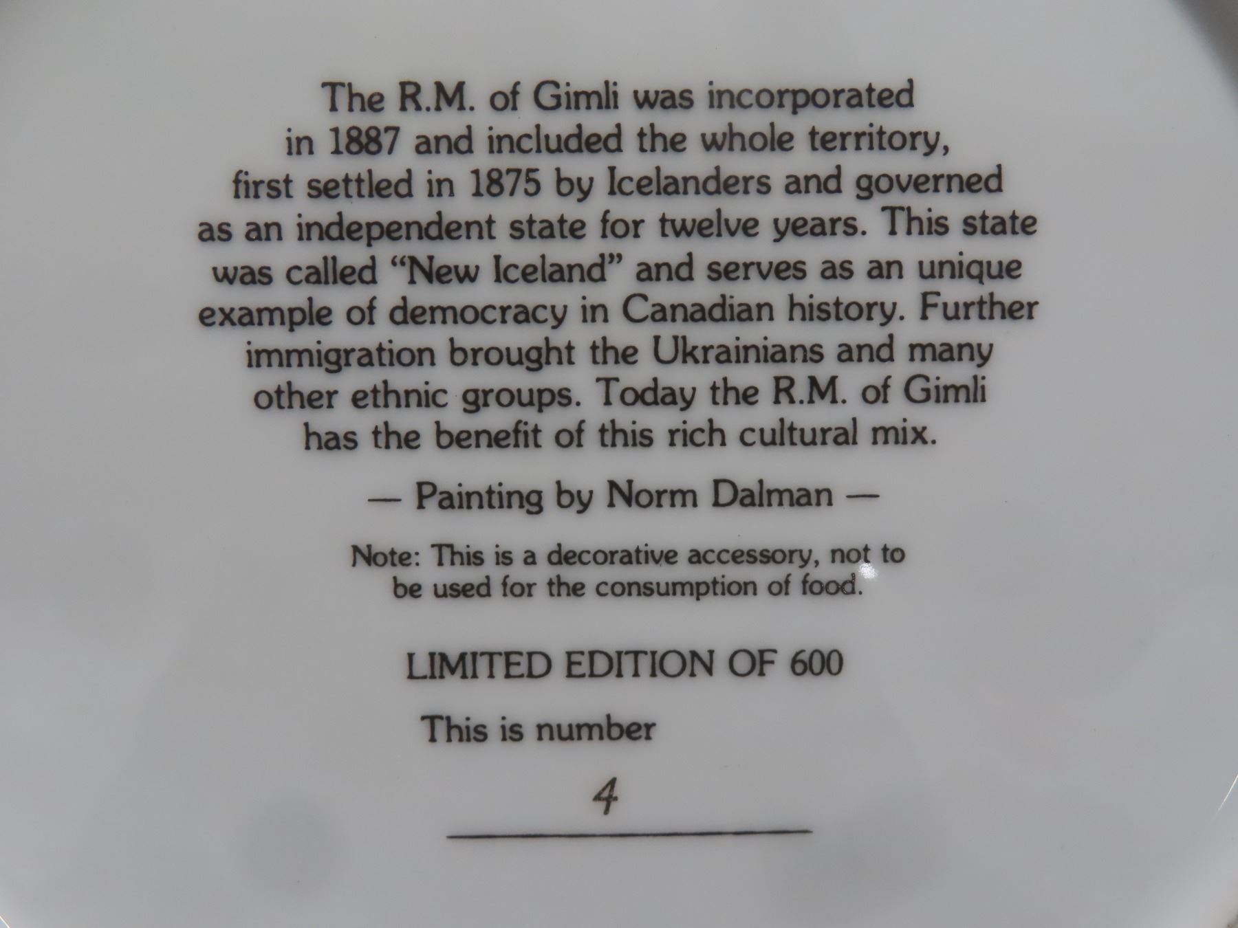 Lot 345 PM of Gimli 1887–1987 Collector Plate and Laser Cut Horse Design, 16" x 16"