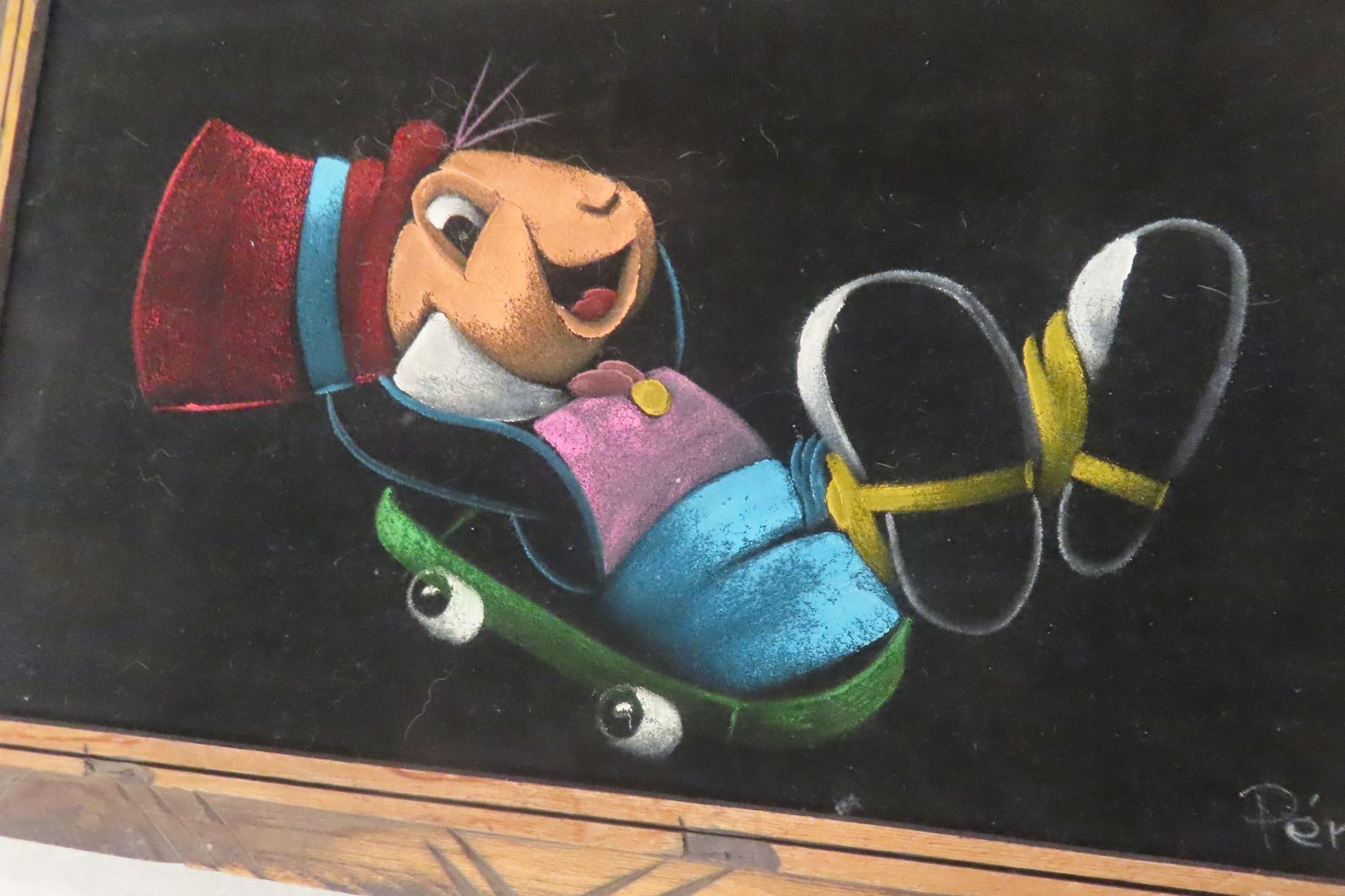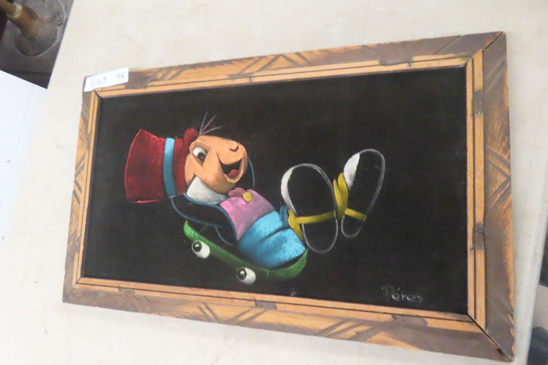 Lot 699 Jiminy Cricket Black Velvet Painting by Perez, Framed, 14" x 23"